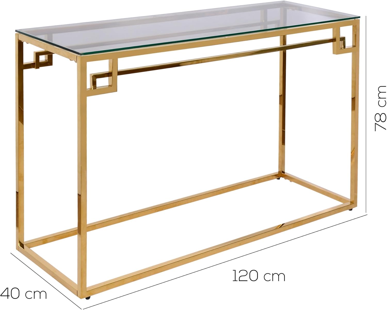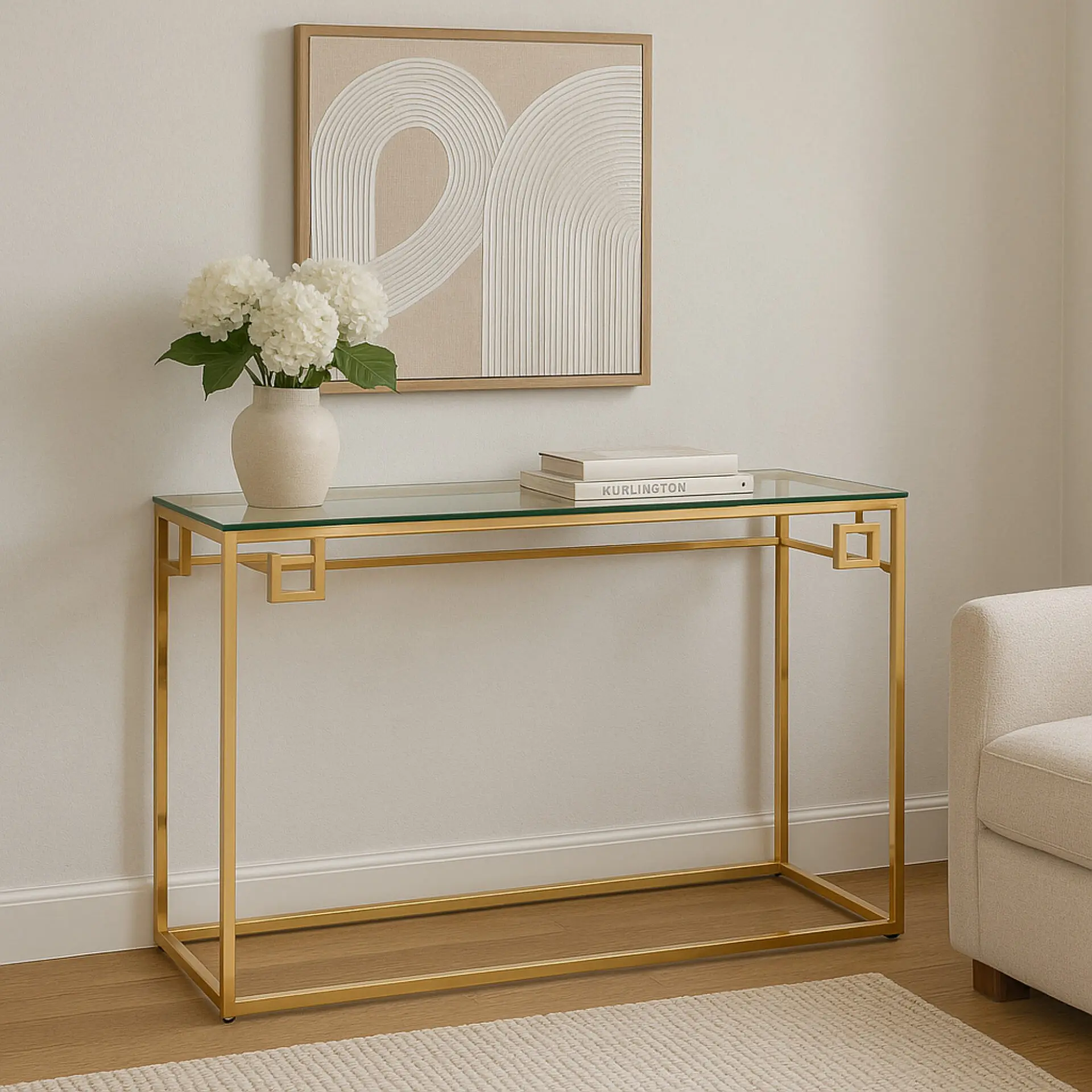 Console elegante con struttura in metallo dorato e piano in vetro, ideale per ingresso e soggiorno, perfetta per ambienti moderni e classici.