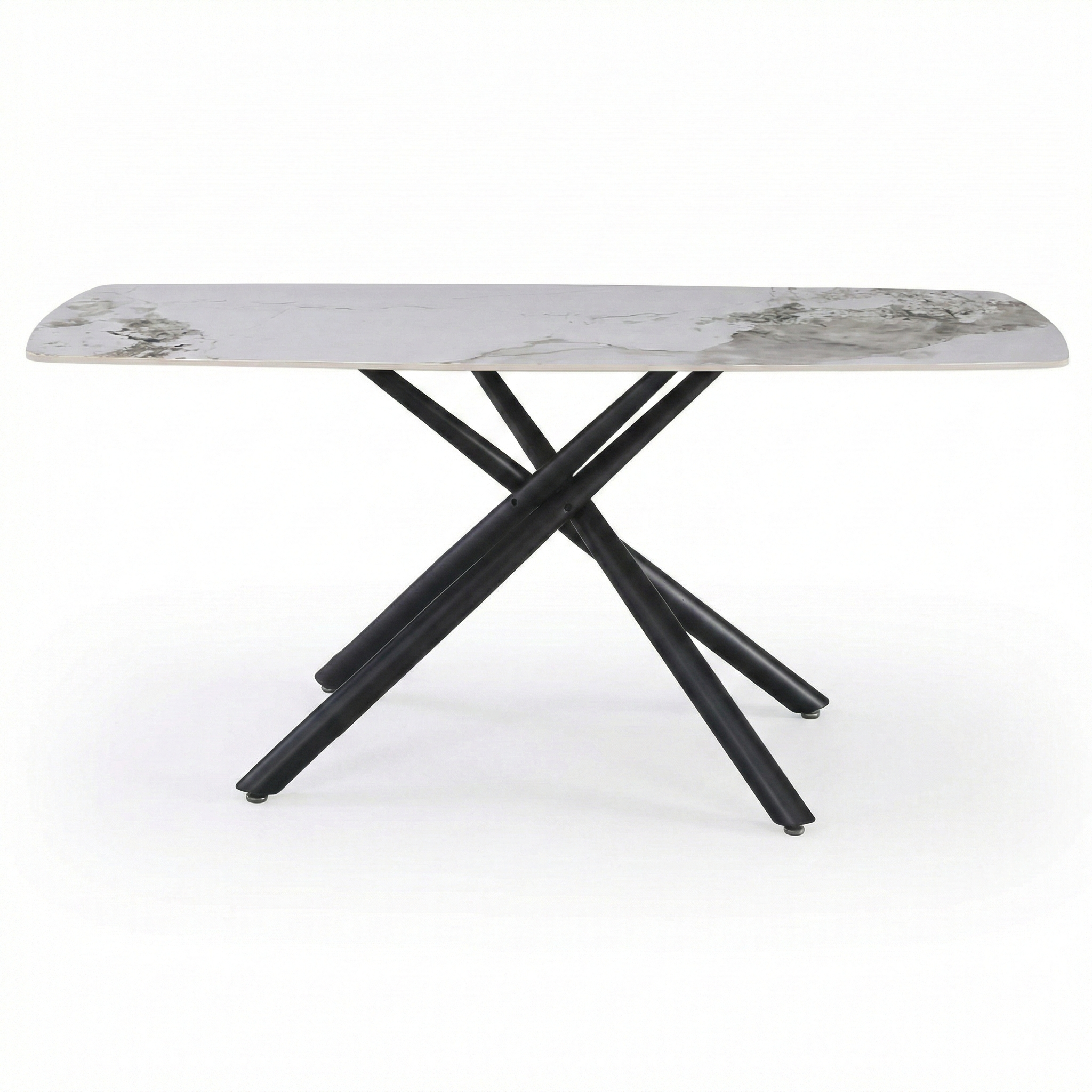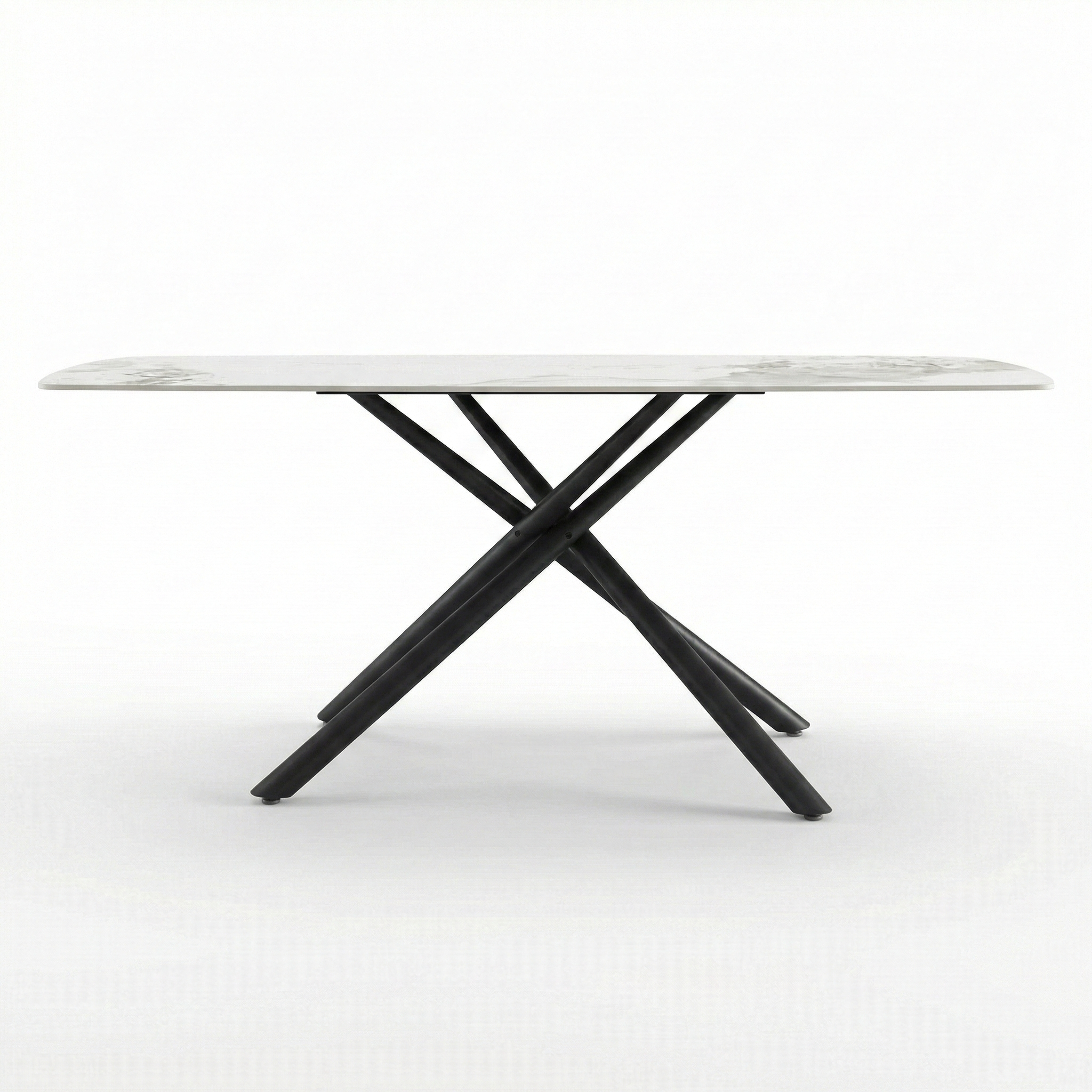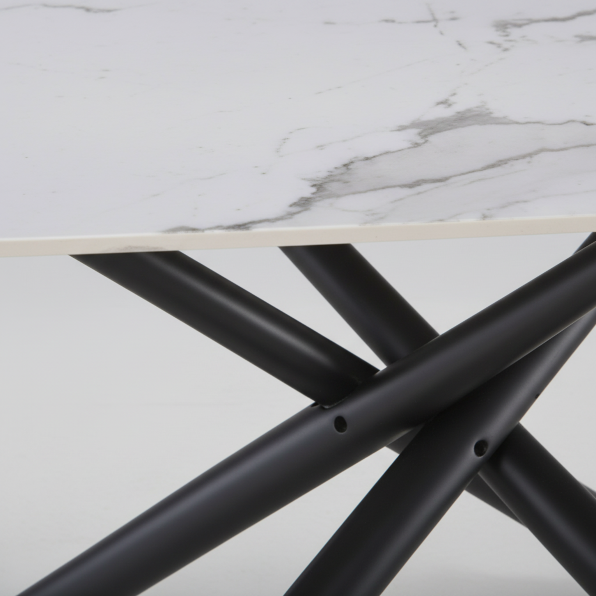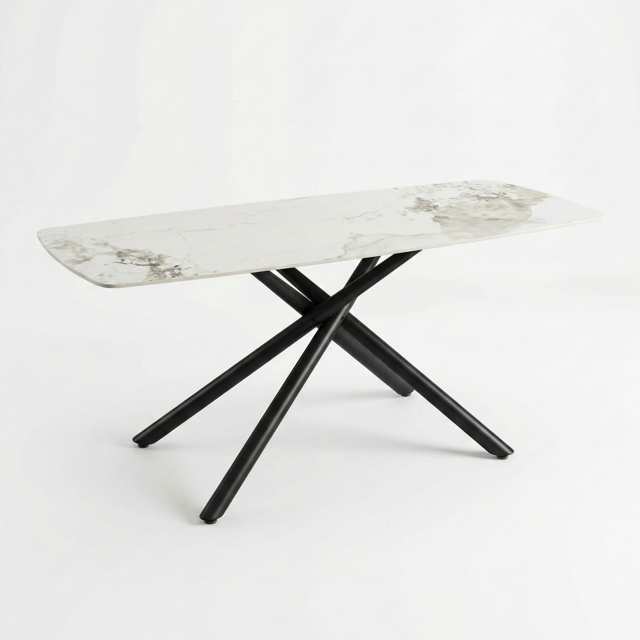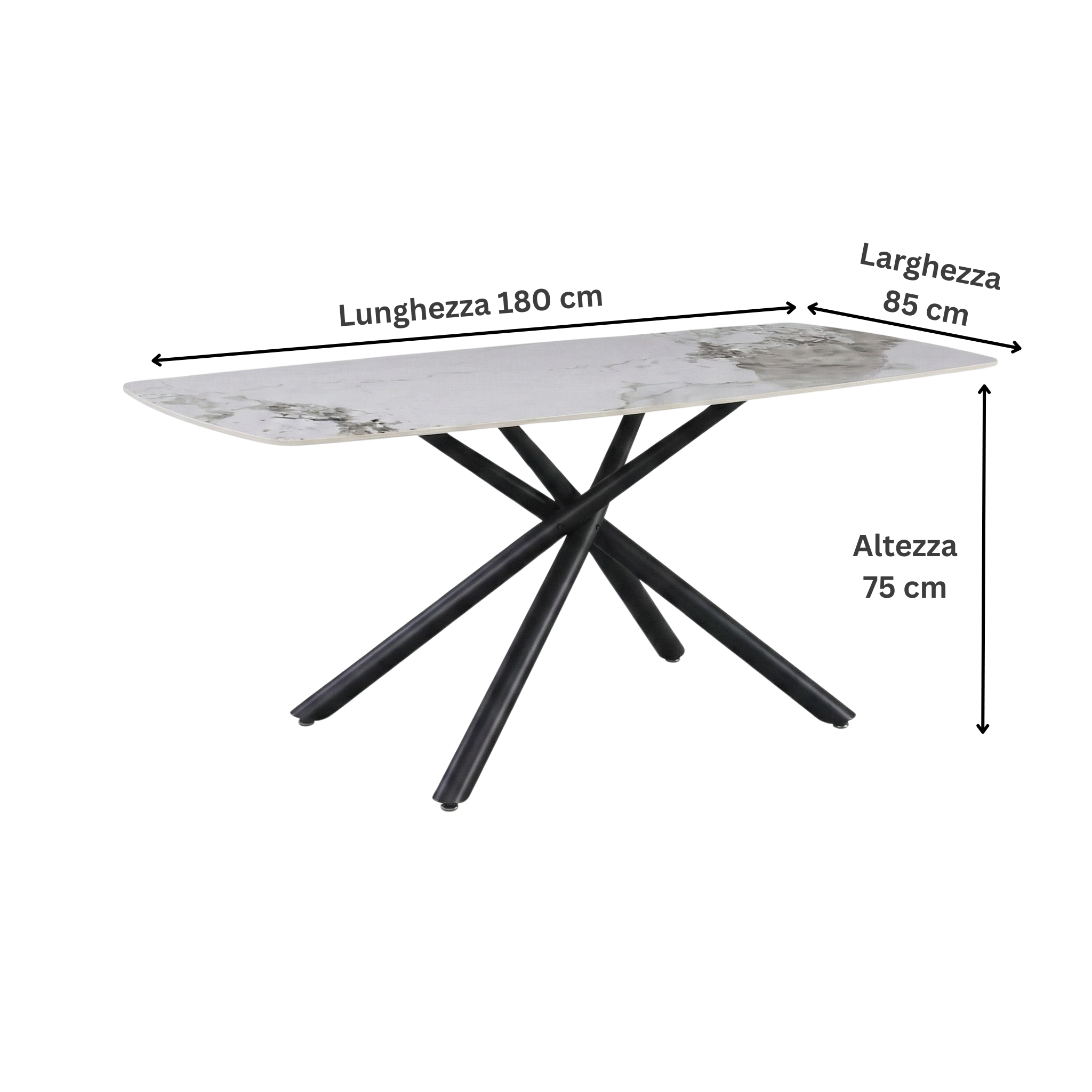 Il Cribel Aura è un tavolo fisso dal design contemporaneo e di forte impatto estetico, ideale per living moderni e zone pranzo eleganti. Il piano rettangolare in gres porcellanato lucido con venature grigie dona raffinatezza e luminosità, mentre la base in metallo verniciato nero opaco, con gambe incrociate e dinamiche, crea un effetto scultoreo che valorizza ogni ambiente. Versatile e funzionale, il tavolo può ospitare comodamente da 6 fino a 8 persone, combinando stile e praticità in un unico elemento.
