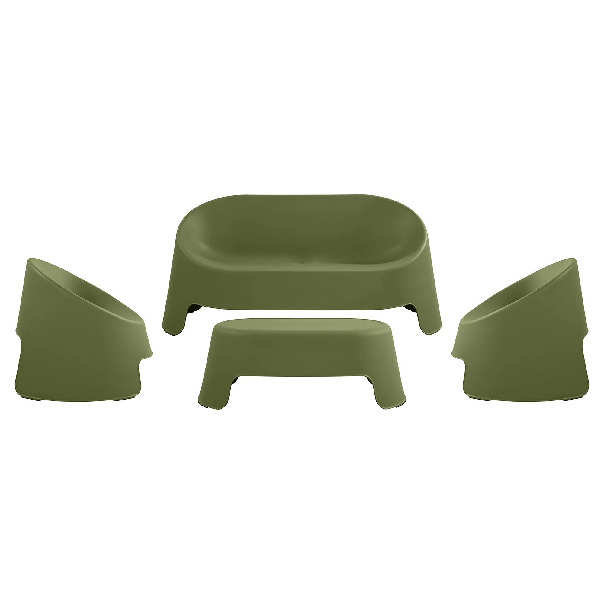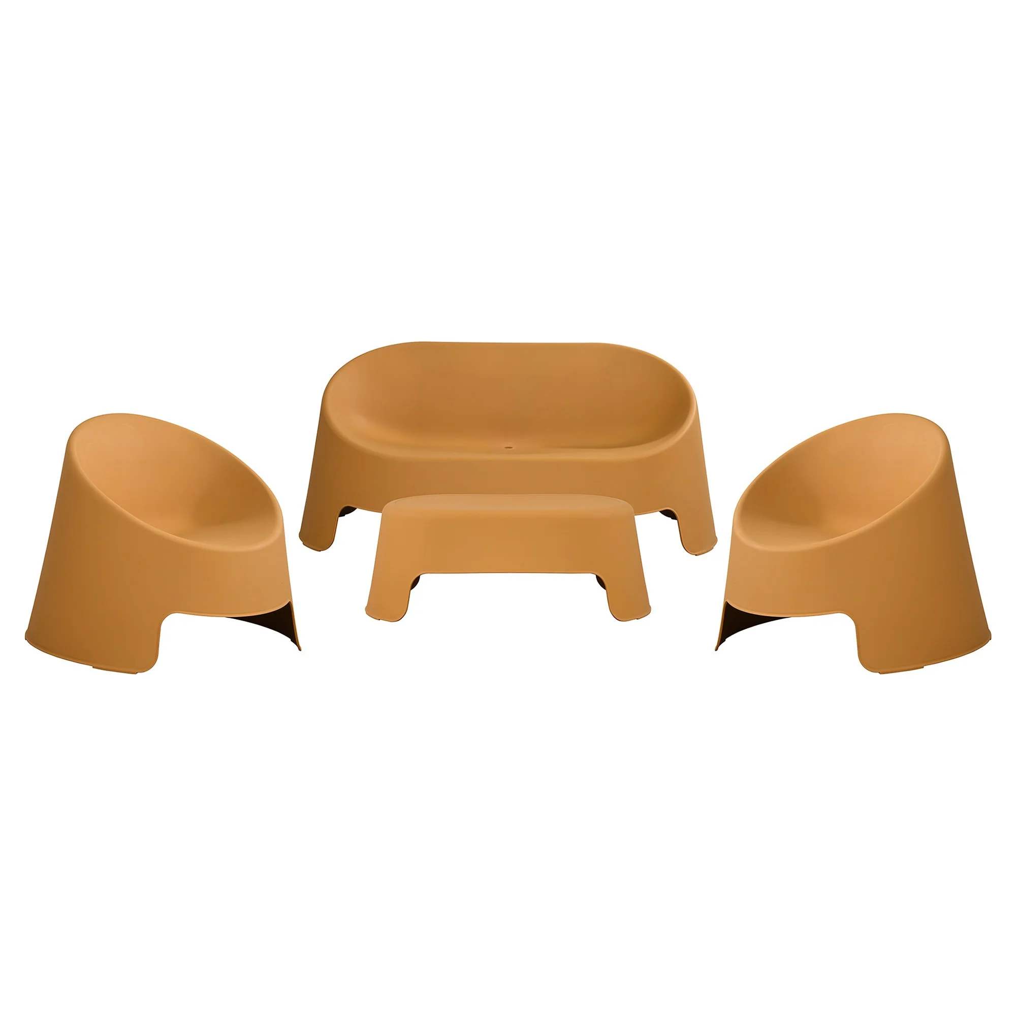 Moderno set di sedute da esterno realizzato in polipropilene resistente, progettato per garantire comfort, facile manutenzione e lunga durata all’esterno.