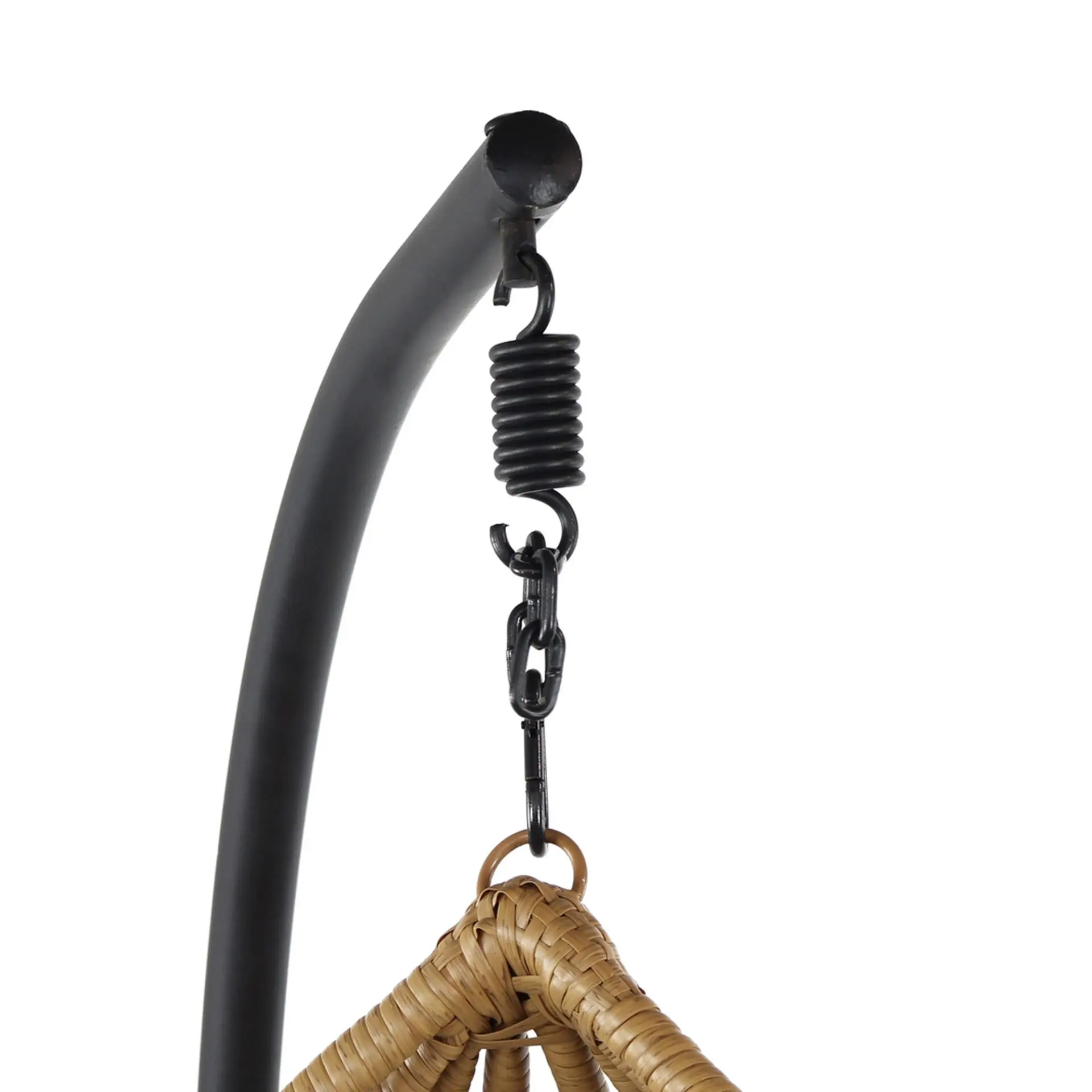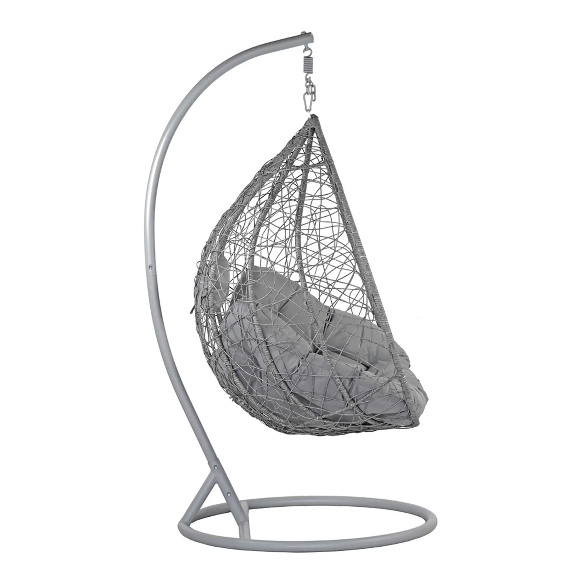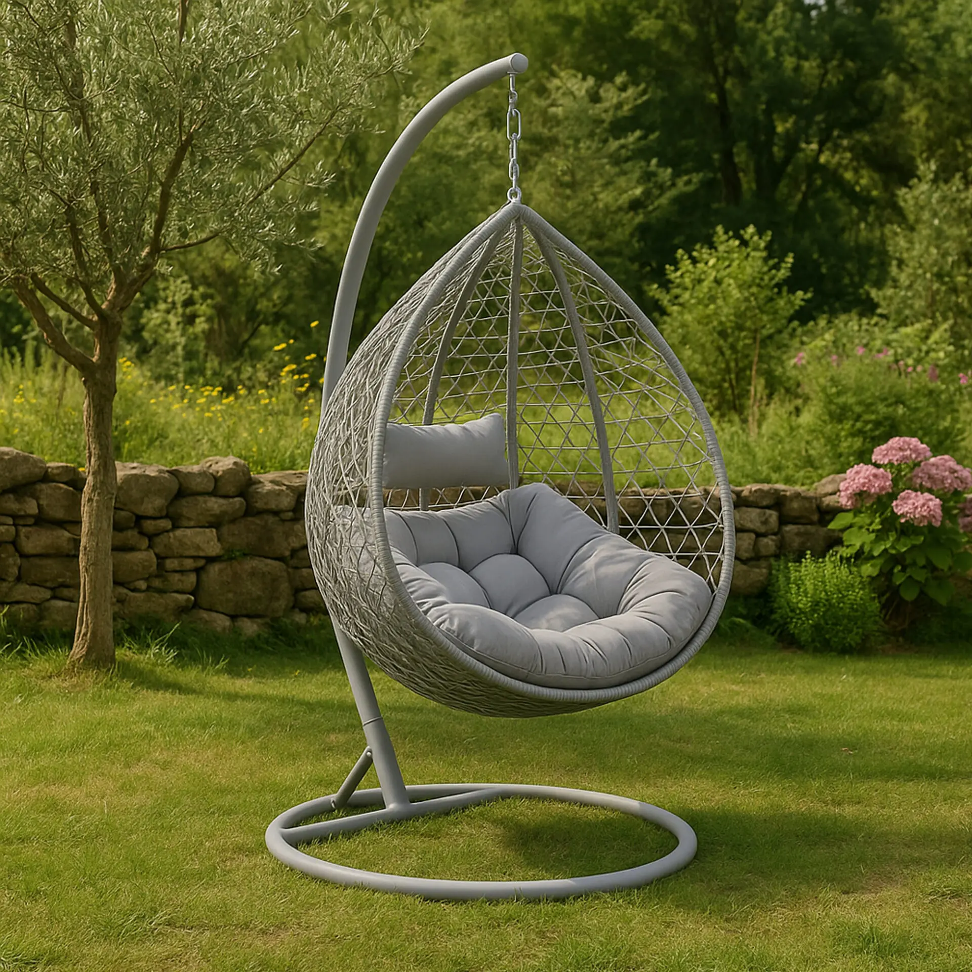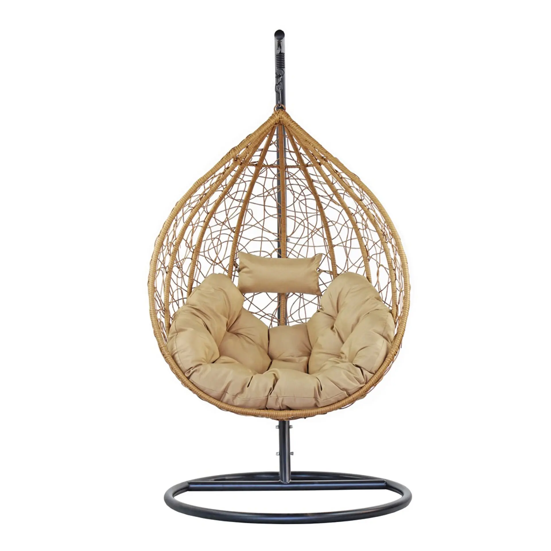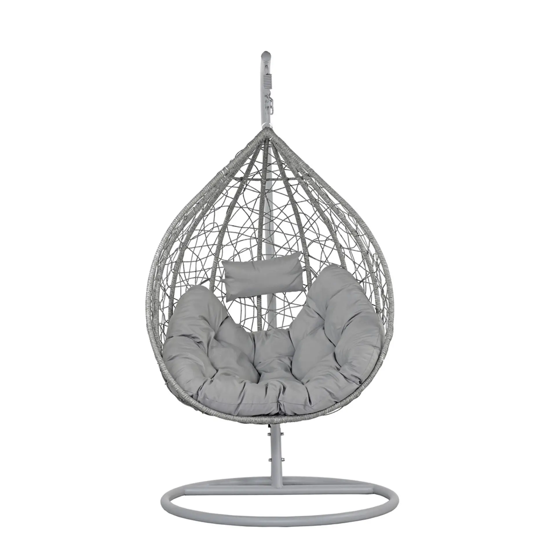 La Cribel Kona è una poltrona sospesa a uovo dal design leggero e avvolgente, perfetta per momenti di relax sia indoor che outdoor. La struttura è realizzata con un intreccio fitto e irregolare effetto rattan, sostenuto da un telaio interno che garantisce stabilità e forma. La seduta ampia e accogliente è completata da cuscini morbidi e generosi, incluso un piccolo poggiatesta per un comfort extra. Autoportante grazie al supporto in metallo con base circolare ampia, permette un’oscillazione fluida e rilassante, unendo stile e funzionalità.