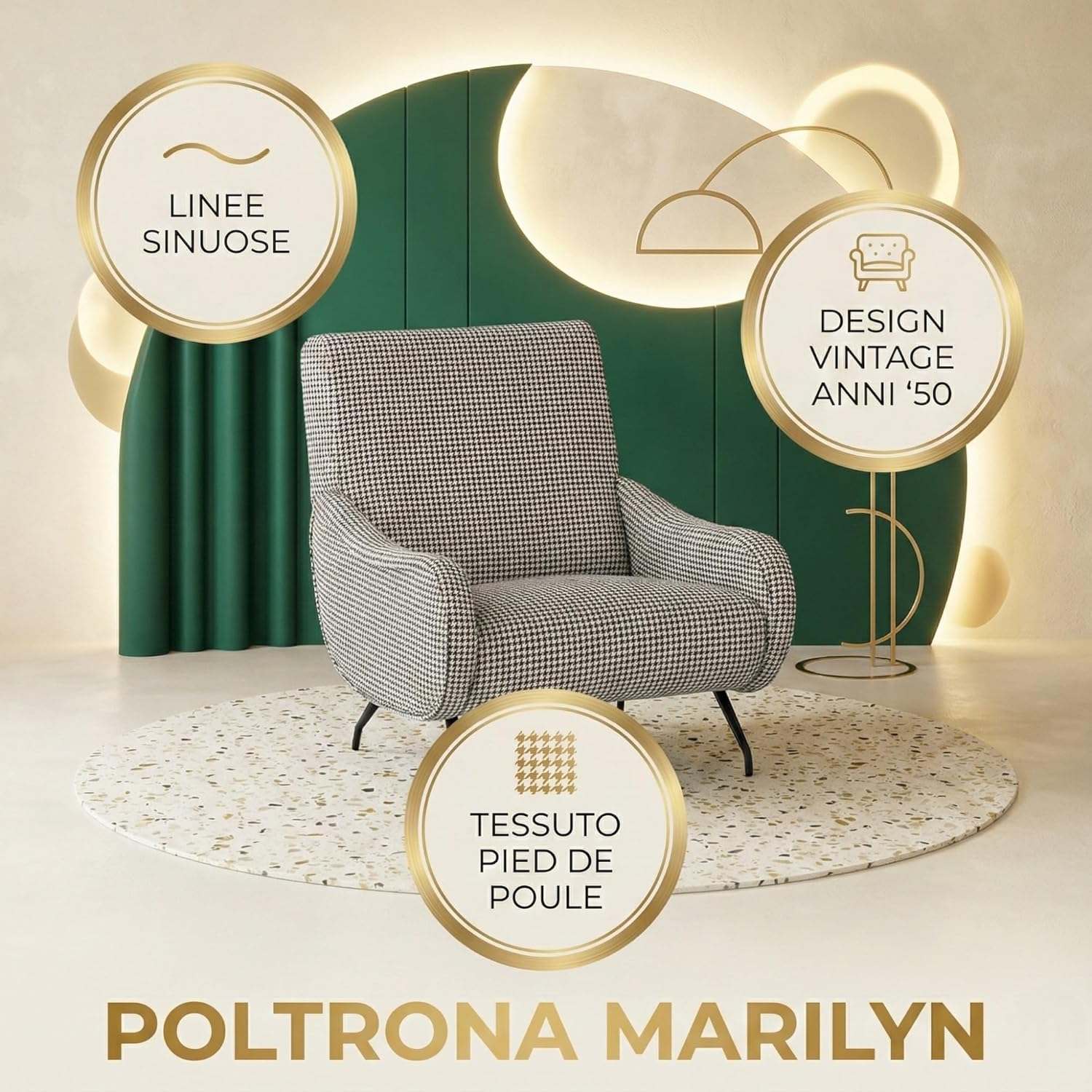 La poltrona Cribel Marilyn, con il suo distintivo rivestimento in tessuto Pied de Poule bianco e nero, rappresenta un elemento d’arredo che unisce eleganza classica e un tocco di modernità audace. Questo pezzo è stato concepito per diventare il fulcro di qualsiasi ambiente, dal salotto contemporaneo all’ufficio raffinato, offrendo non solo una seduta confortevole ma anche un’affermazione di stile inconfondibile. La scelta del motivo Pied de Poule, intramontabile icona di moda e design, conferisce alla poltrona un carattere sofisticato e versatile, capace di integrarsi armoniosamente in diverse palette cromatiche e stili d’arredo. È la soluzione ideale per chi desidera aggiungere un elemento di design che catturi l’attenzione senza rinunciare alla funzionalità e all’estetica curata nei minimi dettagli.