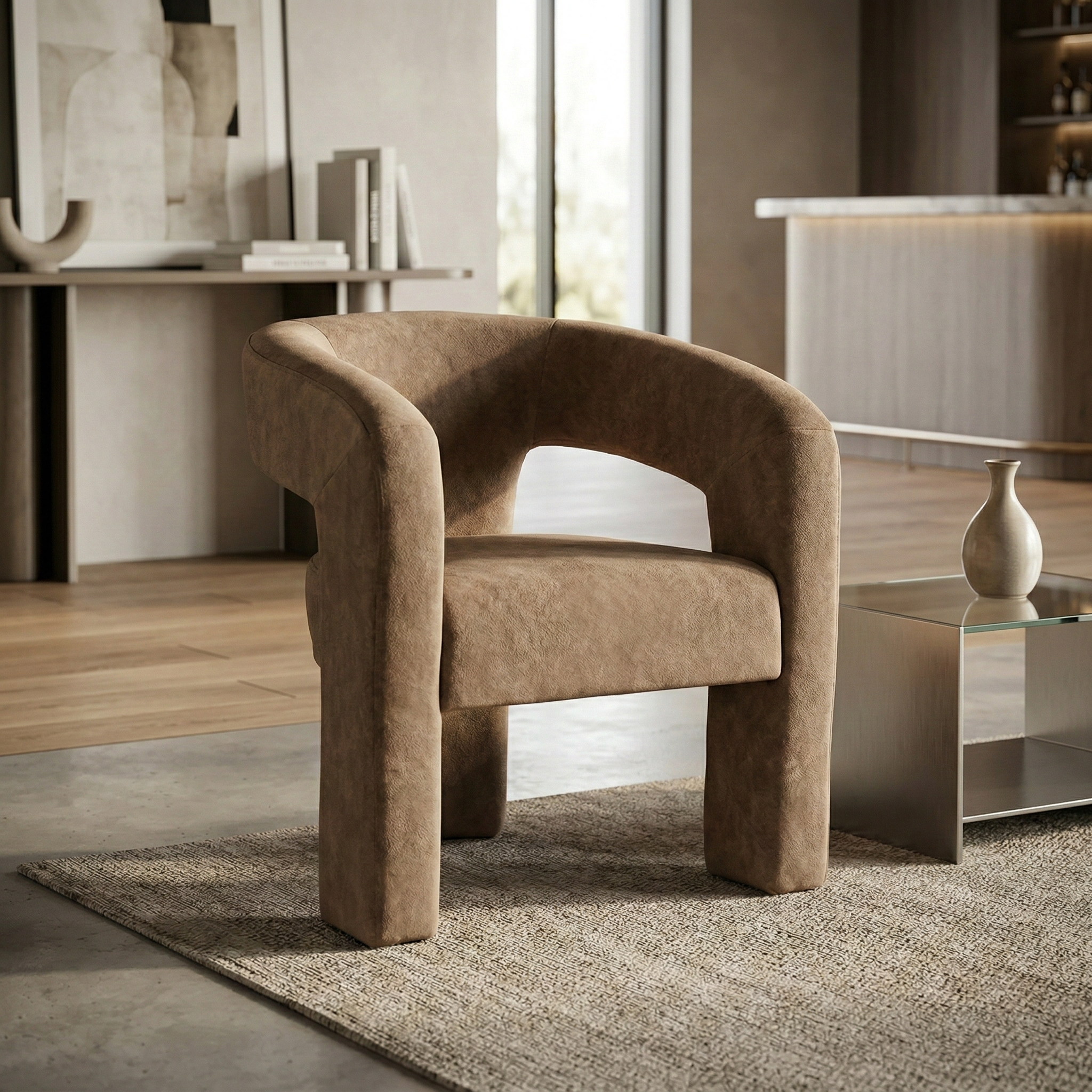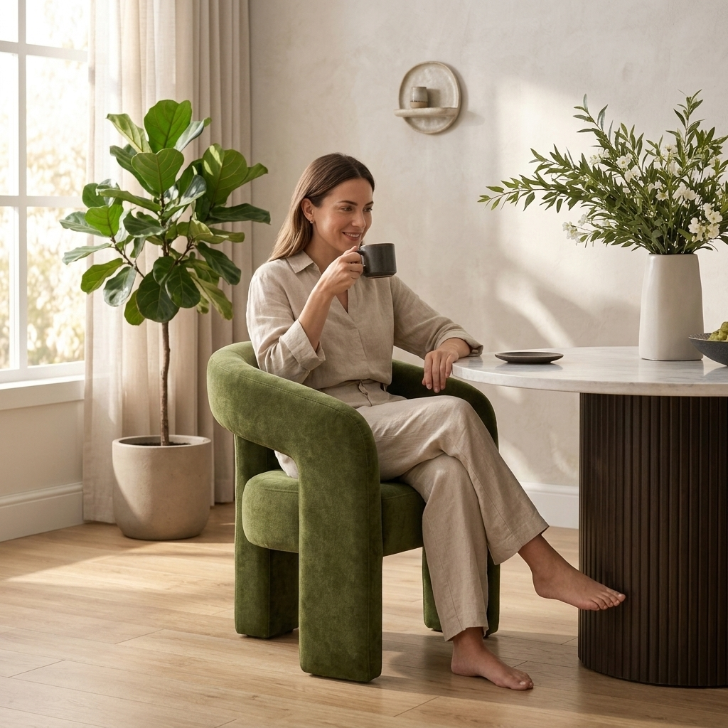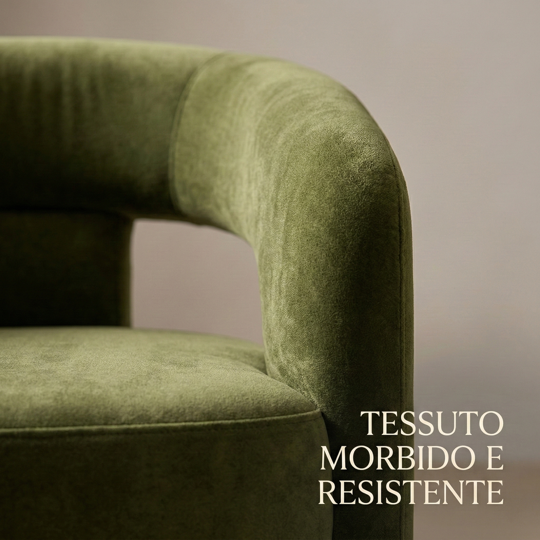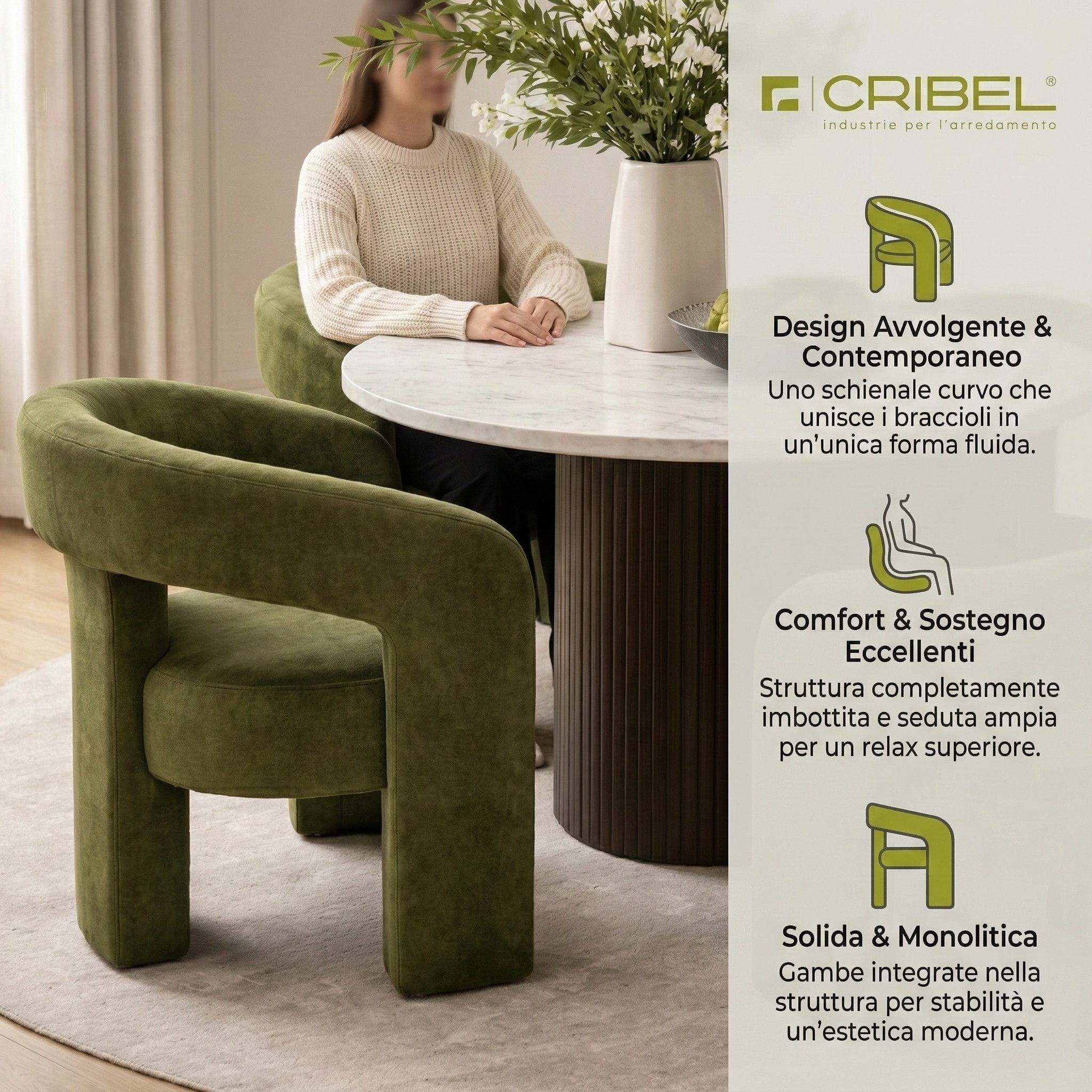 Questa poltrona da pranzo unisce comfort e stile grazie a una struttura completamente imbottita con volumi pieni e continui. Lo schienale curvo si fonde armoniosamente con i braccioli, creando un elemento fluido che sostiene la schiena in modo ottimale. La seduta ampia e accogliente assicura un comfort duraturo, mentre le gambe integrate nella struttura garantiscono solidità e un aspetto elegante e monolitico.