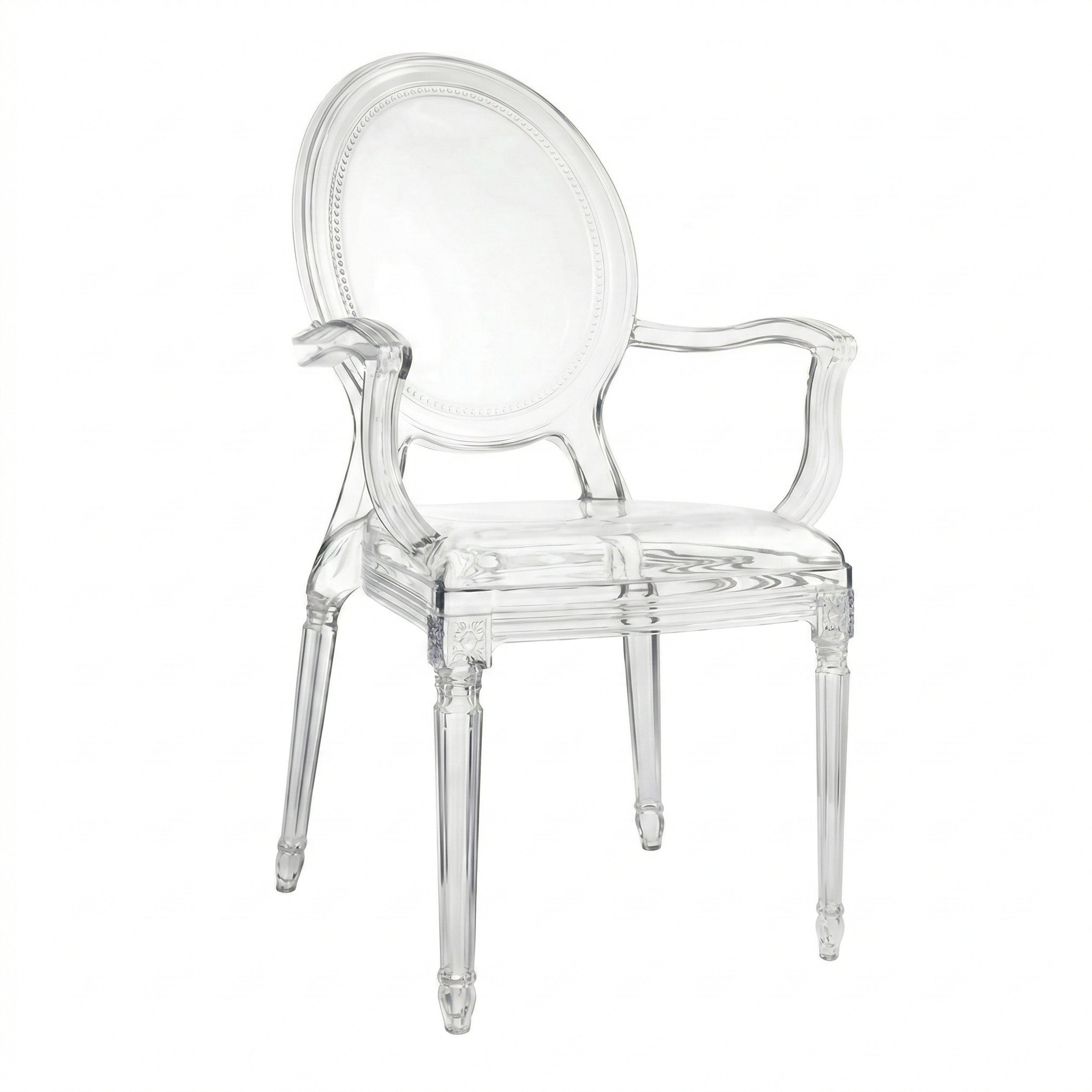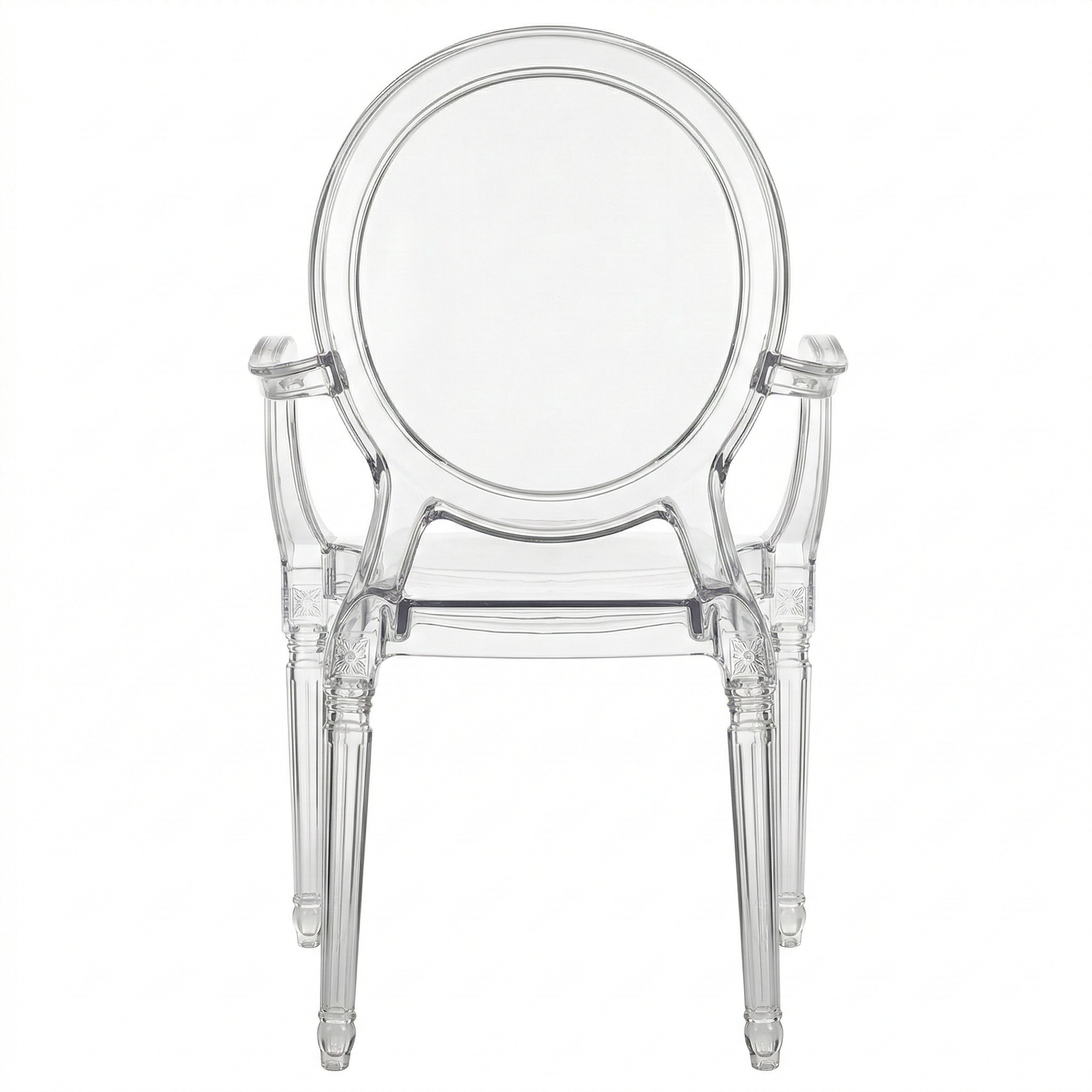 La poltrona Atene Cribel è realizzata in policarbonato trasparente con struttura monoblocco, caratterizzata da un design classico reinterpretato in chiave contemporanea. Lo schienale ovale presenta una cornice lavorata a rilievo che aggiunge eleganza e raffinatezza, mentre i braccioli curvi si integrano armoniosamente nella struttura accompagnando la seduta in modo fluido.