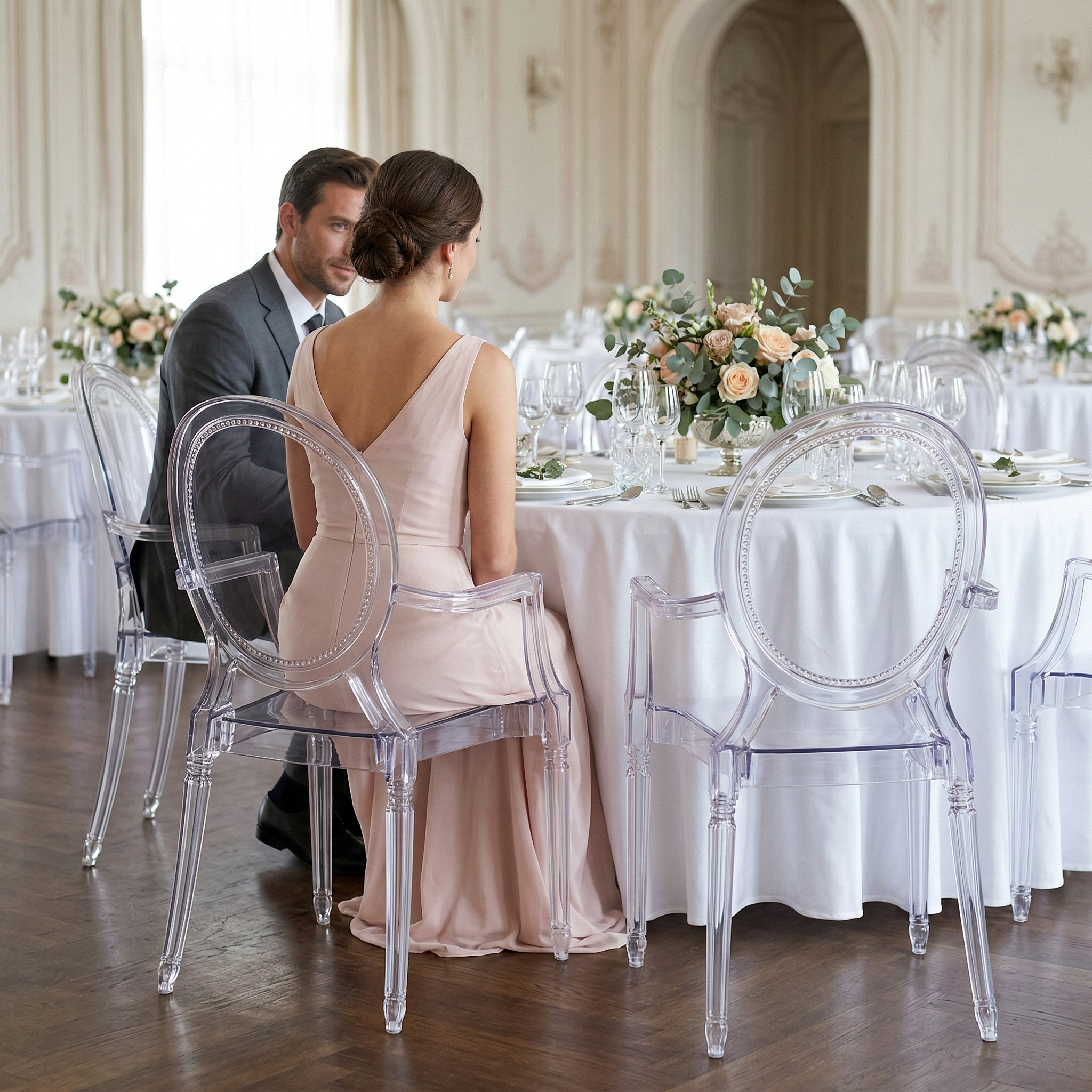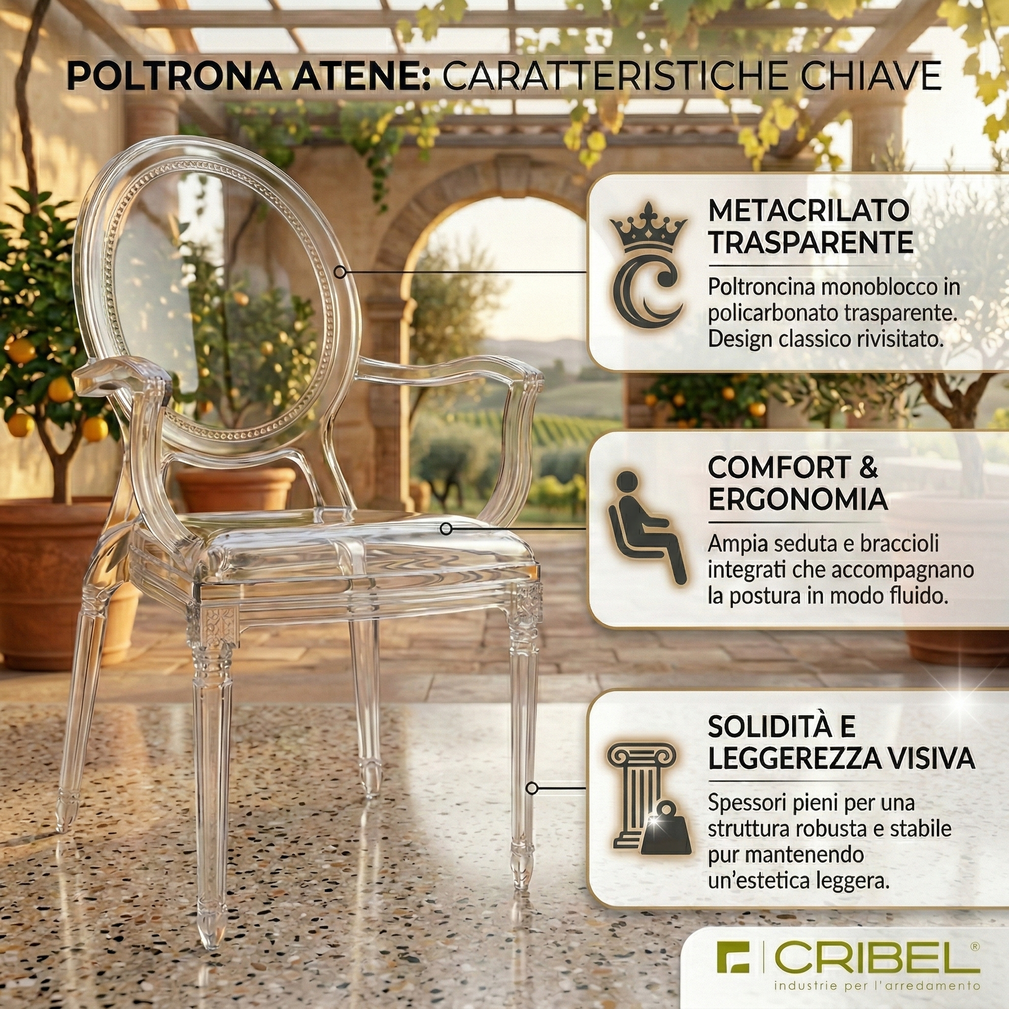 La poltrona Atene Cribel è realizzata in policarbonato trasparente con struttura monoblocco, caratterizzata da un design classico reinterpretato in chiave contemporanea. Lo schienale ovale presenta una cornice lavorata a rilievo che aggiunge eleganza e raffinatezza, mentre i braccioli curvi si integrano armoniosamente nella struttura accompagnando la seduta in modo fluido. La seduta ampia e liscia, con spessori pieni, garantisce solidità e comfort mantenendo al tempo stesso un’estetica leggera e sofisticata, ideale per ambienti eleganti e moderni.