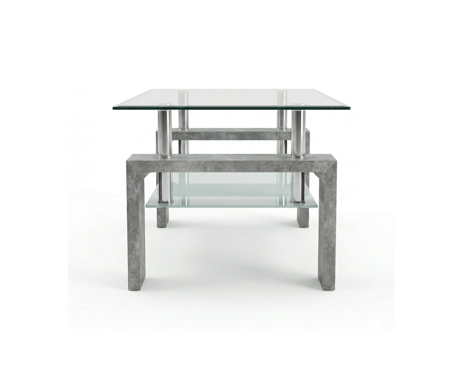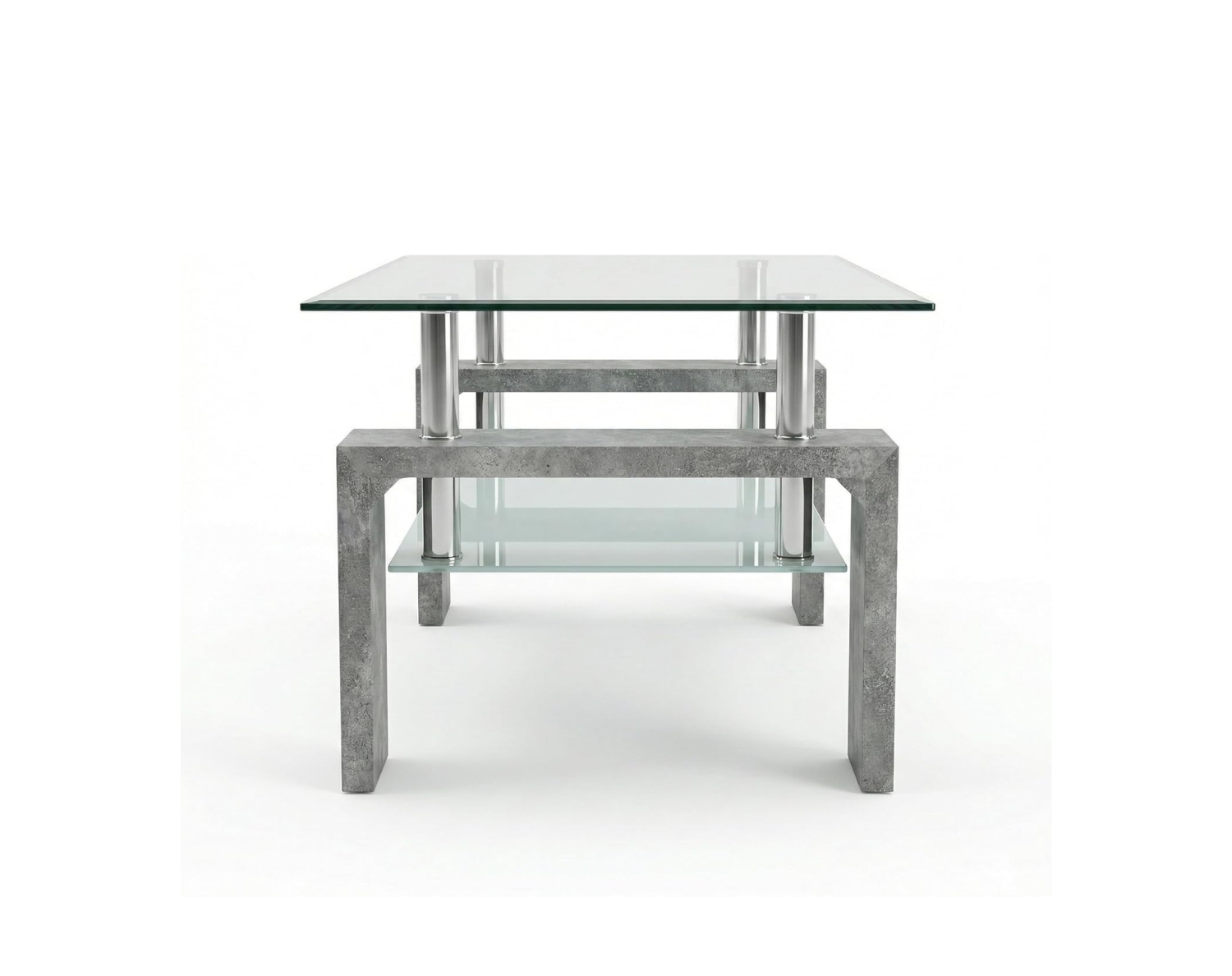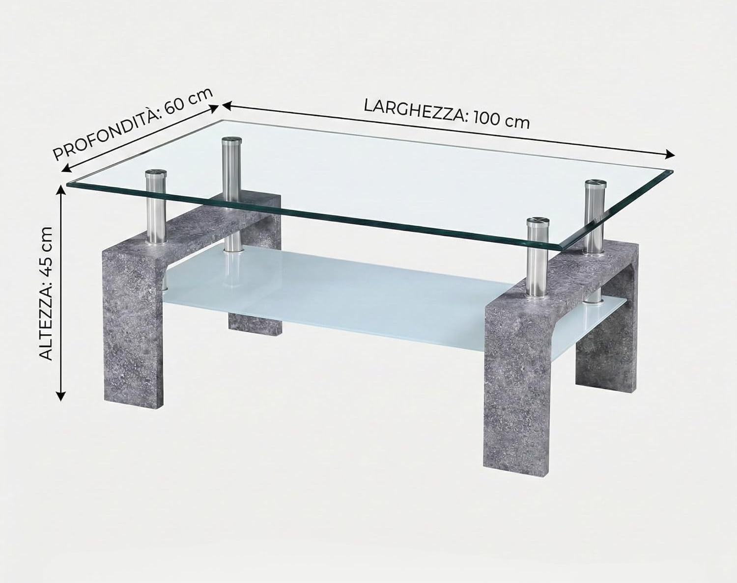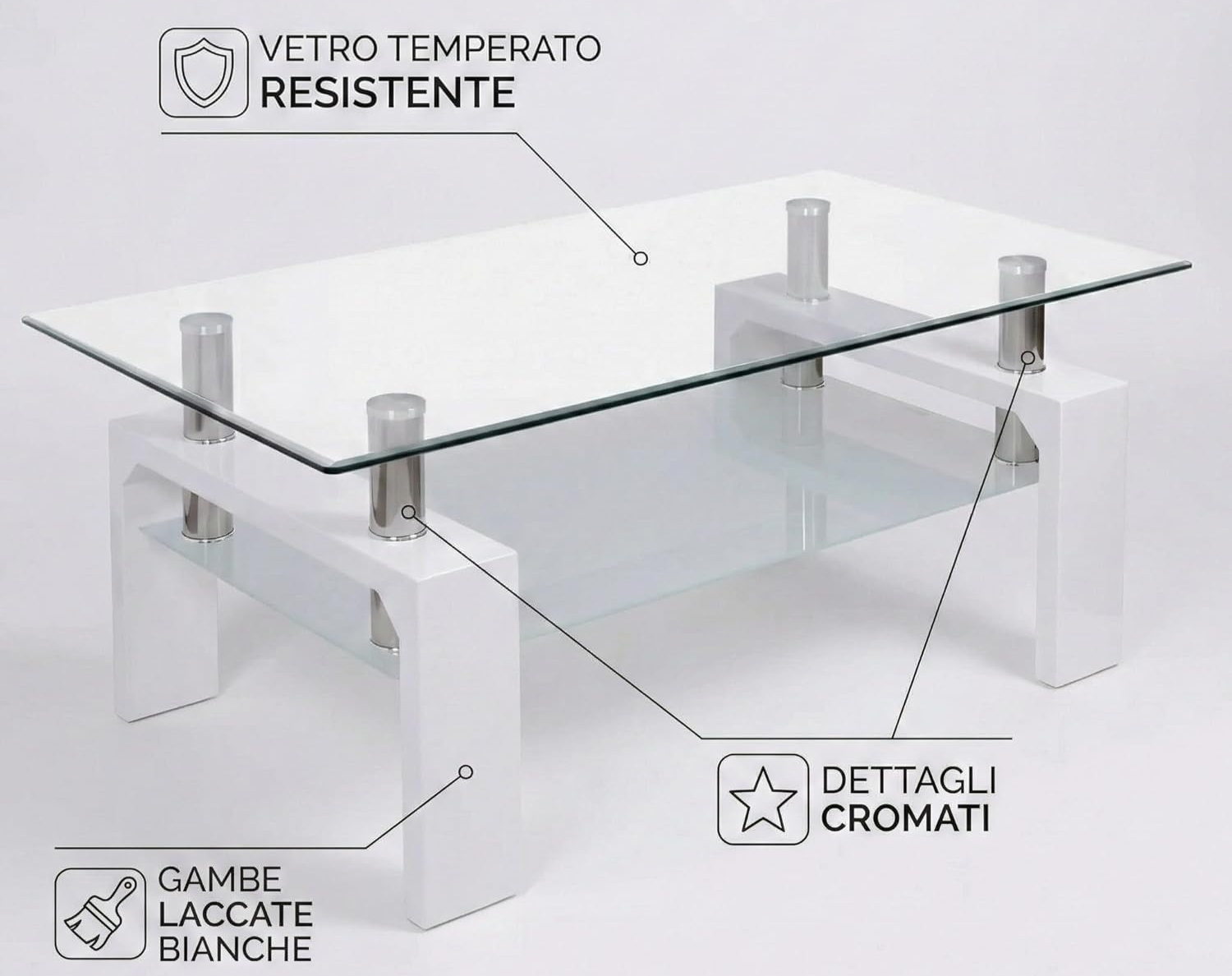 Il tavolino Cribel RENEE combina vetro temperato trasparente e gambe in legno laccato bianco o finitura cemento, creando uno stile elegante e moderno. Il ripiano inferiore aggiunge praticità, mentre i piedini in metallo cromato donano stabilità e un tocco raffinato.