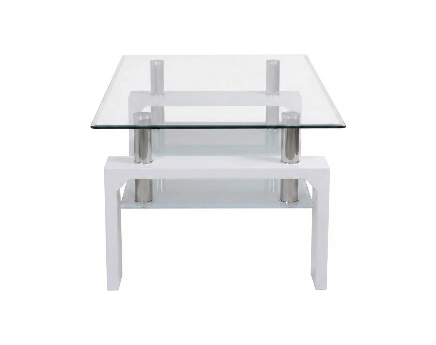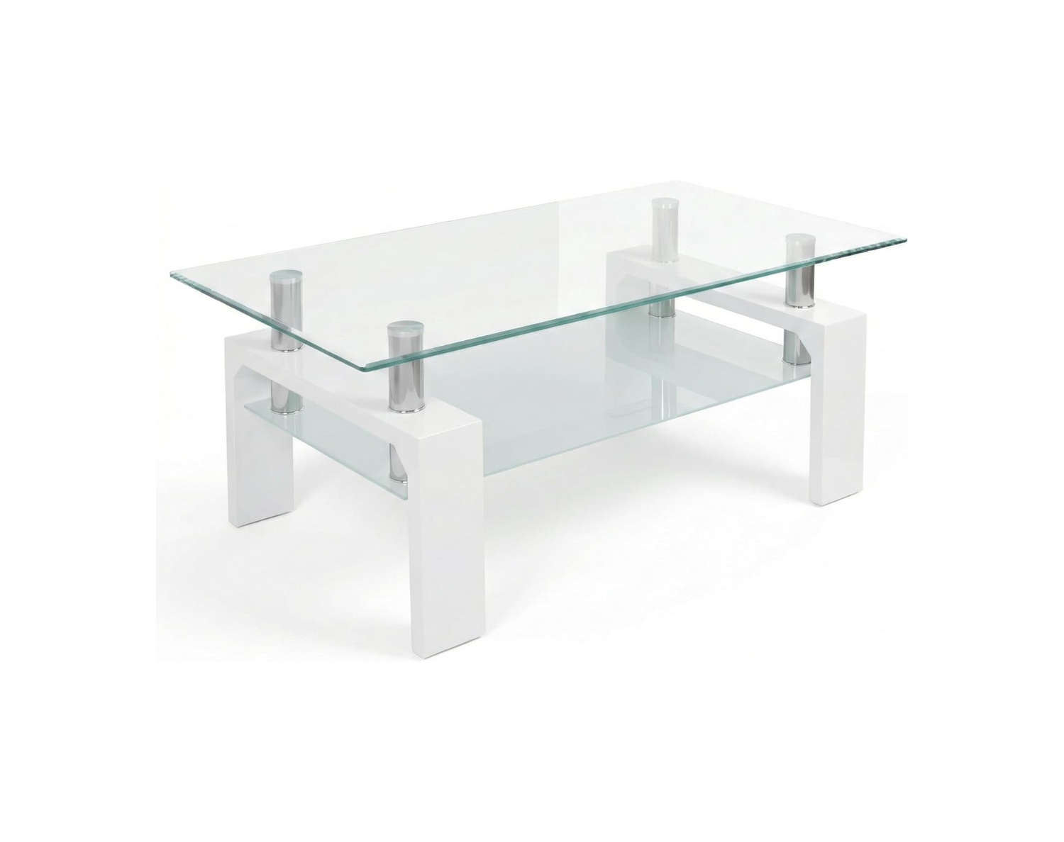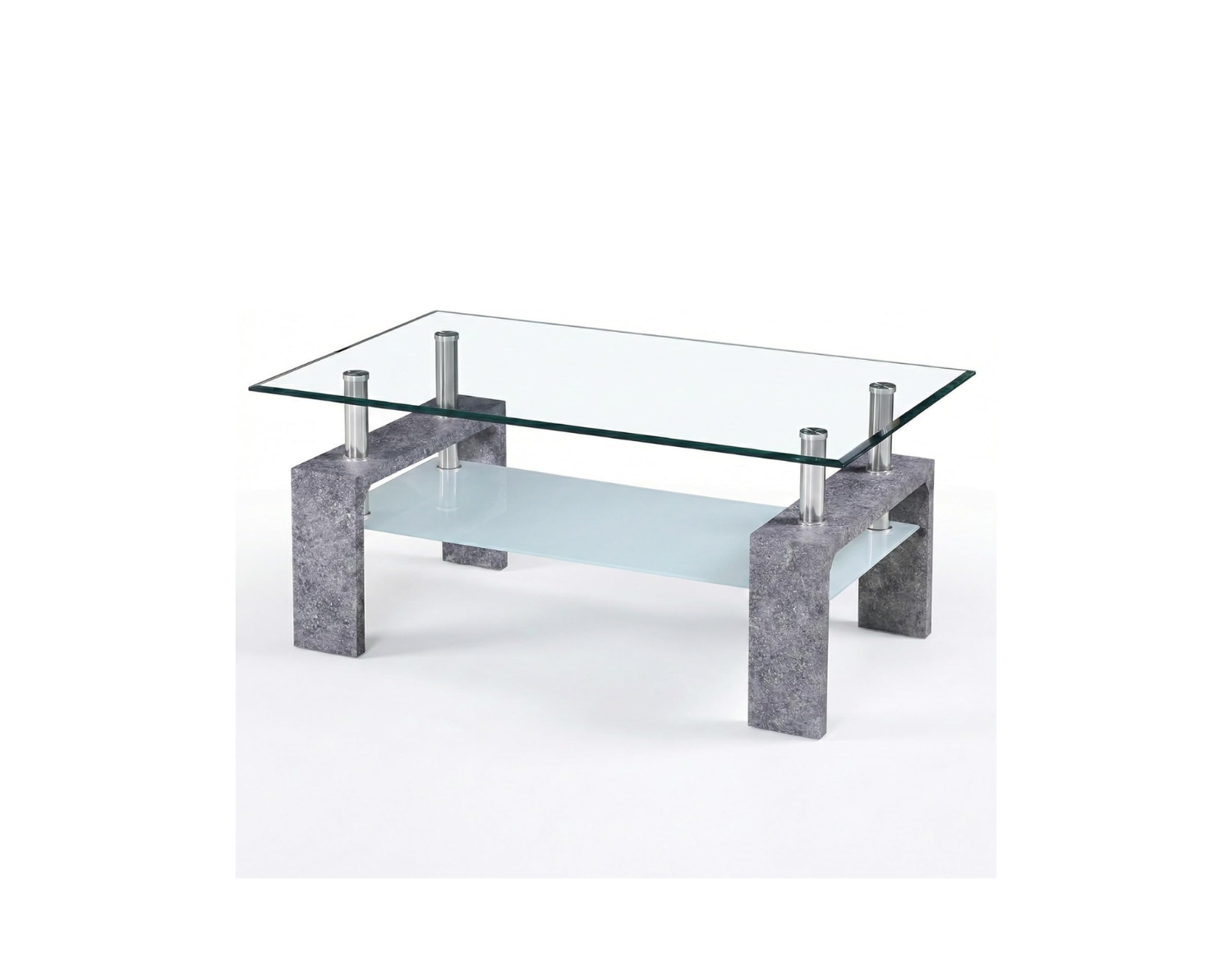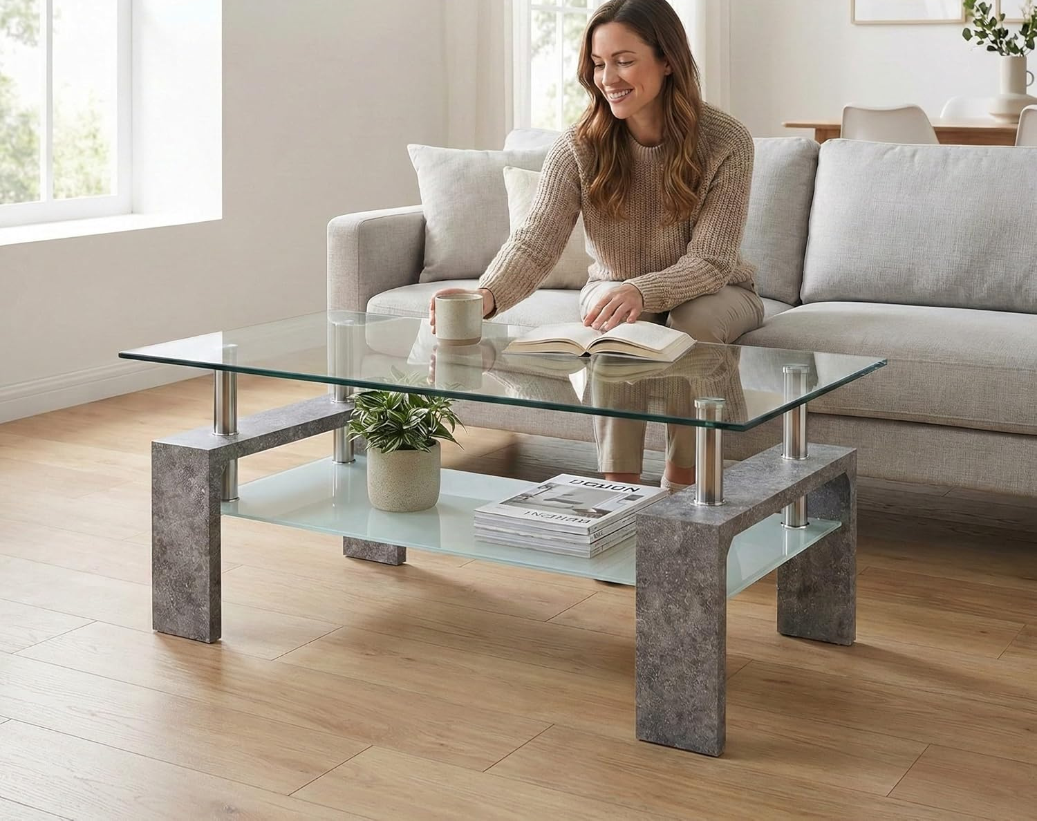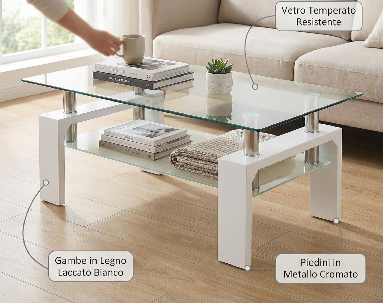 Il tavolino Cribel RENEE combina vetro temperato trasparente e gambe in legno laccato bianco o finitura cemento, creando uno stile elegante e moderno. Il ripiano inferiore aggiunge praticità, mentre i piedini in metallo cromato donano stabilità e un tocco raffinato.