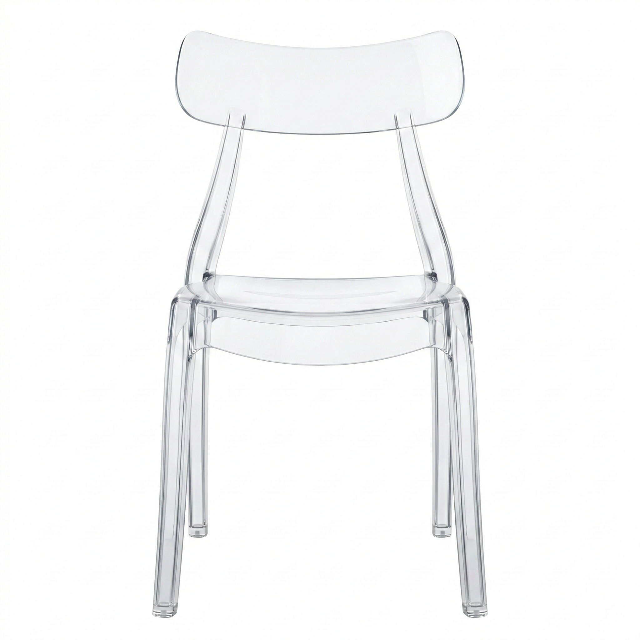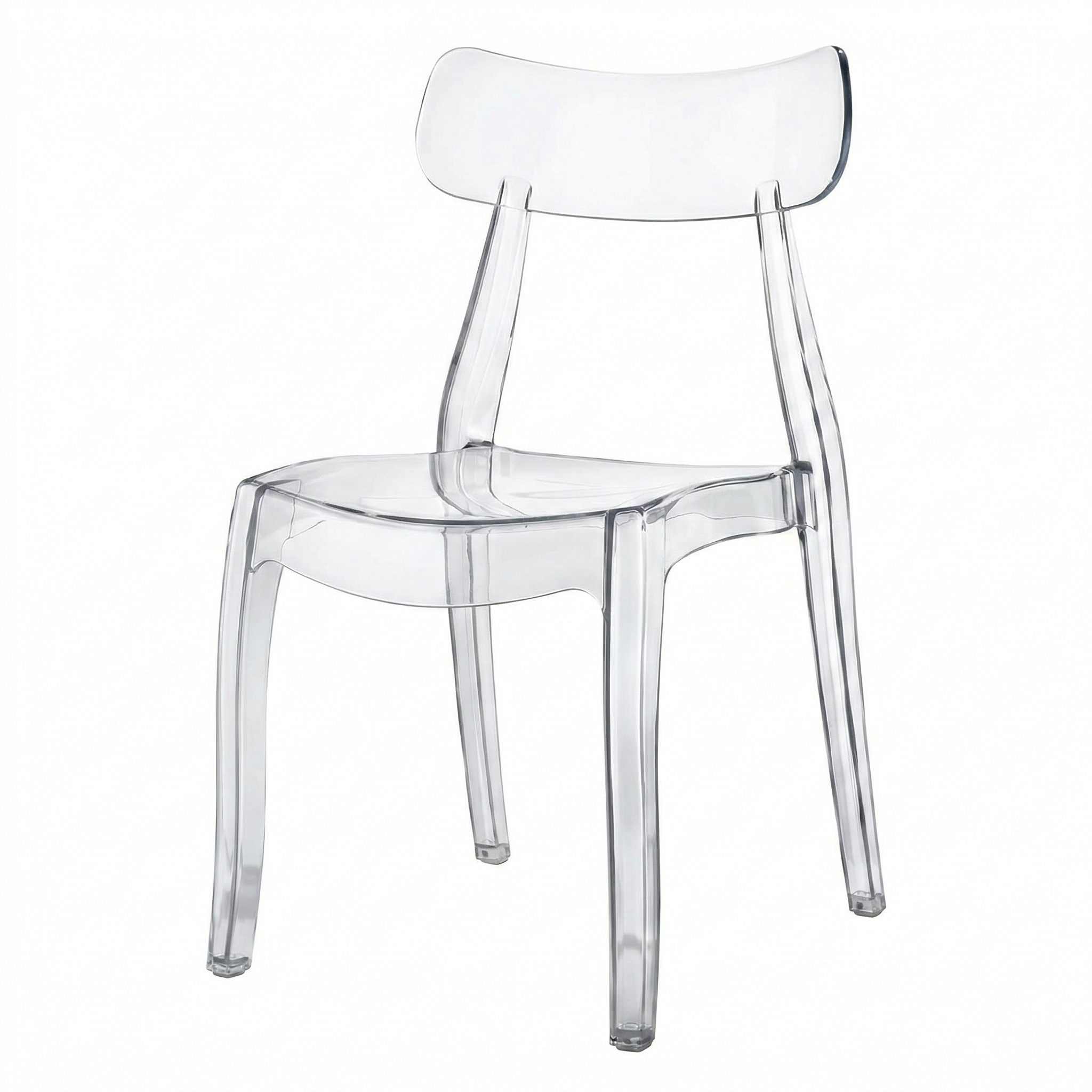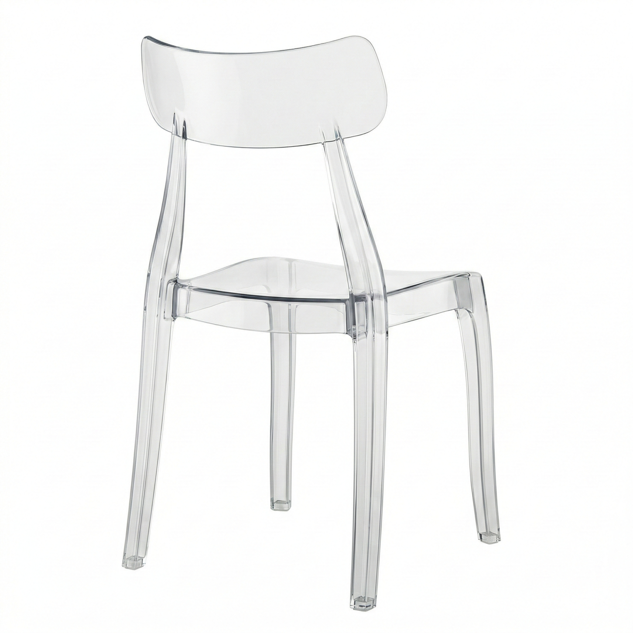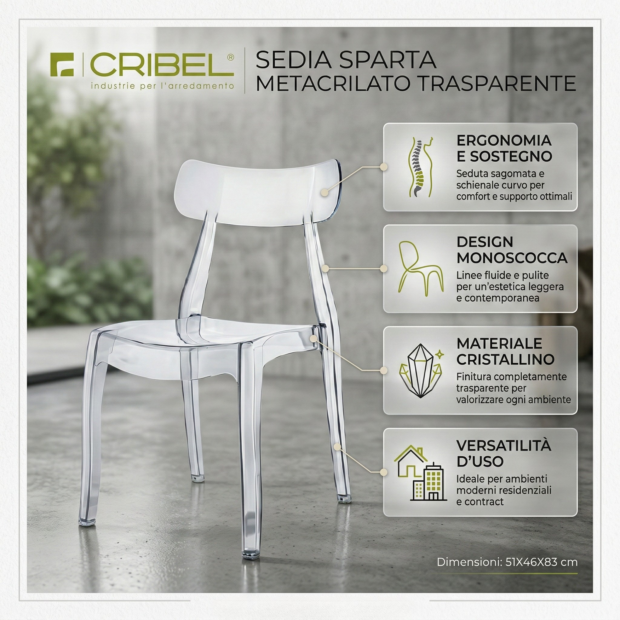 The Sparta Cribel chair is a modern and elegant solution made of transparent plastic, perfect for enhancing any space with lightness and style. The monocoque design features soft, continuous lines, with an ergonomic seat and curved backrest that offers comfort and support.