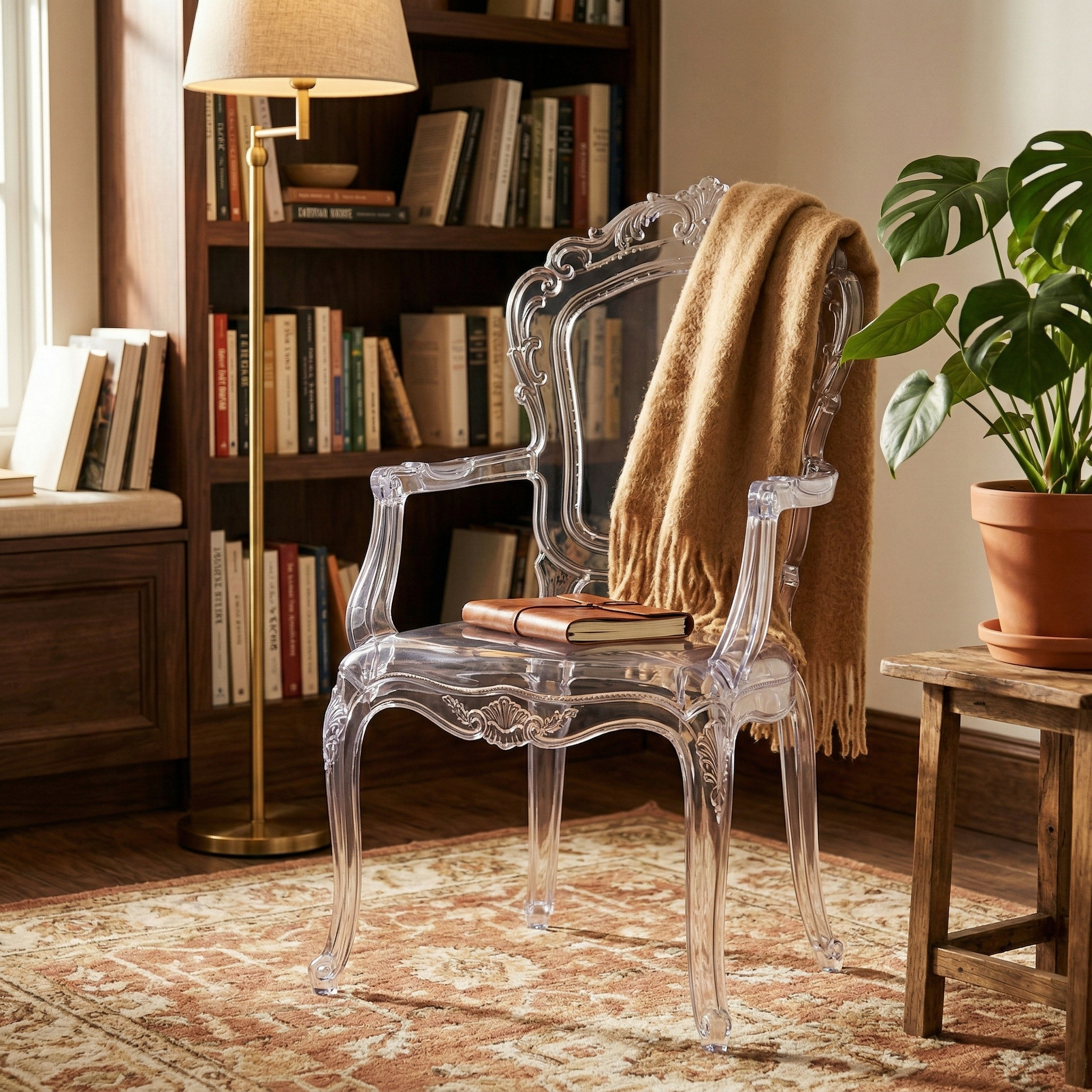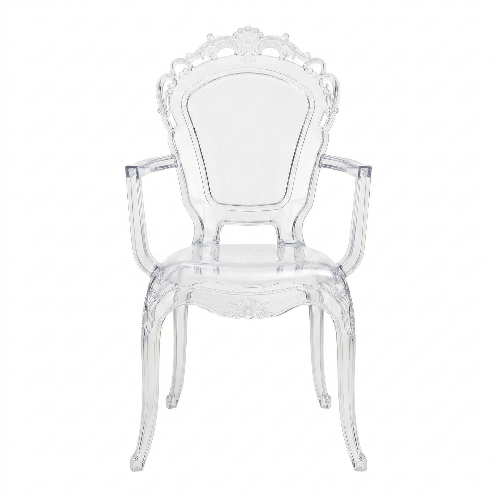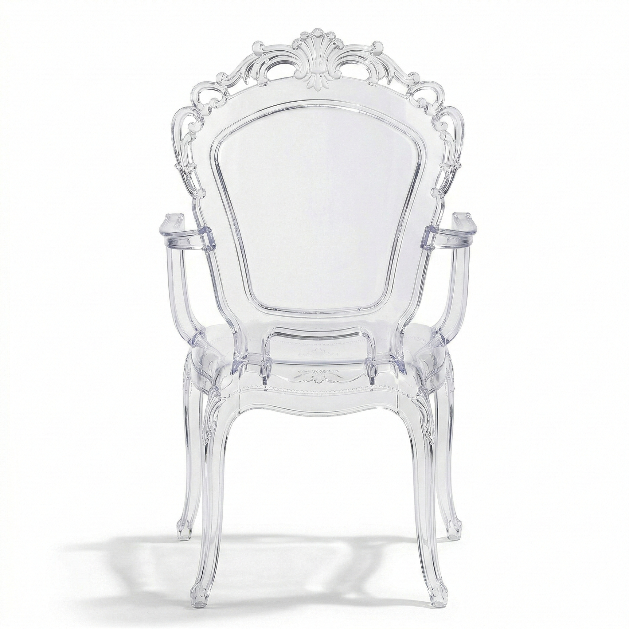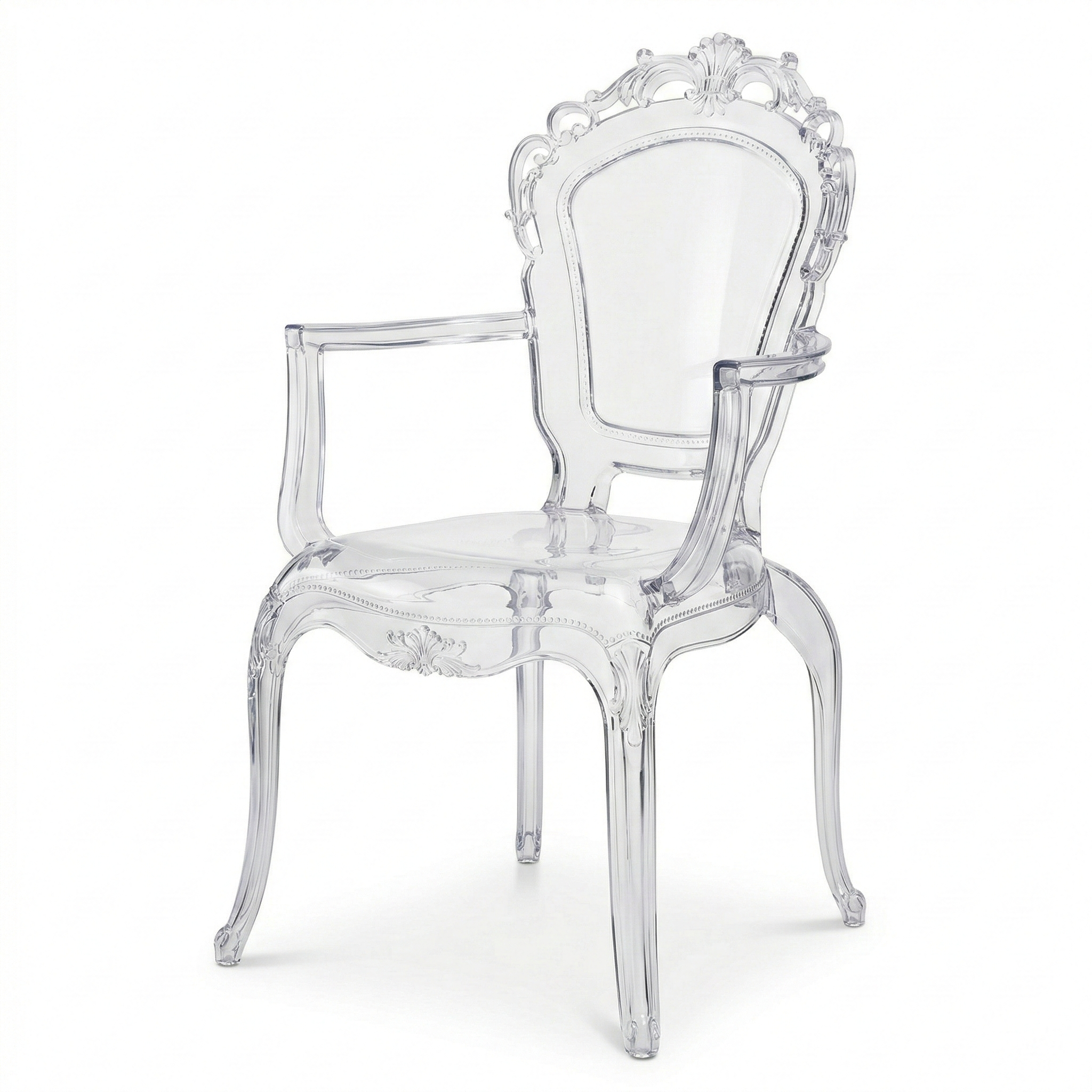 La sedia con braccioli di Cribel è realizzata in policarbonato trasparente ad alta resistenza e si distingue per il suo design elegante e raffinato. La struttura monoblocco valorizza le forme decorative, mentre lo schienale sagomato con dettagli in rilievo in stile barocco aggiunge un tocco classico e sofisticato. La seduta ampia e confortevole, insieme alle gambe sottili e leggermente curve, dona leggerezza visiva e armonia, rendendola ideale per ambienti moderni e di design.