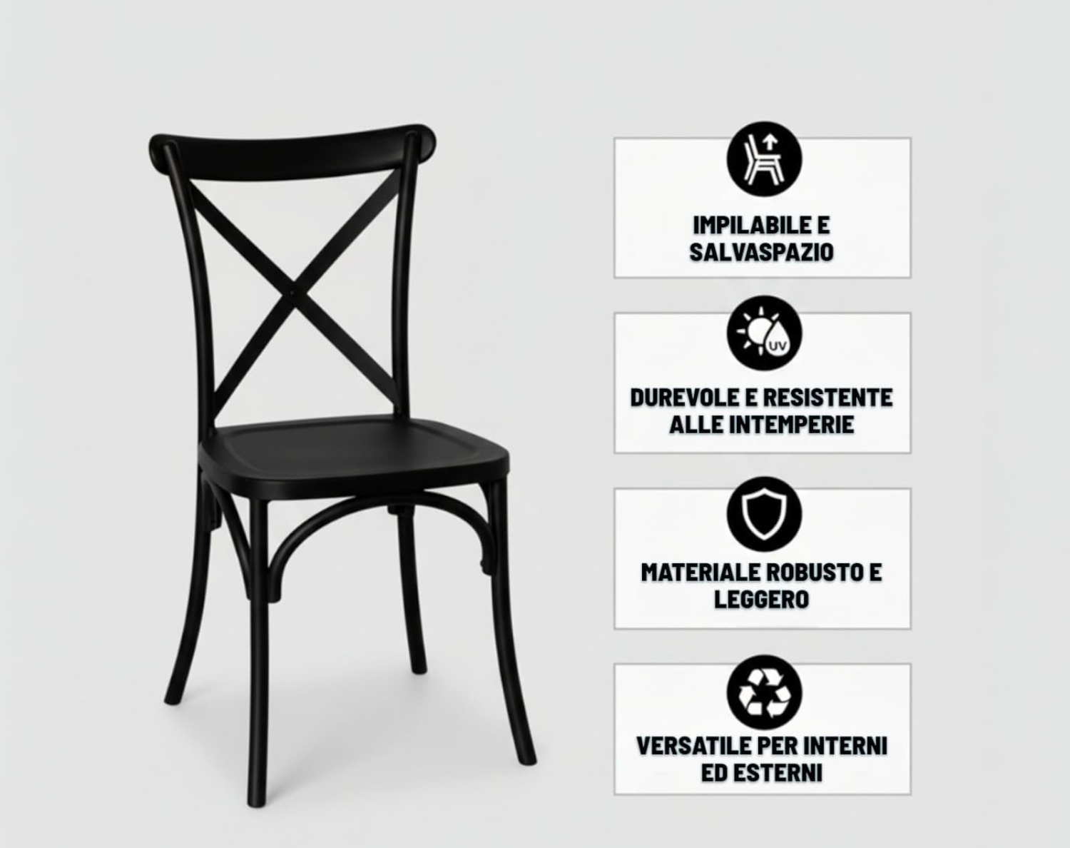 La Sedie New Cross in polipropilene di Cribel combina un design classico con funzionalità moderne, distinguendosi per le sue linee pulite e senza tempo e per lo schienale a crociera ispirato alle tradizionali sedie bistrot. Realizzata in un’unica struttura monoscocca, è leggera, resistente e stabile, offrendo comfort per l’utilizzo quotidiano. Grazie alla resistenza ai raggi UV e all’umidità, è perfetta sia per ambienti interni che esterni, come cucine, sale da pranzo, giardini, terrazze, bar e ristoranti.