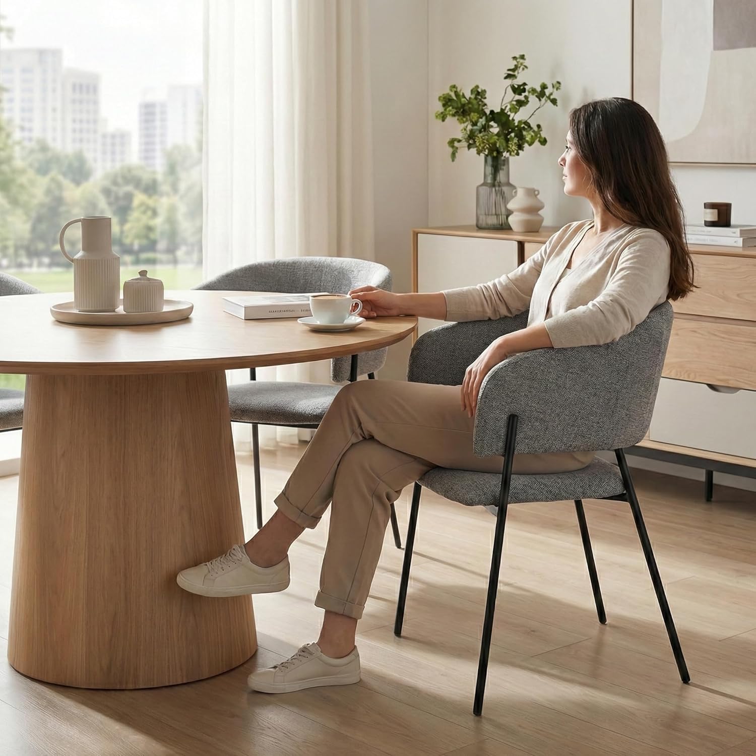 La seduta imbottita e lo schienale avvolgente assicurano comfort durante l’uso quotidiano, sia per pranzi, momenti di relax o incontri conviviali. Le gambe in metallo garantiscono stabilità e lunga durata, mentre la forma compatta permette di inserirle facilmente in diversi ambienti.