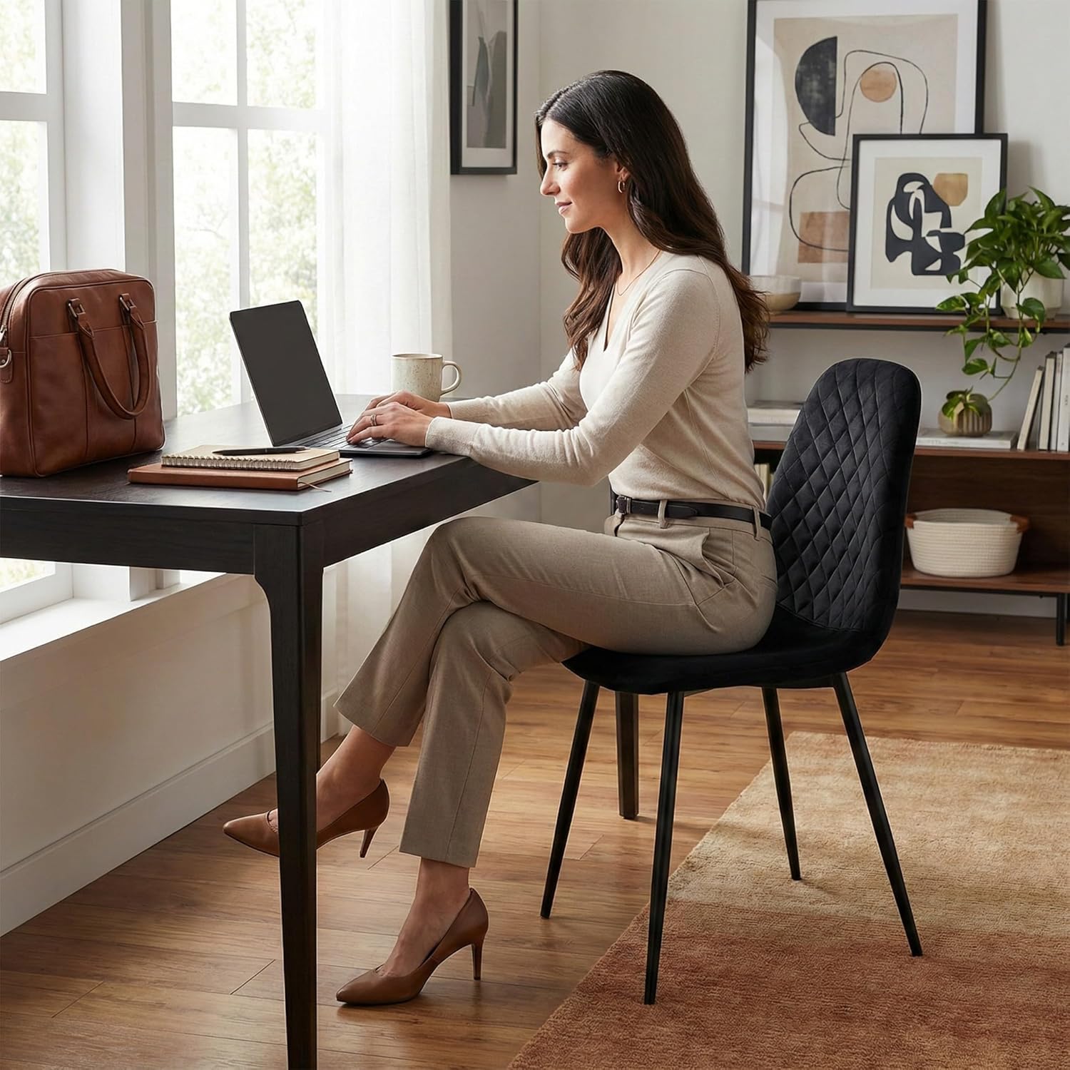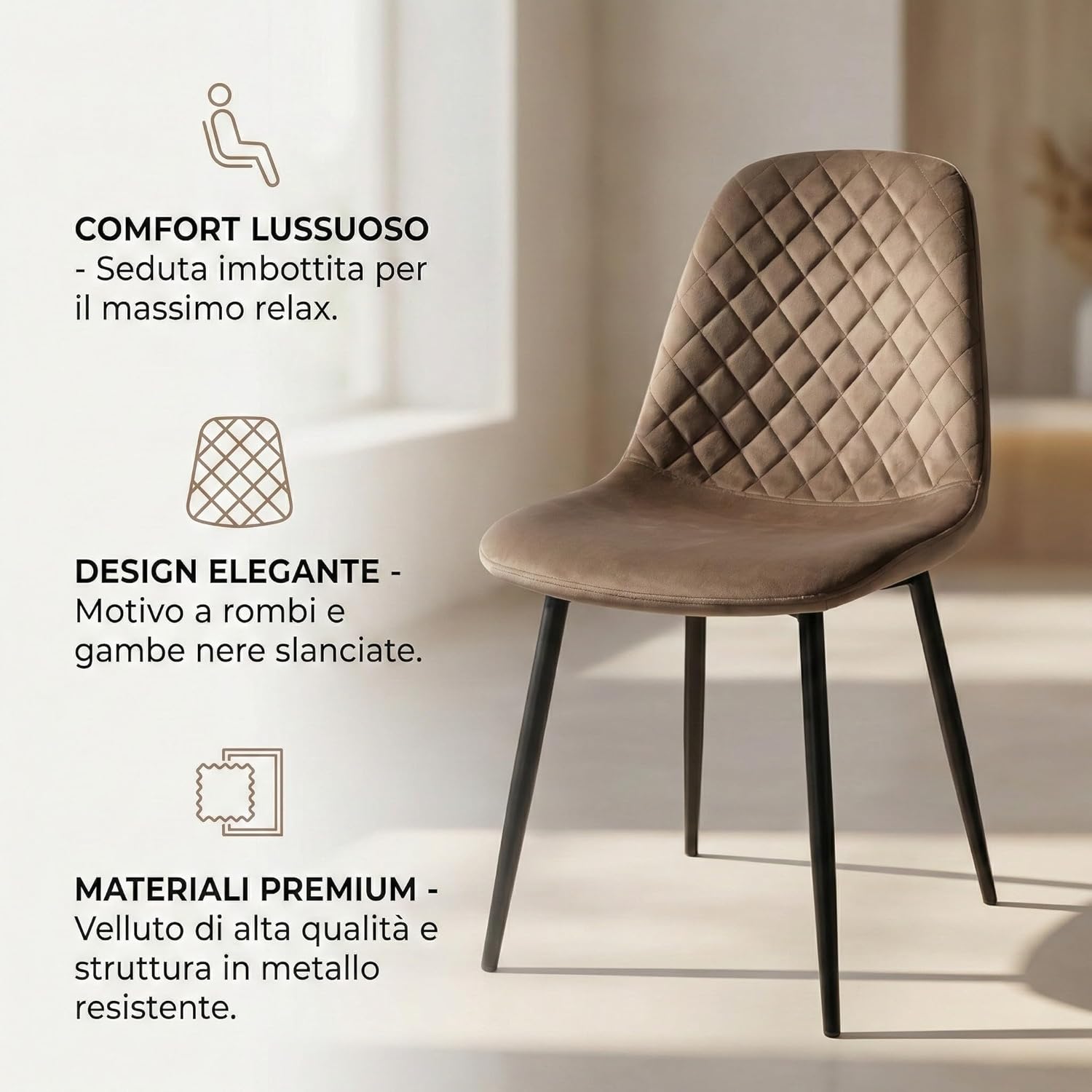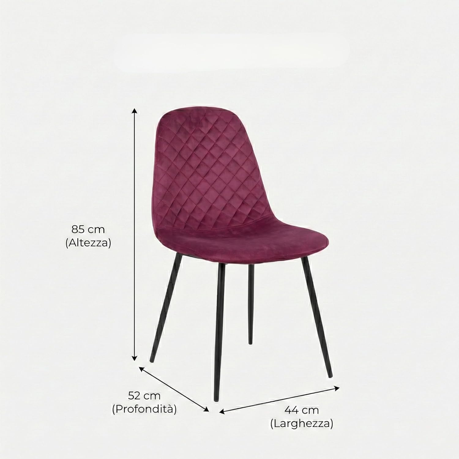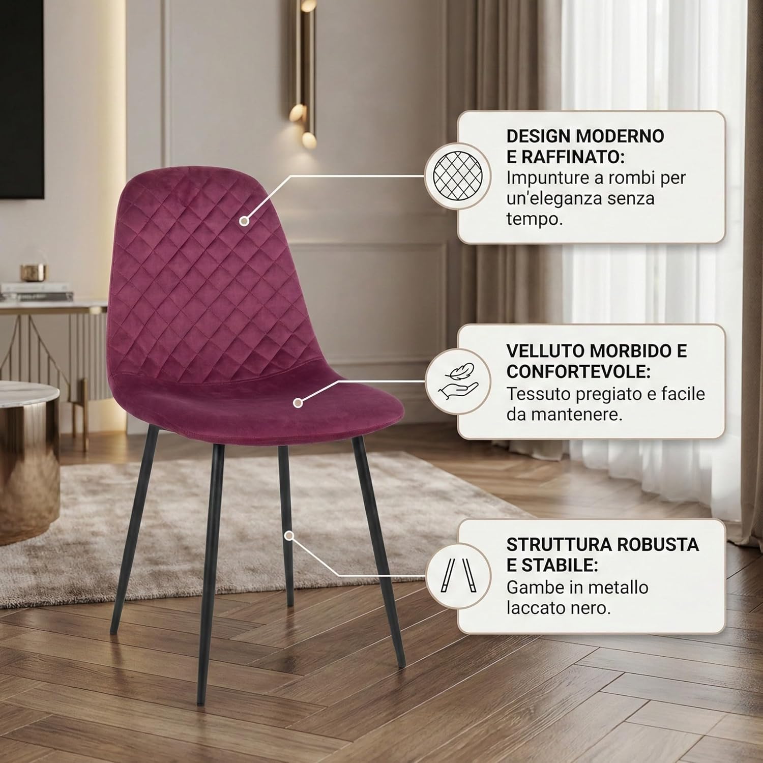 Le sedie Lena si distinguono per la loro meticolosa attenzione ai dettagli e la selezione di materiali di alta qualità. Il rivestimento in velluto non solo conferisce una texture morbida e piacevole al tatto, ma aggiunge anche una profondità visiva che cattura la luce, esaltando le linee pulite e il profilo slanciato della sedia. Le gambe, realizzate in metallo resistente con finitura nera opaca, garantiscono stabilità e durabilità nel tempo, completando l’estetica con un tocco di modernità industriale. Il design ergonomico è studiato per offrire un supporto ottimale, rendendo queste sedie perfette per un utilizzo prolungato senza sacrificare lo stile.