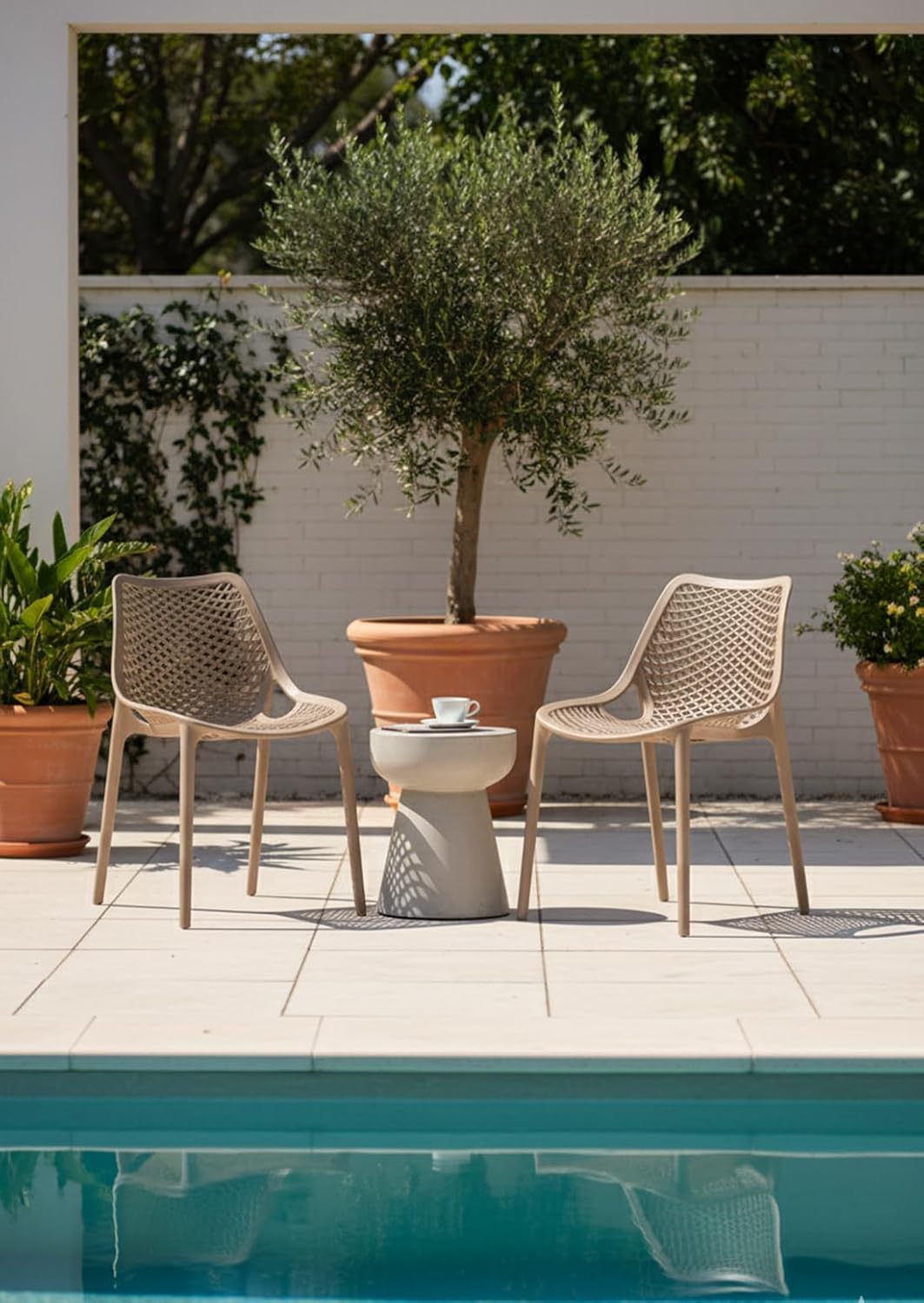 Le sedie Braga si distinguono per la loro costruzione meticolosa e l’impiego di materiali di alta qualità. Il polipropilene, noto per la sua eccezionale resistenza agli agenti atmosferici, ai raggi UV e all’usura quotidiana, costituisce la base solida di queste sedie. La particolare lavorazione a intreccio conferisce non solo un aspetto raffinato e naturale, che richiama le fibre vegetali, ma anche una maggiore traspirabilità e un comfort superiore. Il design è studiato per essere ergonomico, con una seduta accogliente e uno schienale che supporta correttamente la postura, anche durante utilizzi prolungati. La struttura leggera ma robusta facilita lo spostamento e la riorganizzazione degli spazi, rendendo il Set Braga estremamente funzionale e adattabile a diverse configurazioni abitative.