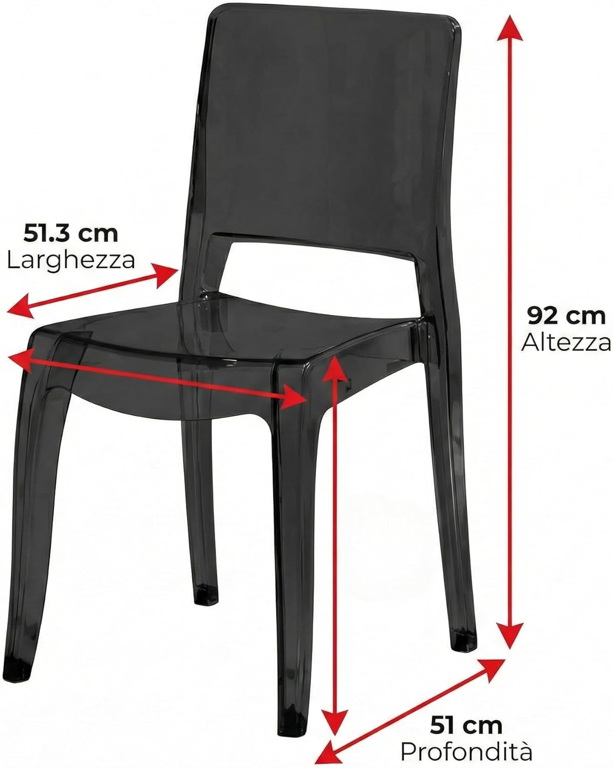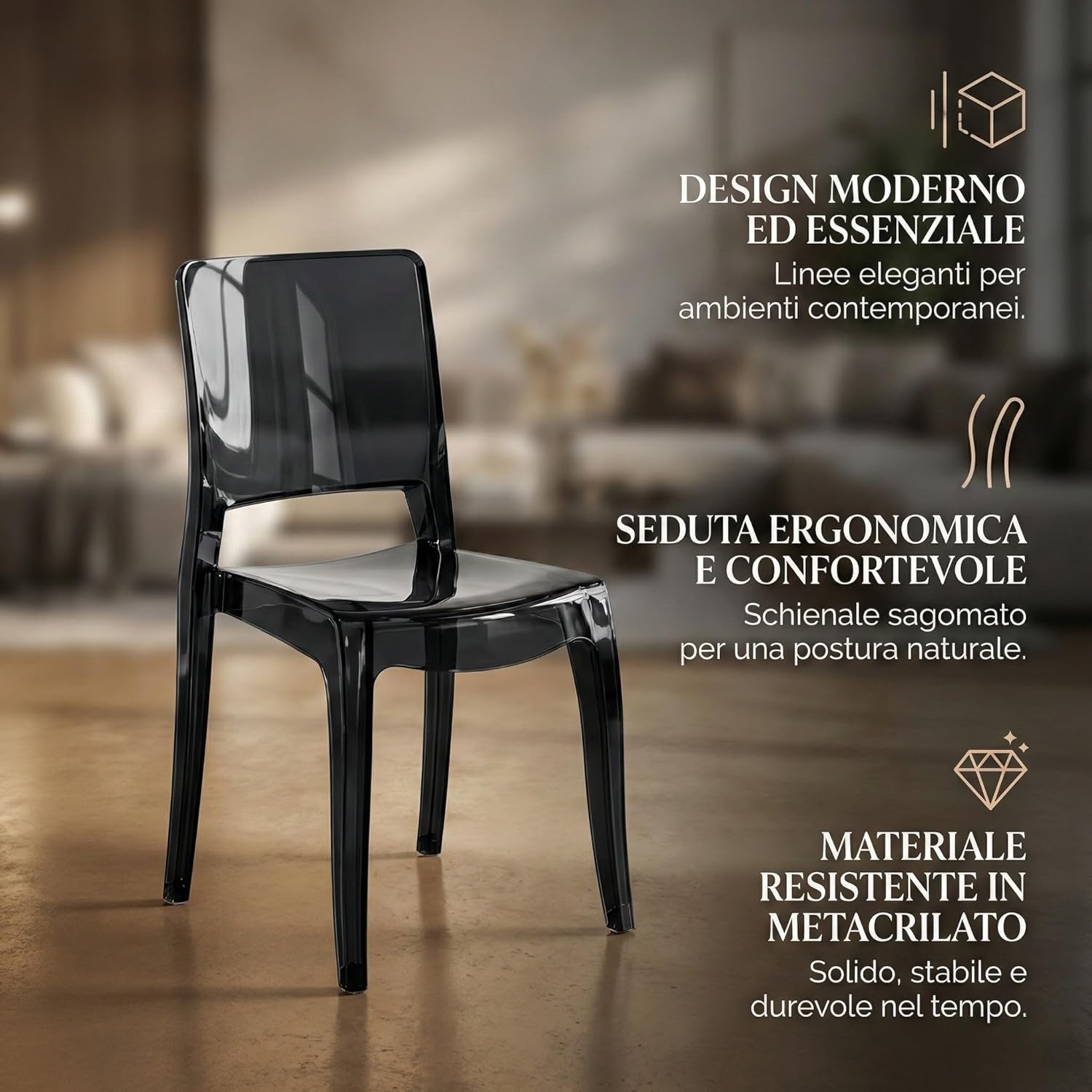 Le sedie Cribel si distinguono per l’utilizzo del metacrilato, un materiale che garantisce resistenza, leggerezza e una manutenzione estremamente semplice. La finitura lucida del metacrilato nero cattura la luce, creando giochi di riflessi che dinamizzano l’ambiente e ne amplificano la percezione spaziale. Il design moderno è caratterizzato da linee essenziali e una silhouette slanciata, che conferiscono a ogni sedia un aspetto sofisticato e senza tempo. Questa scelta stilistica non è solo estetica, ma contribuisce anche alla robustezza della struttura, assicurando stabilità e una lunga durata nel tempo. Ogni dettaglio è stato curato per offrire un prodotto di alta qualità che risponda alle esigenze di un pubblico attento al design e alla funzionalità.