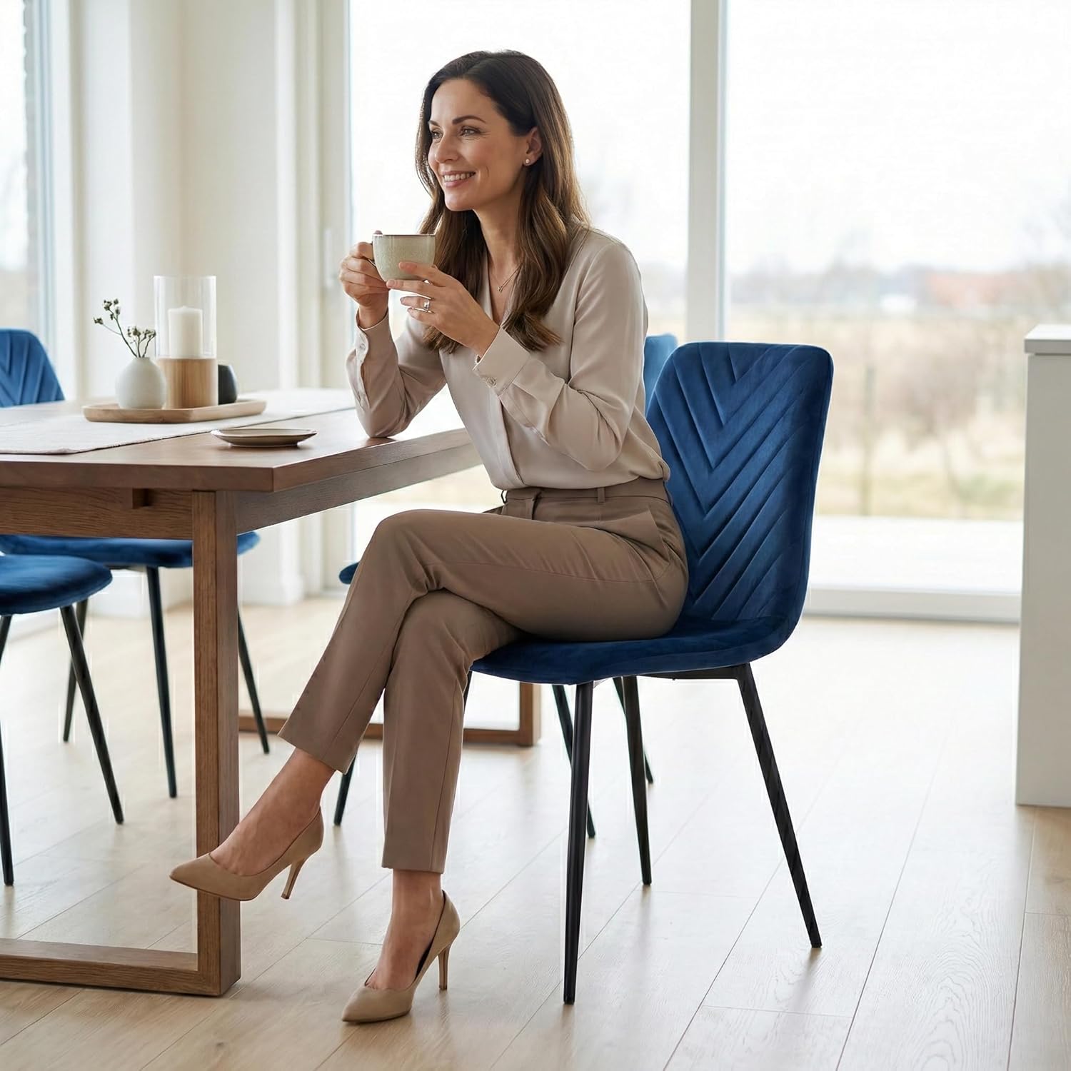 Il comfort è una priorità assoluta per il Set di 6 New Point. L’imbottitura generosa e il rivestimento in velluto contribuiscono a creare un’esperienza di seduta estremamente confortevole, perfetta per lunghe conversazioni a tavola o momenti di relax. La funzionalità del set è amplificata dalla sua composizione di sei pezzi, che permette di arredare con coerenza spazi ampi o di disporre le sedute in base alle esigenze del momento. I vantaggi di scegliere questo set includono non solo l’elevato standard estetico e il comfort superiore, ma anche la capacità di trasformare qualsiasi stanza in un ambiente più sofisticato e accogliente. È una scelta che riflette un gusto per il design contemporaneo e una predilezione per la qualità che dura nel tempo.