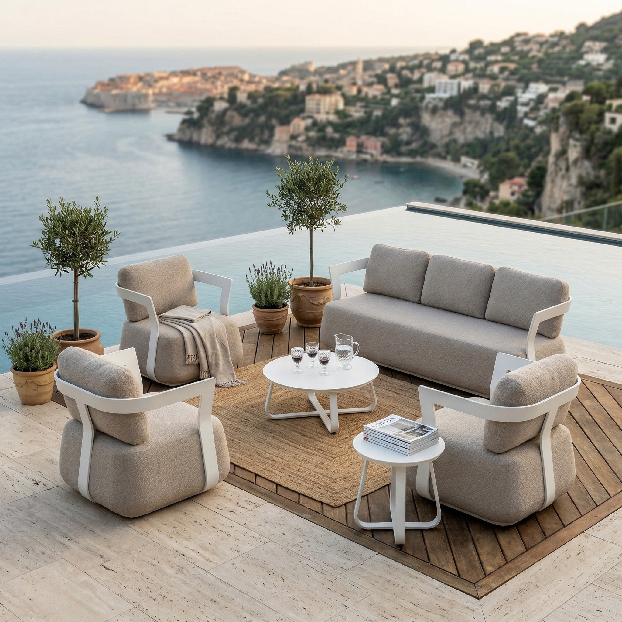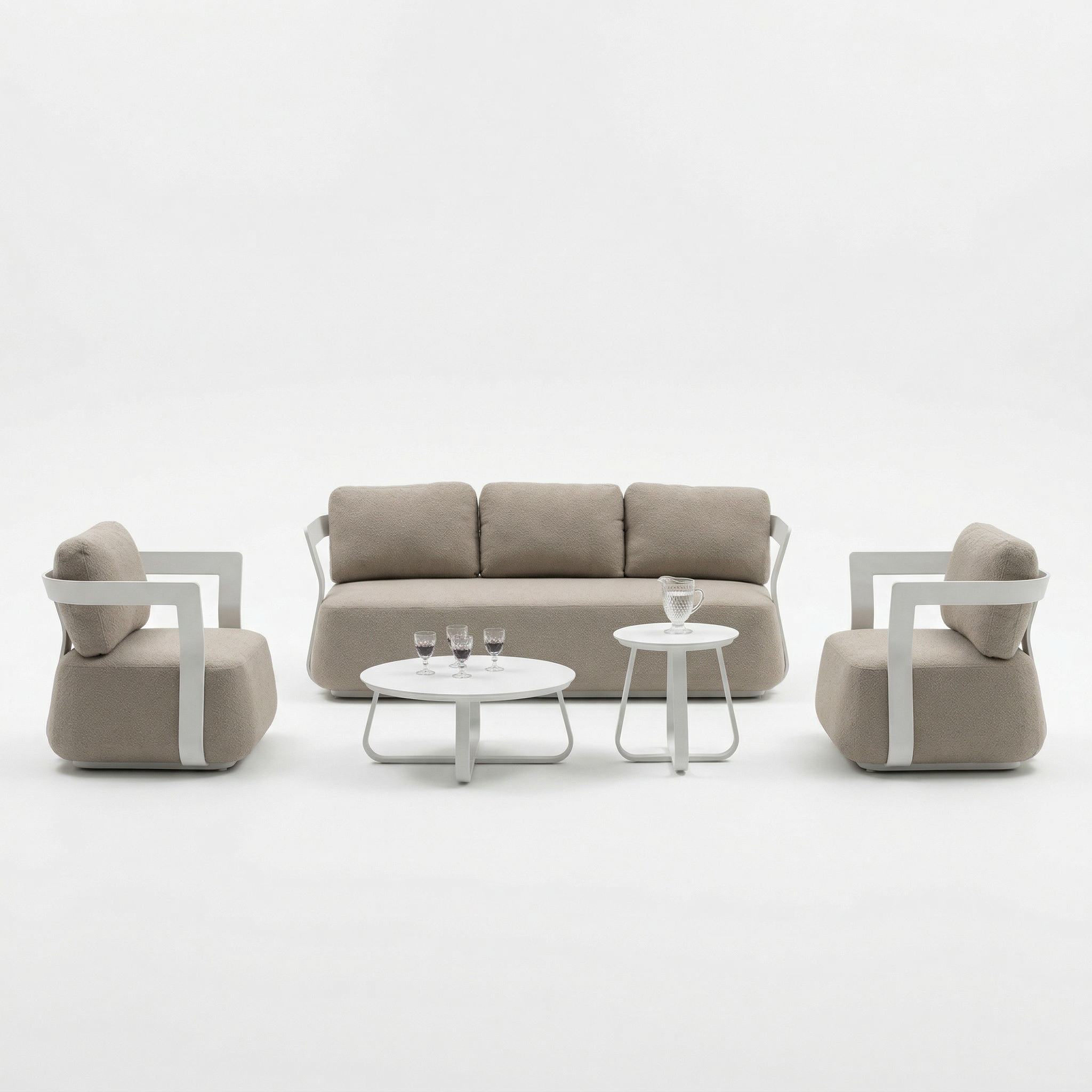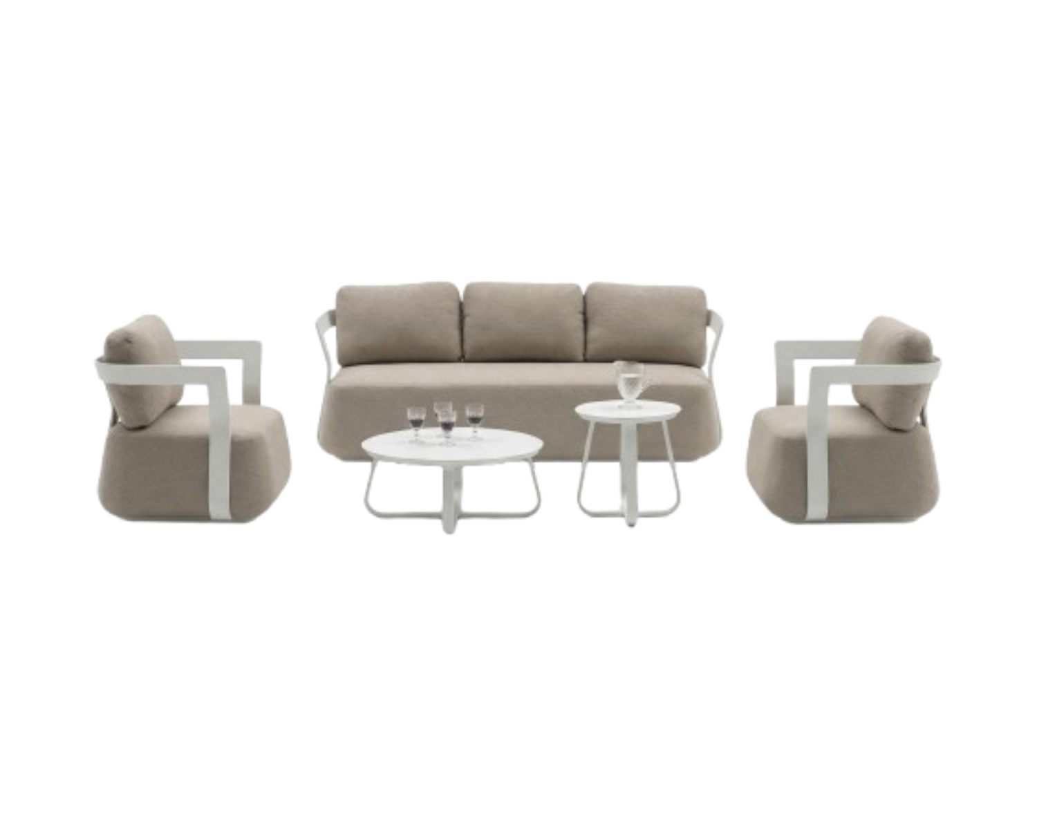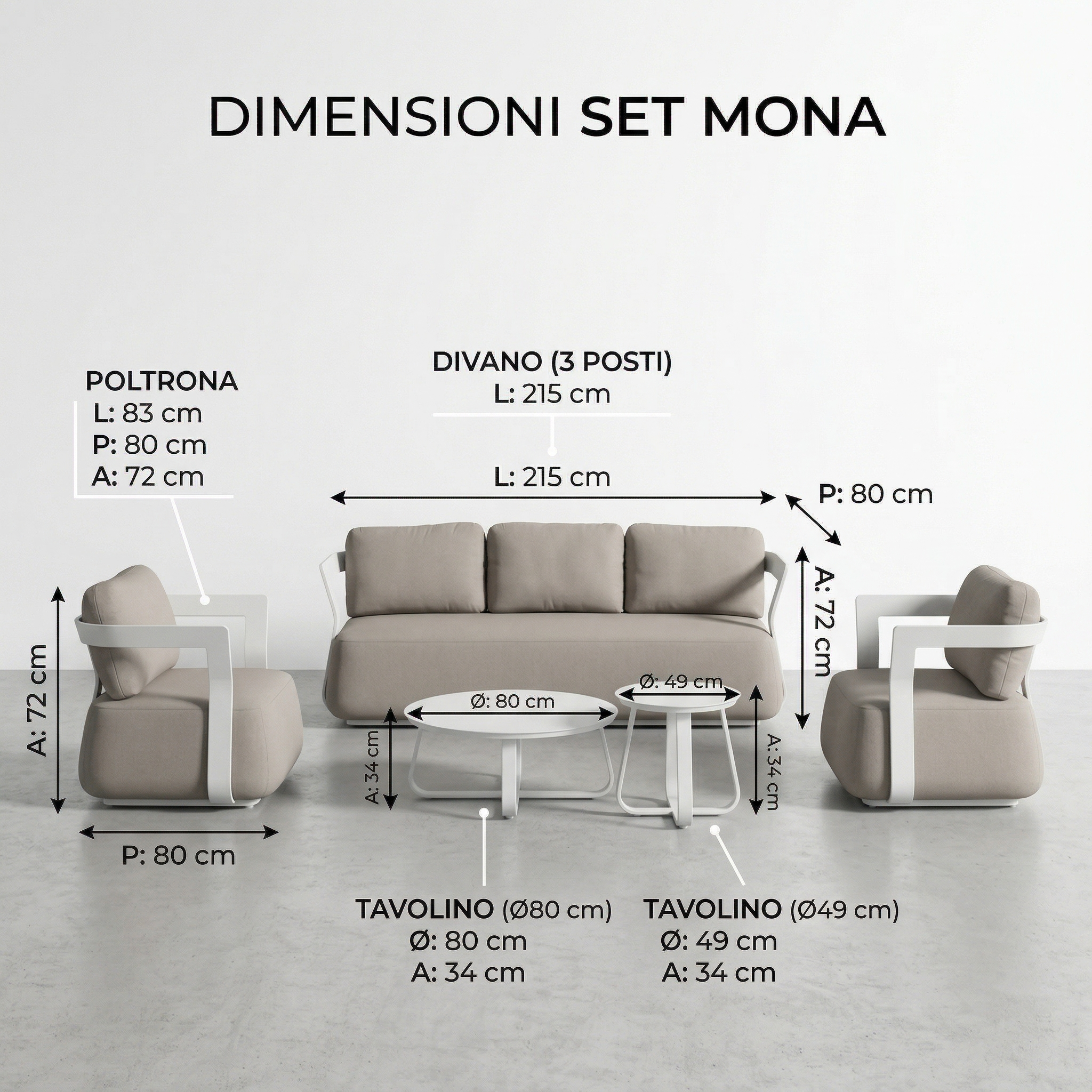 Il Cribel Set Mona è un raffinato set da esterno composto da 2 poltrone, 1 divano a 3 posti e 2 tavolini con piani in alluminio. La struttura in alluminio bianco e i cuscini sfoderabili color tortora chiaro garantiscono resistenza, comfort e facilità di manutenzione, rendendo il set ideale per terrazze, giardini o spazi contract.