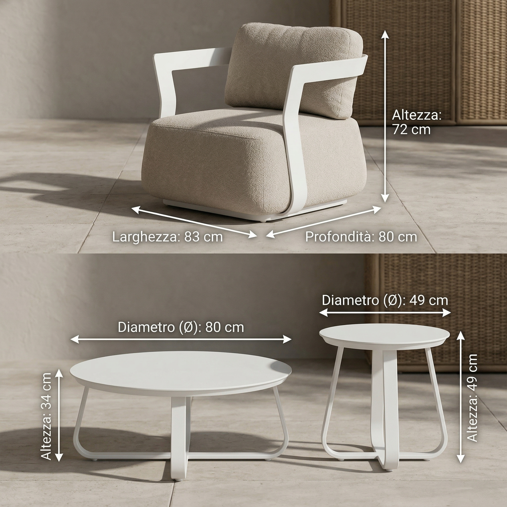 I tavolini di dimensioni Ø80 x 34 cm e Ø49 x 34 cm completano l’insieme, offrendo praticità e stile contemporaneo per momenti di relax all’aperto.