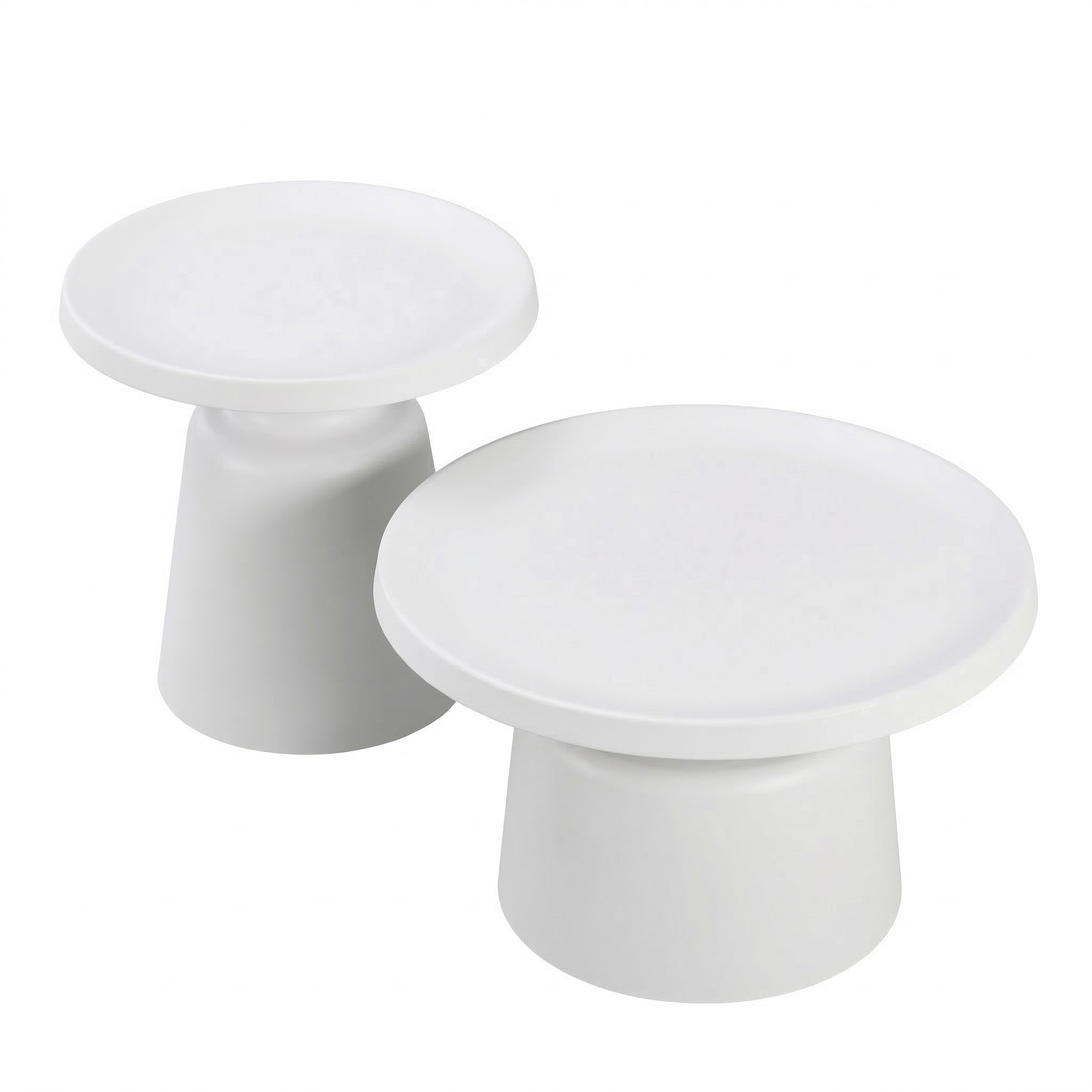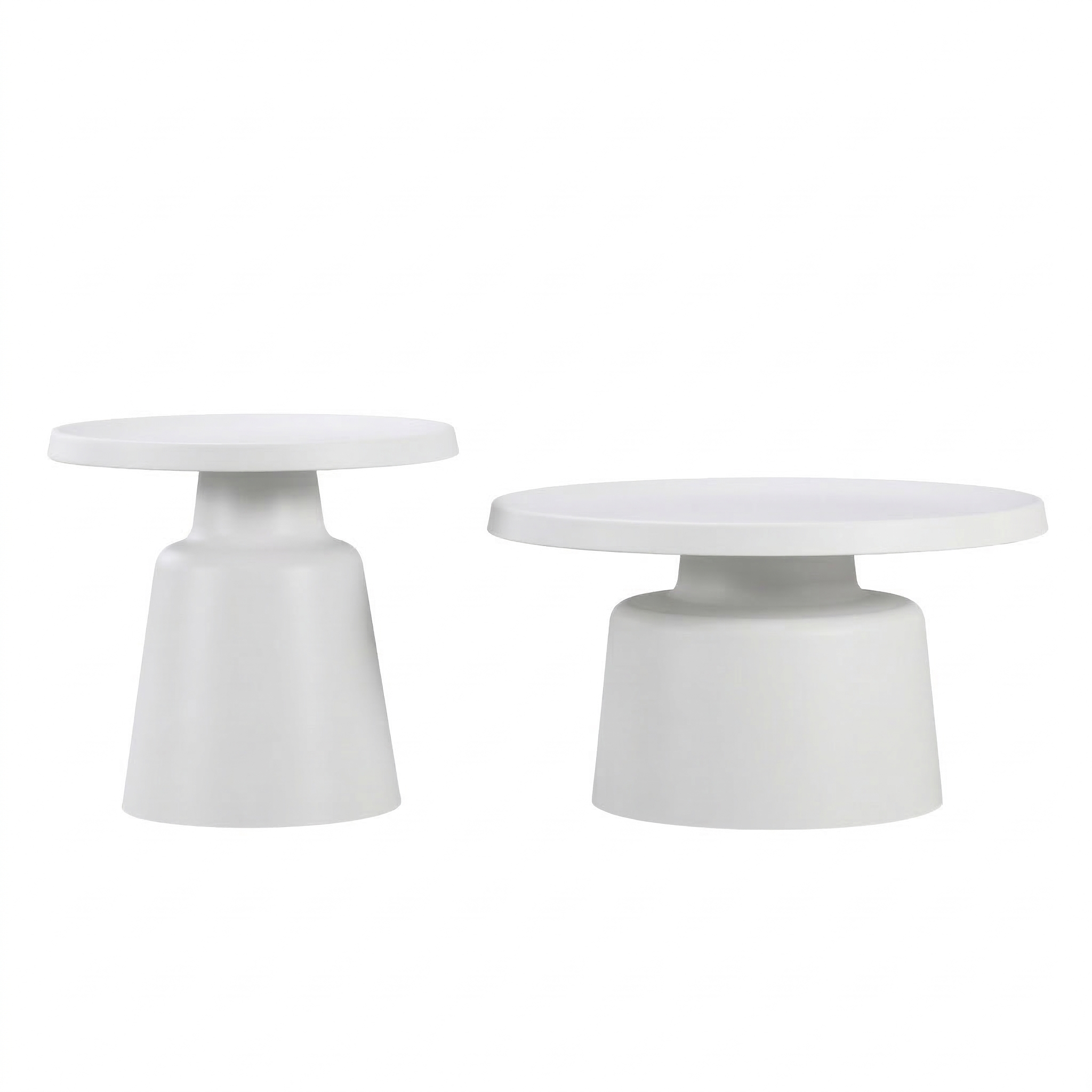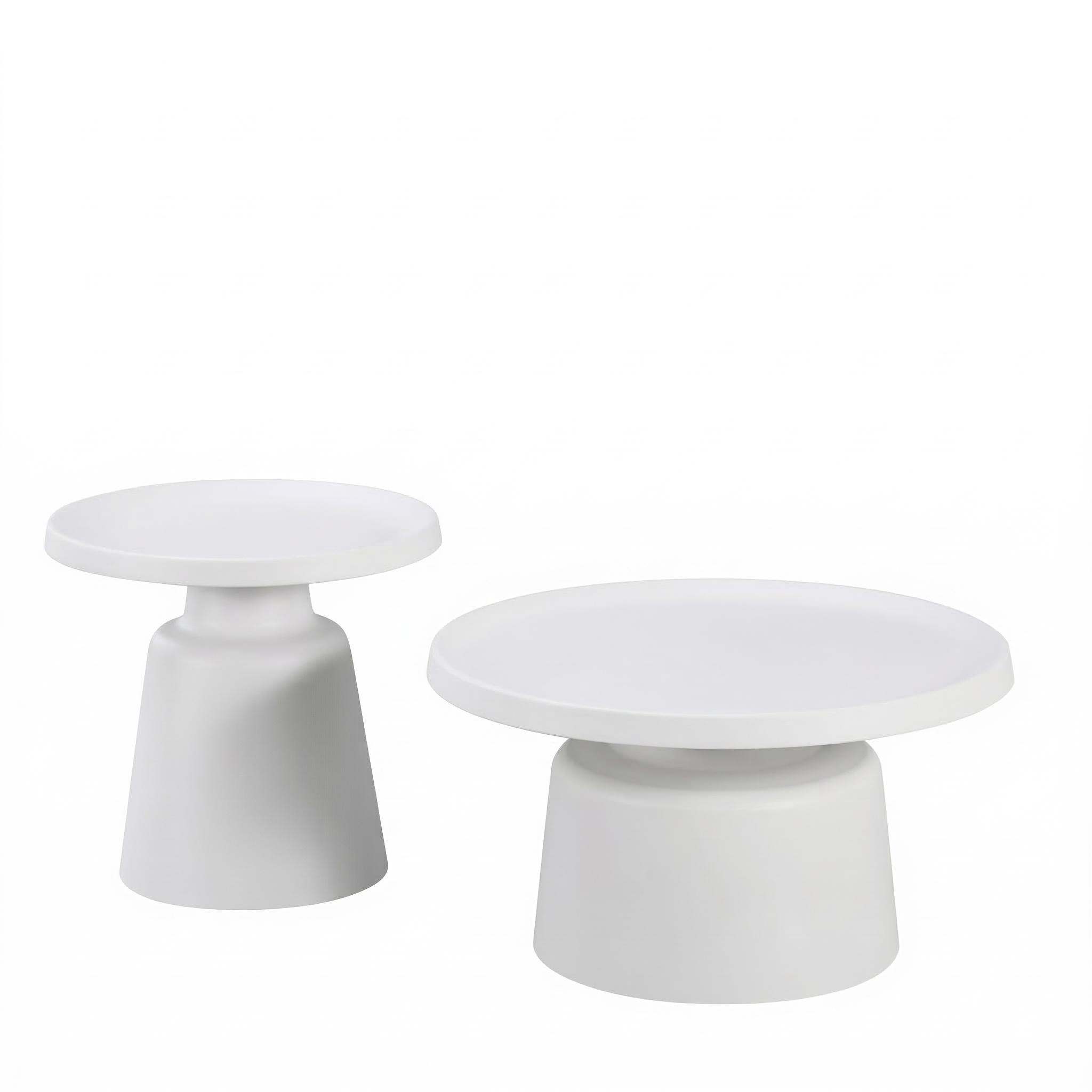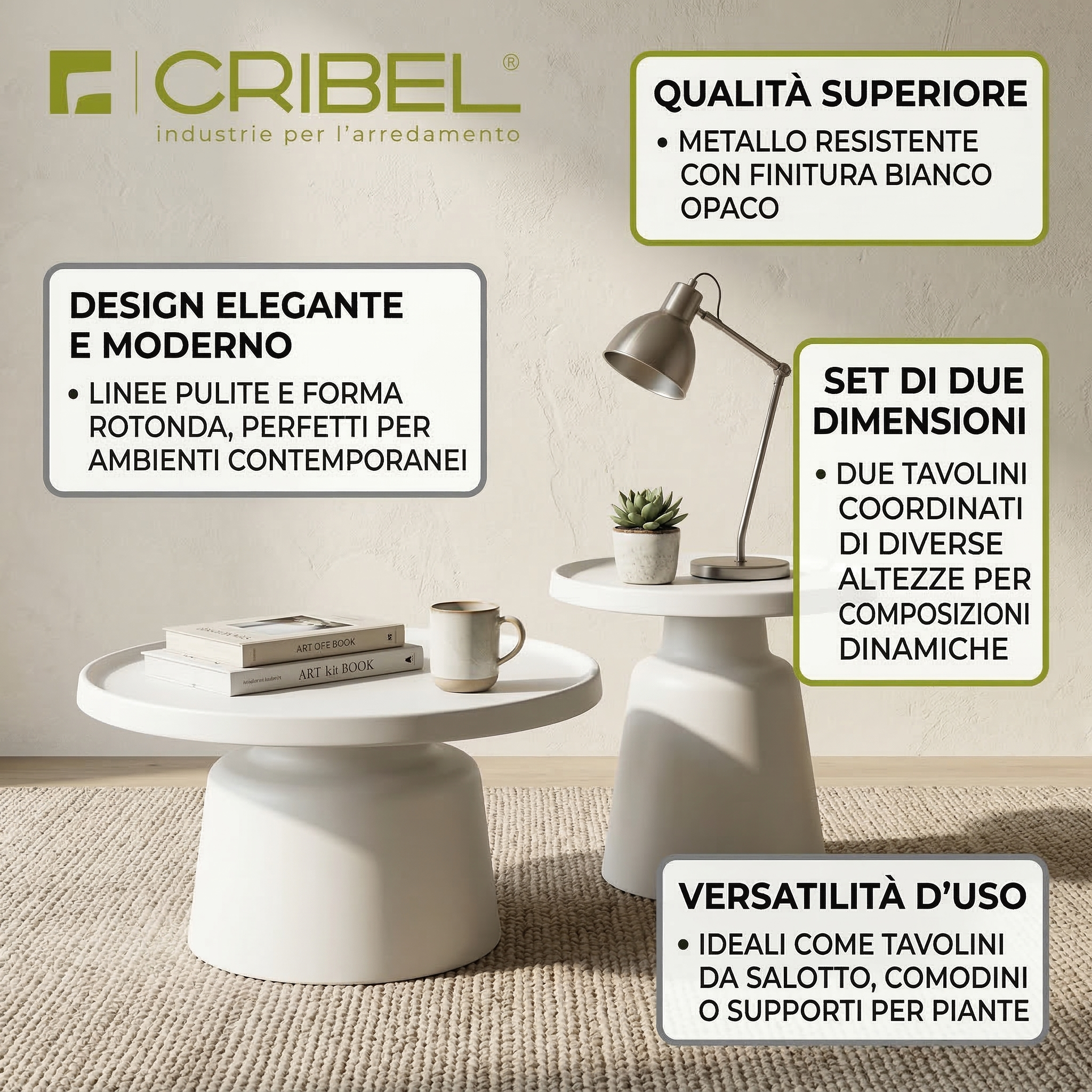 Il set tavolini Altea Cribel è composto da due tavolini dal design moderno ed elegante, interamente realizzati in metallo con finitura nera opaca o bianca. Le forme semplici e geometriche si distinguono per il piano superiore rotondo e la base a tronco di cono rovesciato, creando un effetto visivo armonioso e raffinato.