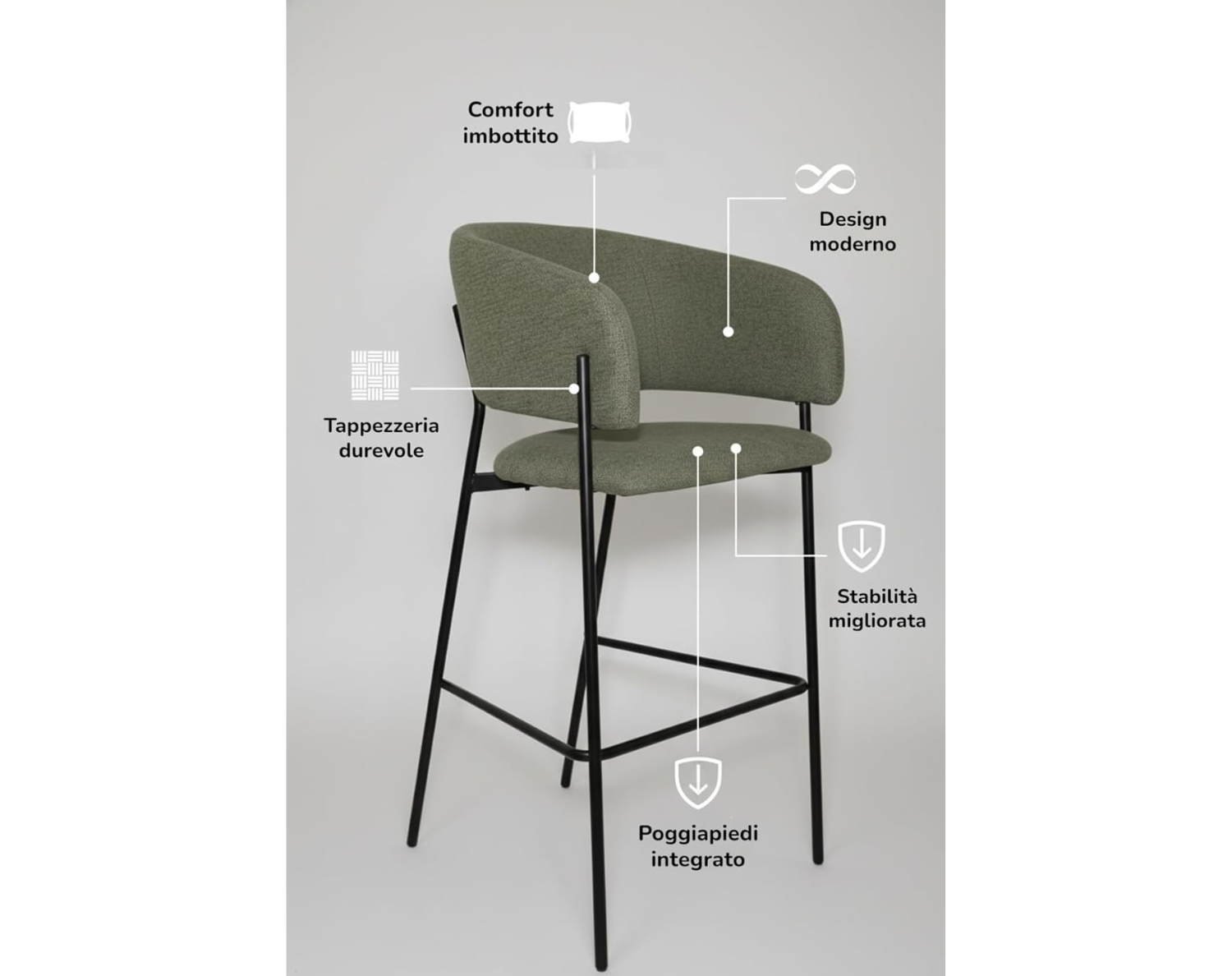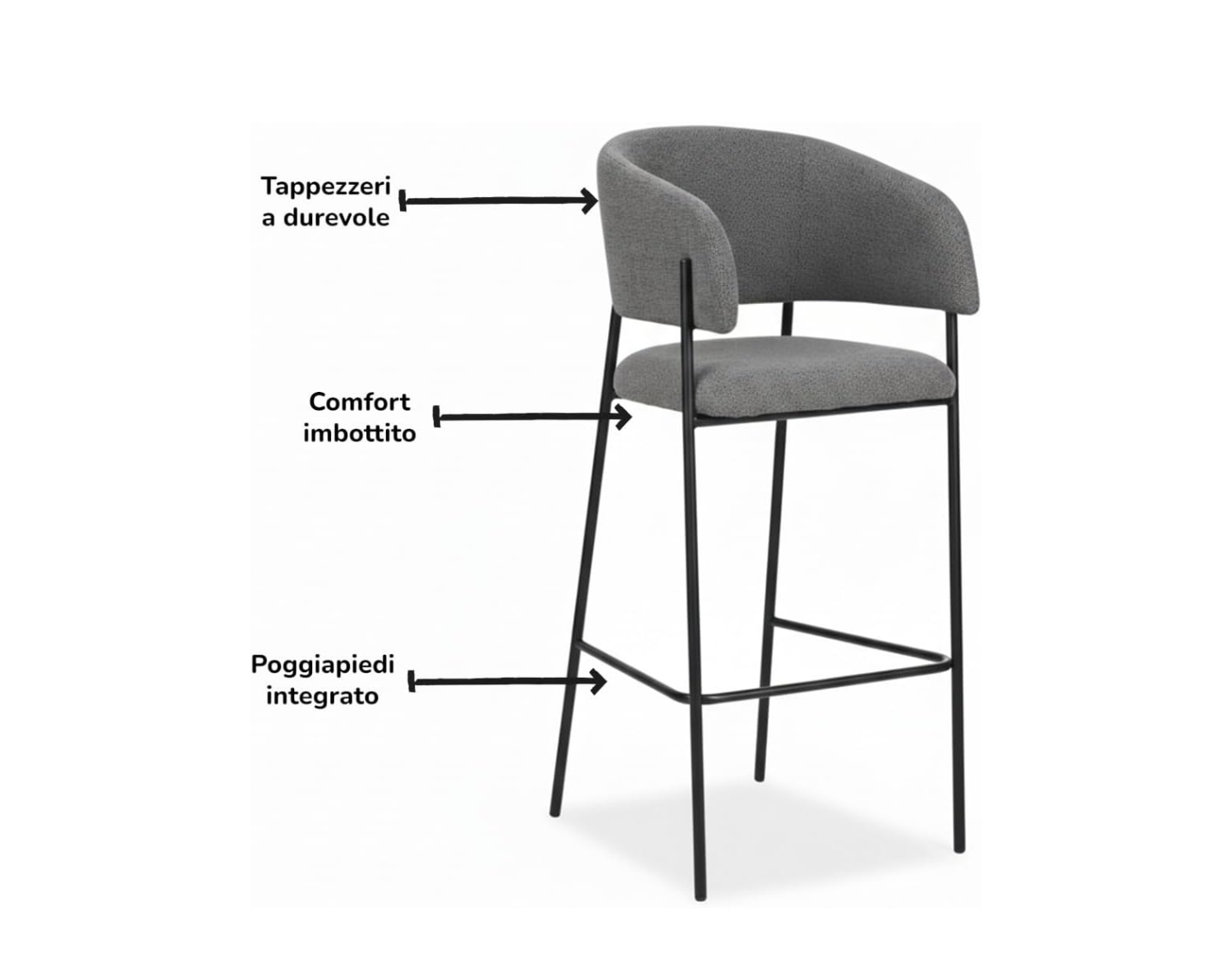 La struttura slanciata in metallo verniciato nero opaco dona stabilità e leggerezza visiva, mentre il pratico poggiapiedi integrato assicura un comfort ottimale anche durante sedute prolungate. Elegante e funzionale, è ideale per completare spazi moderni con stile.