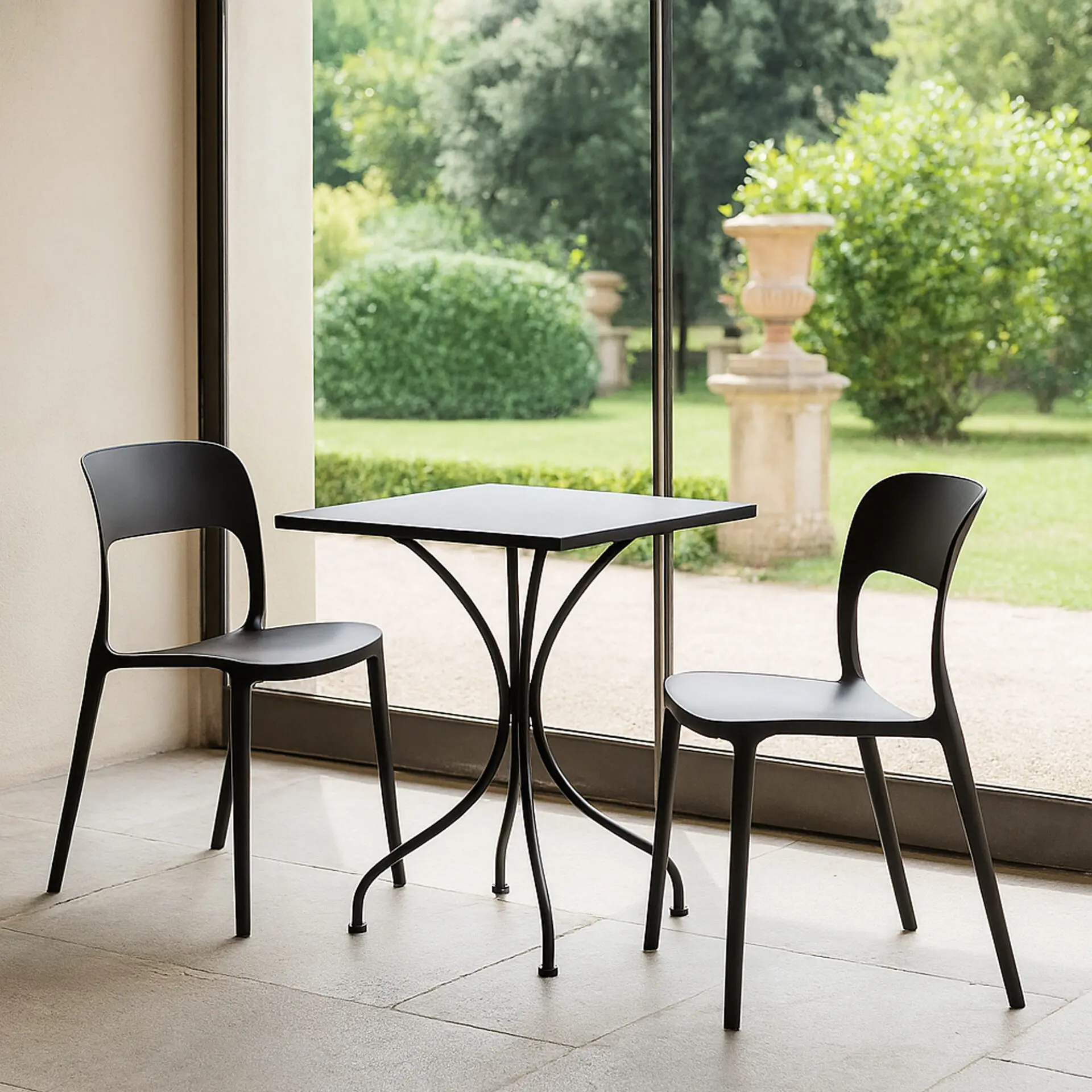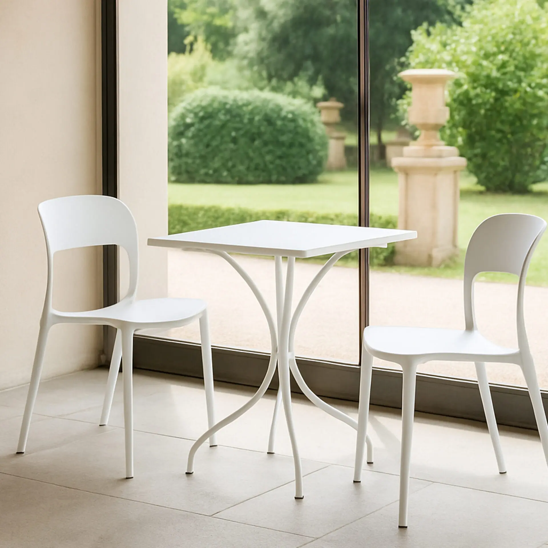Le gambe si uniscono al centro e si aprono verso la base, creando un look unico che valorizza giardini, terrazze, balconi, cucine e sale da pranzo. Disponibile nei colori nero e bianco, si integra facilmente con diversi stili di arredamento.