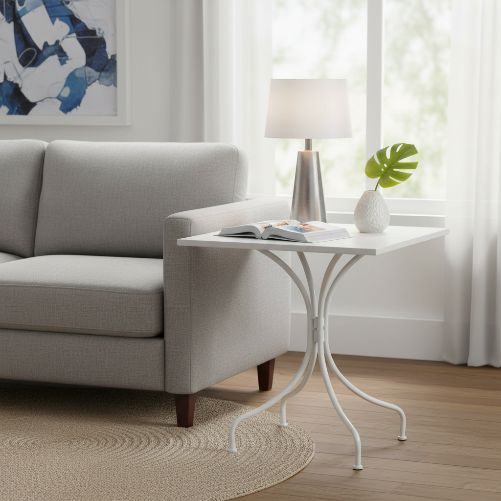 Tavolo moderno in metallo adatto per interno ed esterno, con design elegante e struttura stabile, ideale per casa, giardino e terrazzo.