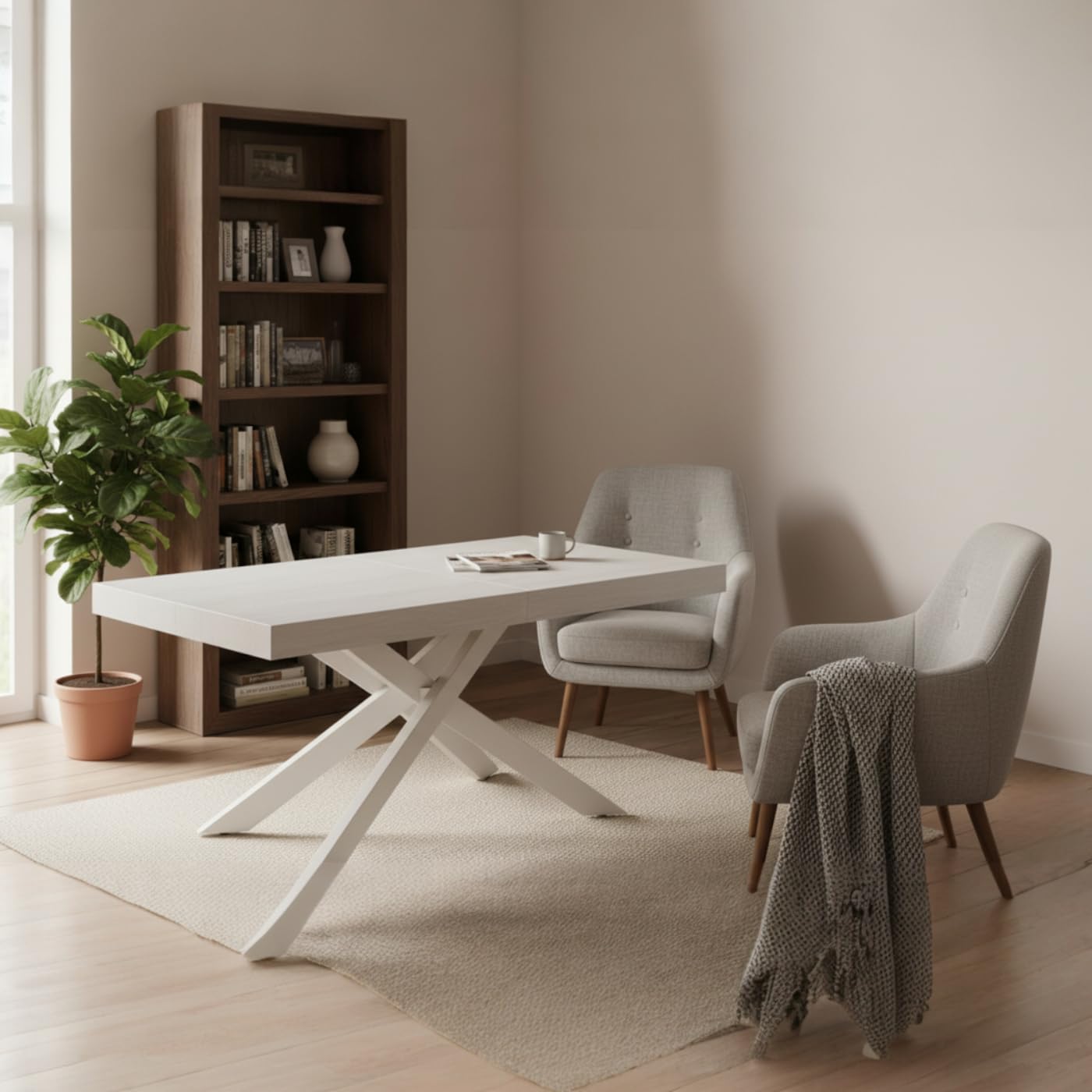 Tavolo allungabile dal design moderno ed elegante, ideale per soggiorni, cucine e sale da pranzo contemporanee. Il piano in legno bianco dona luminosità e stile, mentre le gambe incrociate in metallo assicurano stabilità e un look raffinato. Grazie al pratico meccanismo allungabile, il tavolo si estende da 160 cm fino a 240 cm, offrendo spazio per ospitare fino a 10 persone. Materiali di alta qualità e superficie facile da pulire rendono questo tavolo funzionale e durevole nel tempo.