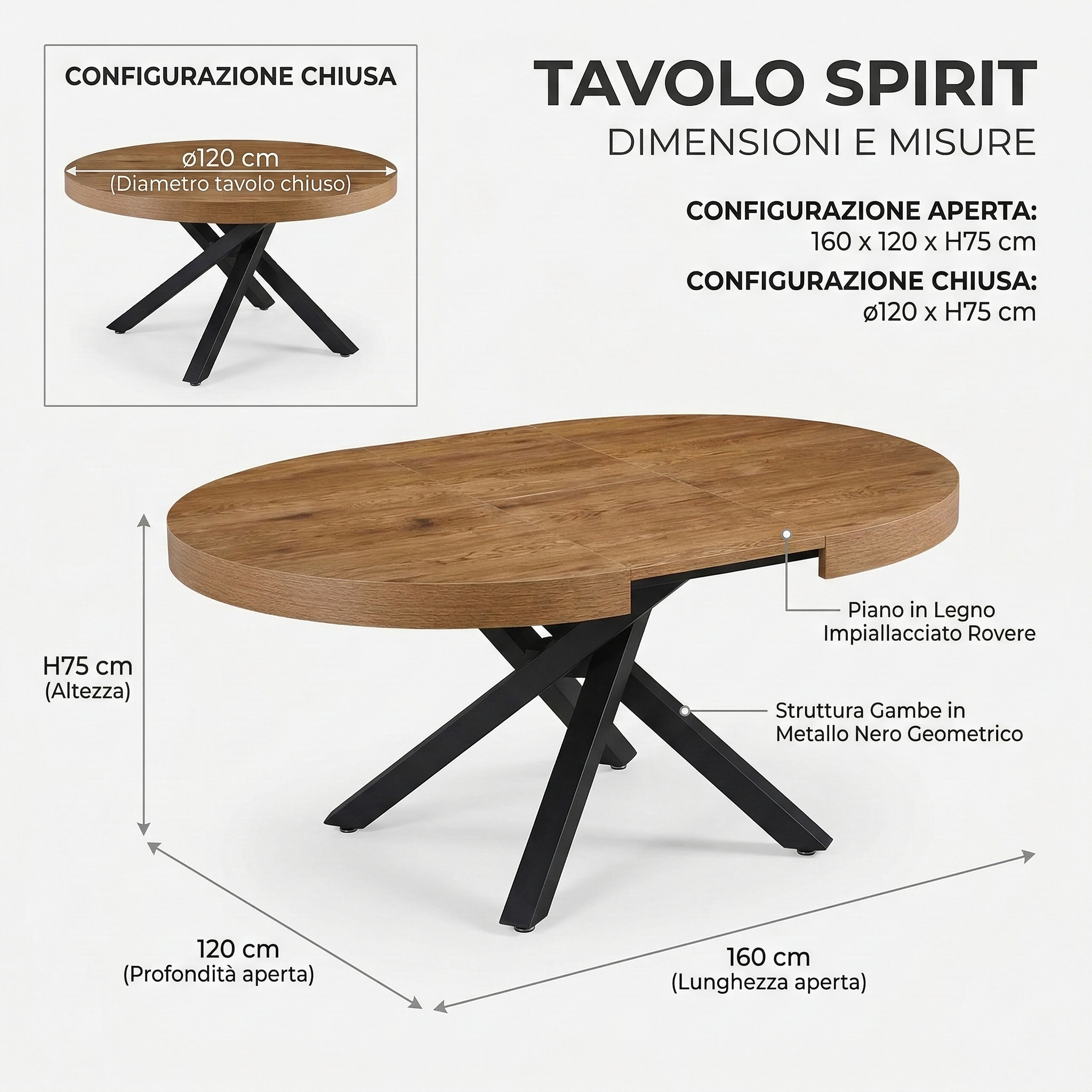 Grazie al pratico meccanismo di estensione, può ospitare comodamente fino a 8 persone da chiuso e fino a 10 da aperto, offrendo funzionalità e stile per ogni occasione.
