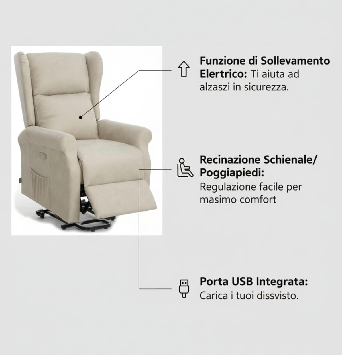 • Funzione: Reclinabile elettrica con sistema alzapersona
