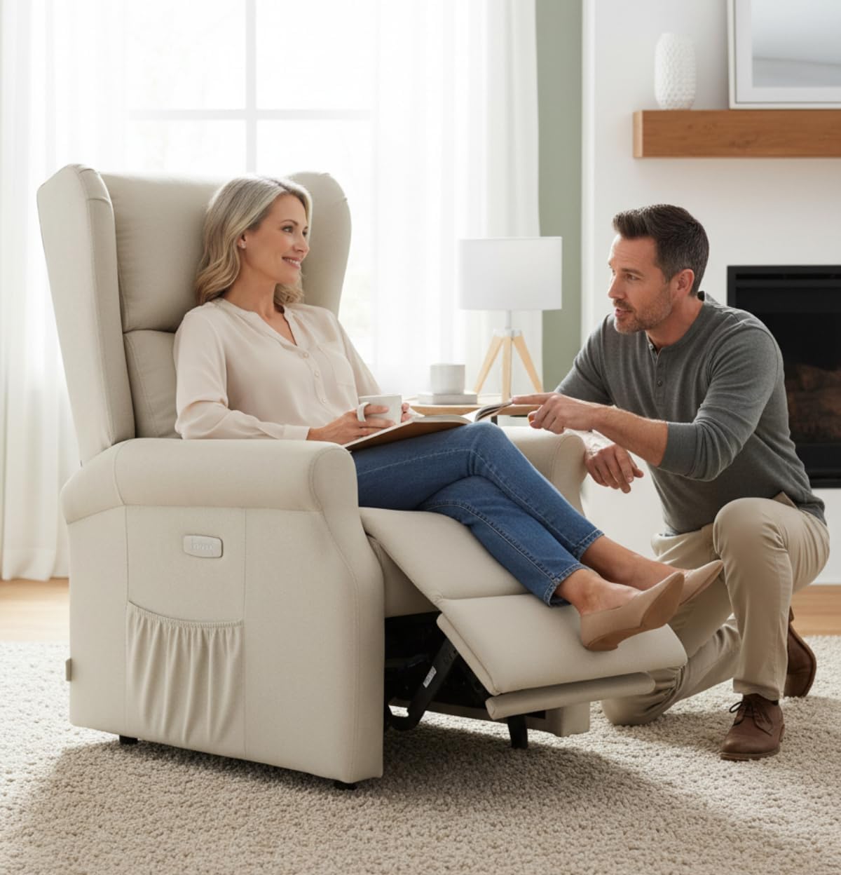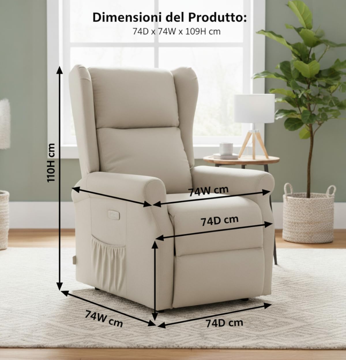 La poltrona include anche una porta USB integrata per ricaricare dispositivi mentre ci si rilassa. Il rivestimento in tessuto Mozart dona un aspetto caldo ed elegante, adattandosi facilmente a diversi stili di arredamento.