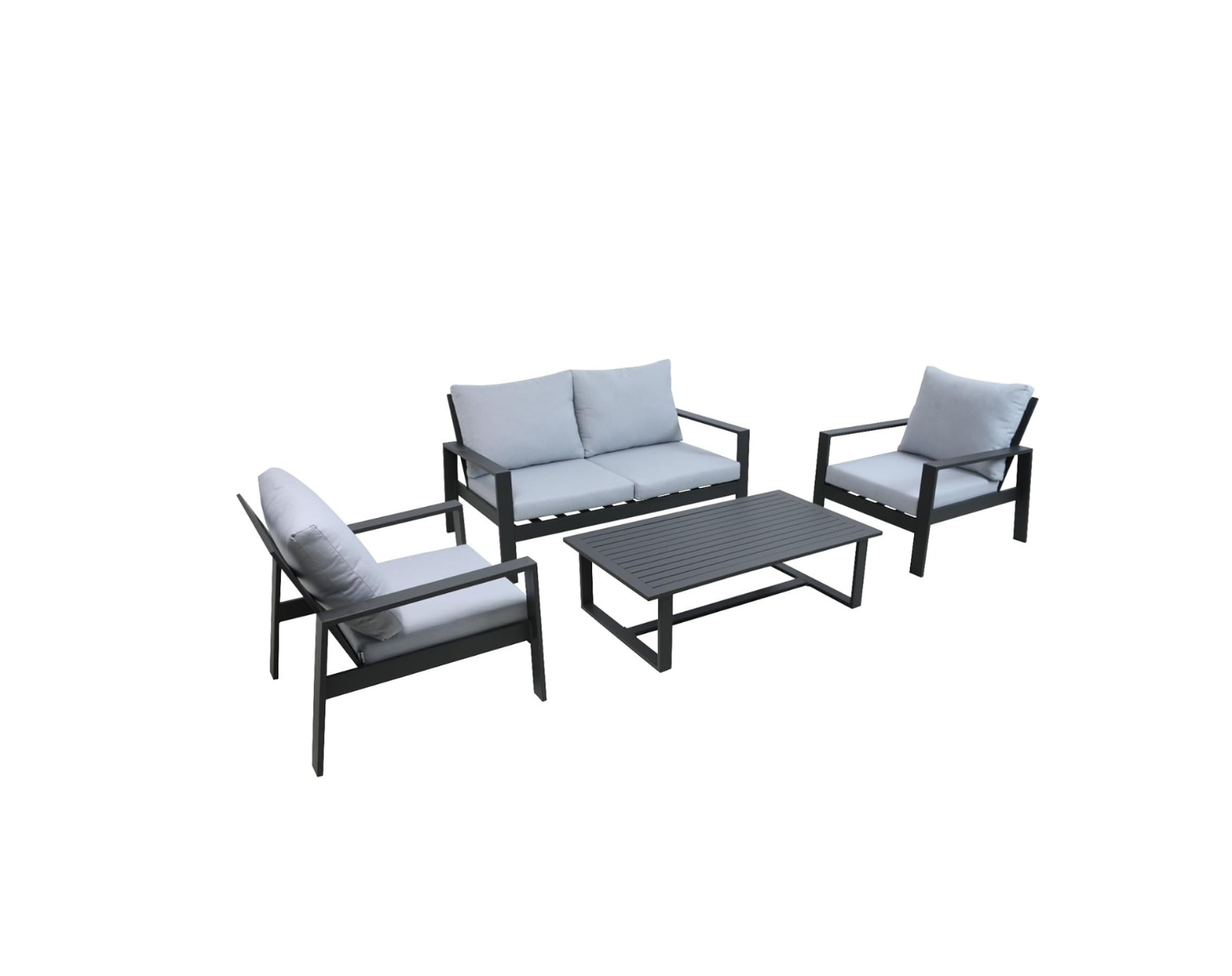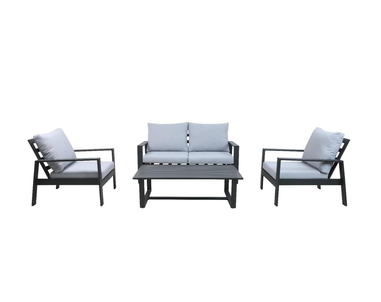 The Libbon outdoor lounge set by Cribel in anthracite gray is the ideal solution for elegantly furnishing gardens, terraces, and outdoor spaces. The set includes a sofa, two armchairs, and a coffee table with an anthracite gray aluminum frame, designed to ensure weather resistance and longevity.