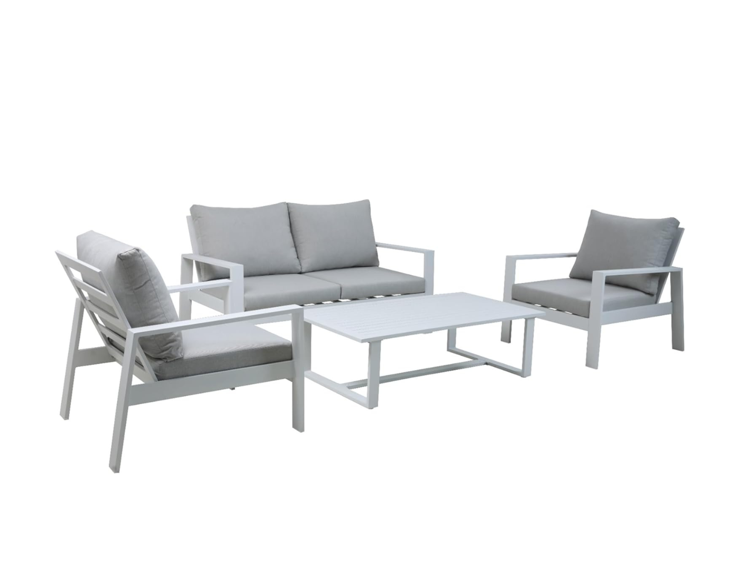 The Libbon outdoor lounge set by Cribel is the ideal solution for stylishly furnishing gardens, terraces, and outdoor spaces. The set includes a sofa, two armchairs, and a coffee table with an aluminum frame, designed to ensure weather resistance and longevity. The included cushions ensure comfort and a cozy feel, making this the perfect relaxation area for outdoor gatherings. The modern, linear design easily integrates into contemporary settings, offering elegance and functionality.