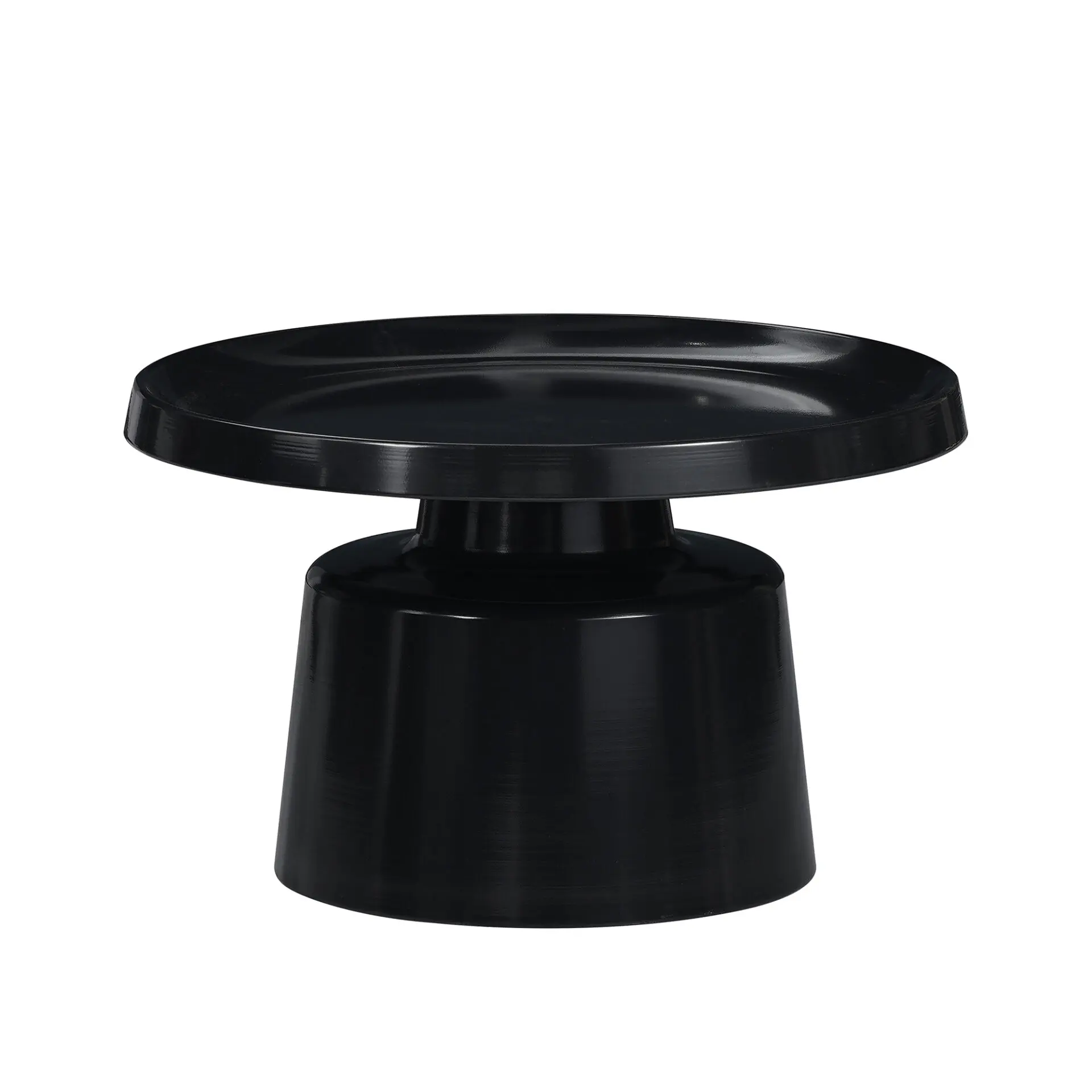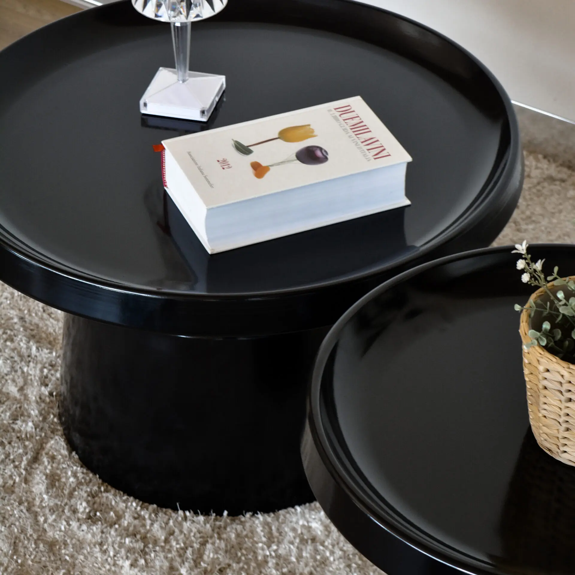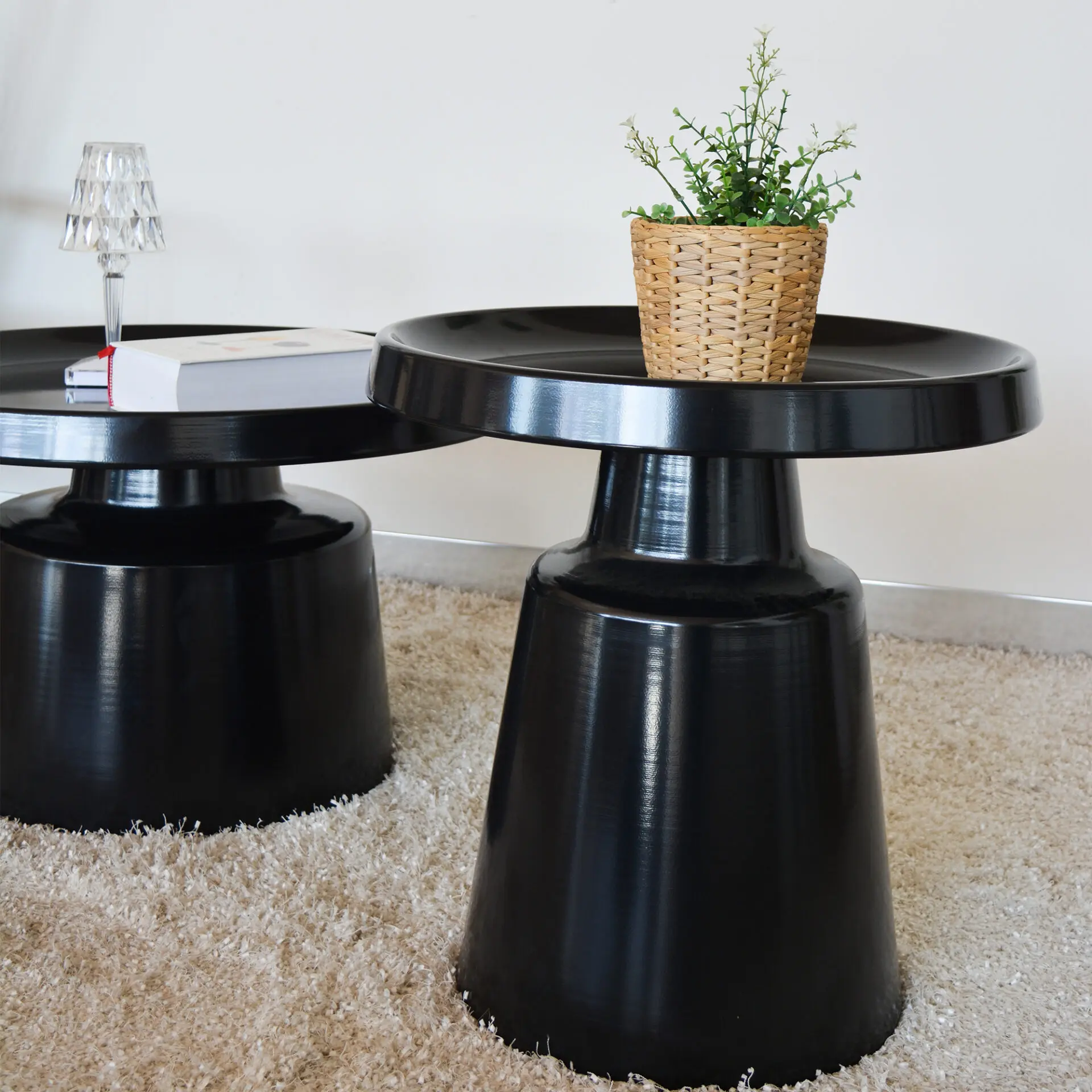 Set di due tavolini rotondi in metallo nero opaco dal design moderno, perfetti per soggiorno e studio, utilizzabili insieme o separatamente.
