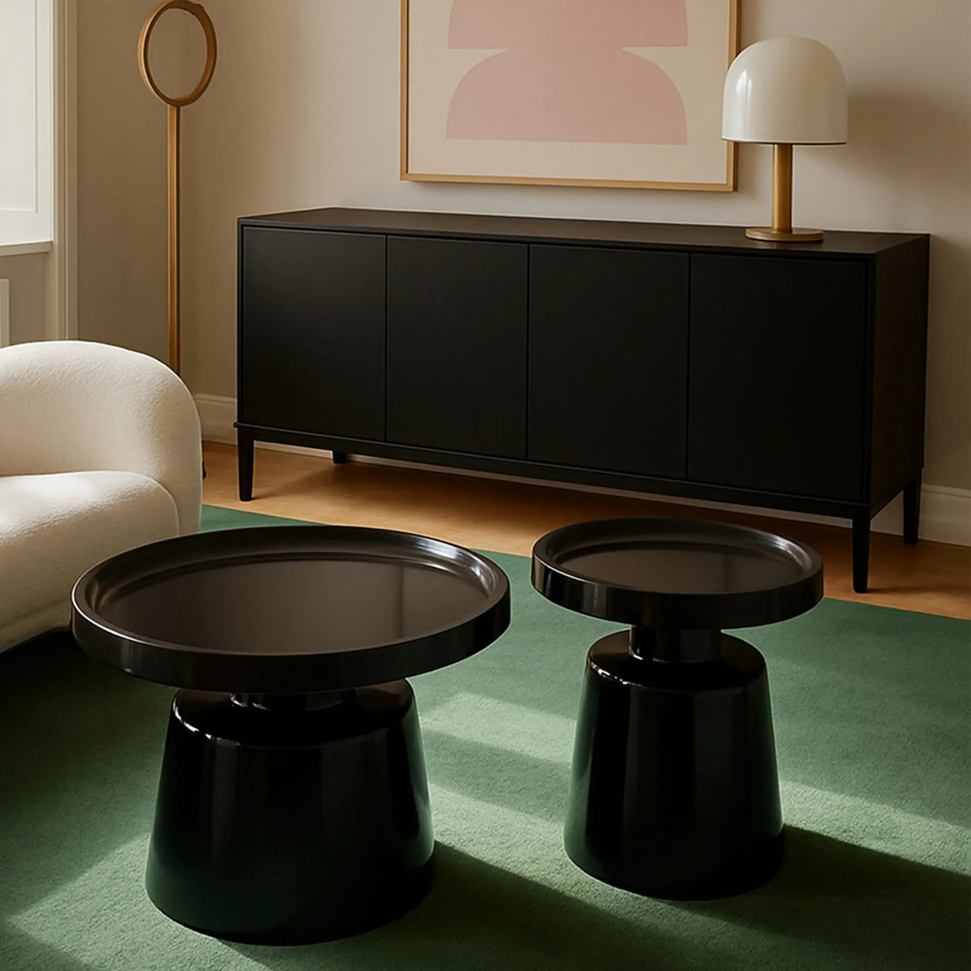 Il set di tavolini CRIBEL Altea in metallo nero opaco unisce design moderno e funzionalità, offrendo una soluzione elegante per arredare soggiorni, studi e ambienti contemporanei. Le linee pulite e la forma rotonda permettono di creare composizioni dinamiche accanto al divano o in diversi punti della casa.