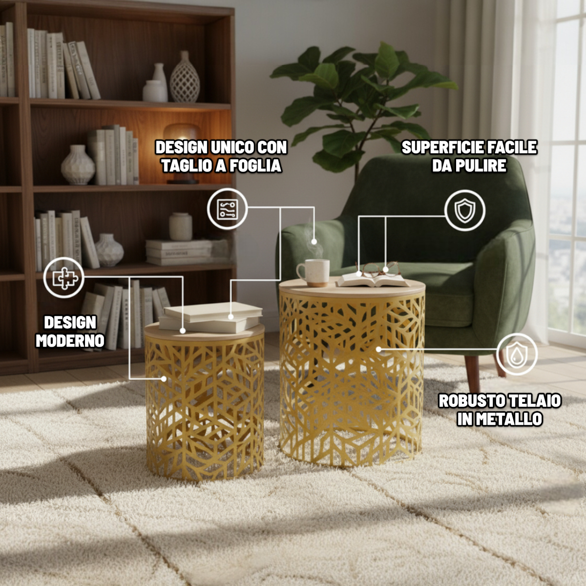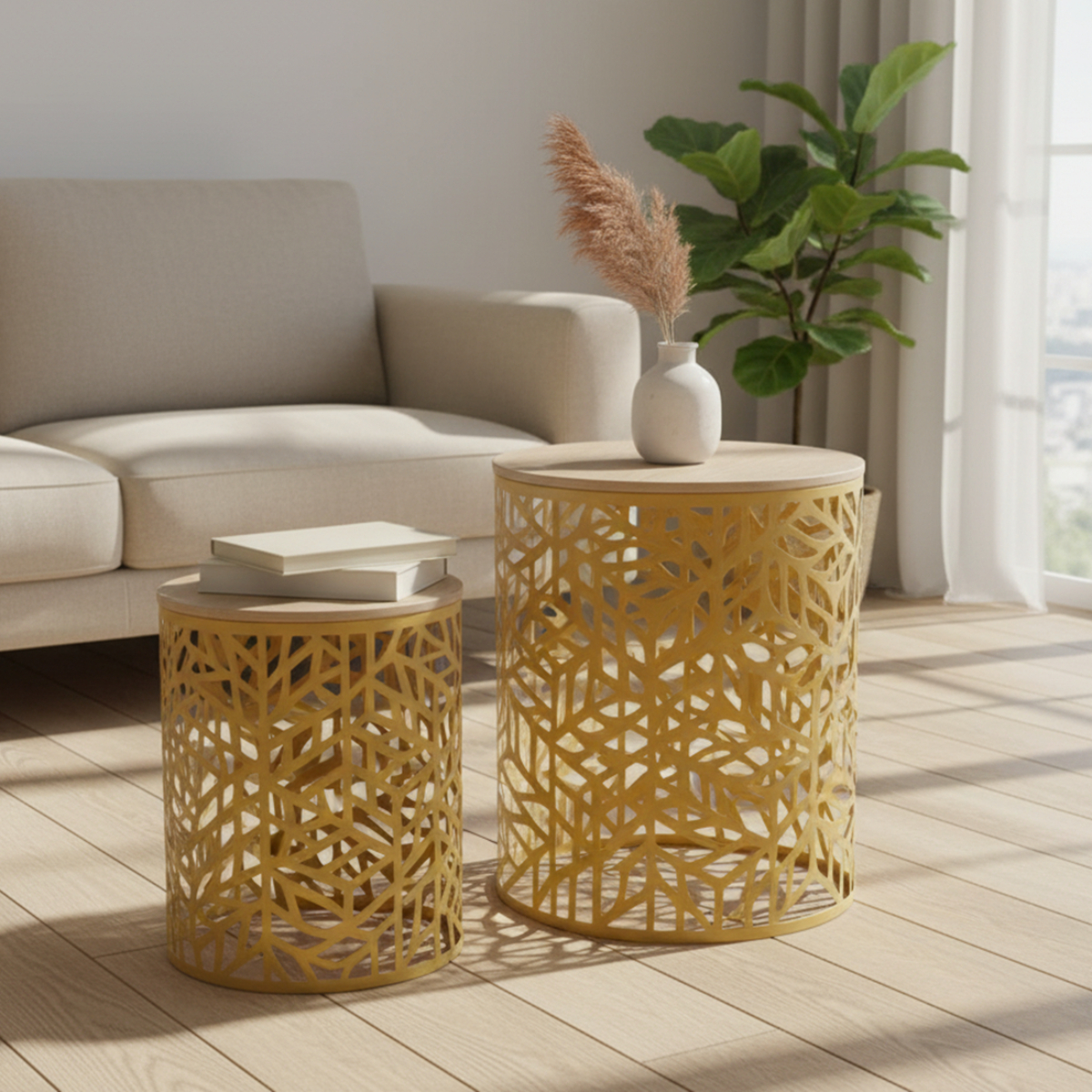 Elegante set di tavolini da caffè con struttura in metallo placcato oro e piano in rovere, perfetto per soggiorno, camera da letto e altri ambienti della casa. I dettagli incisi sul metallo aggiungono un tocco sofisticato, rendendo i tavolini ideali da abbinare a divani o poltrone eleganti e classici, valorizzando lo stile complessivo della stanza.
