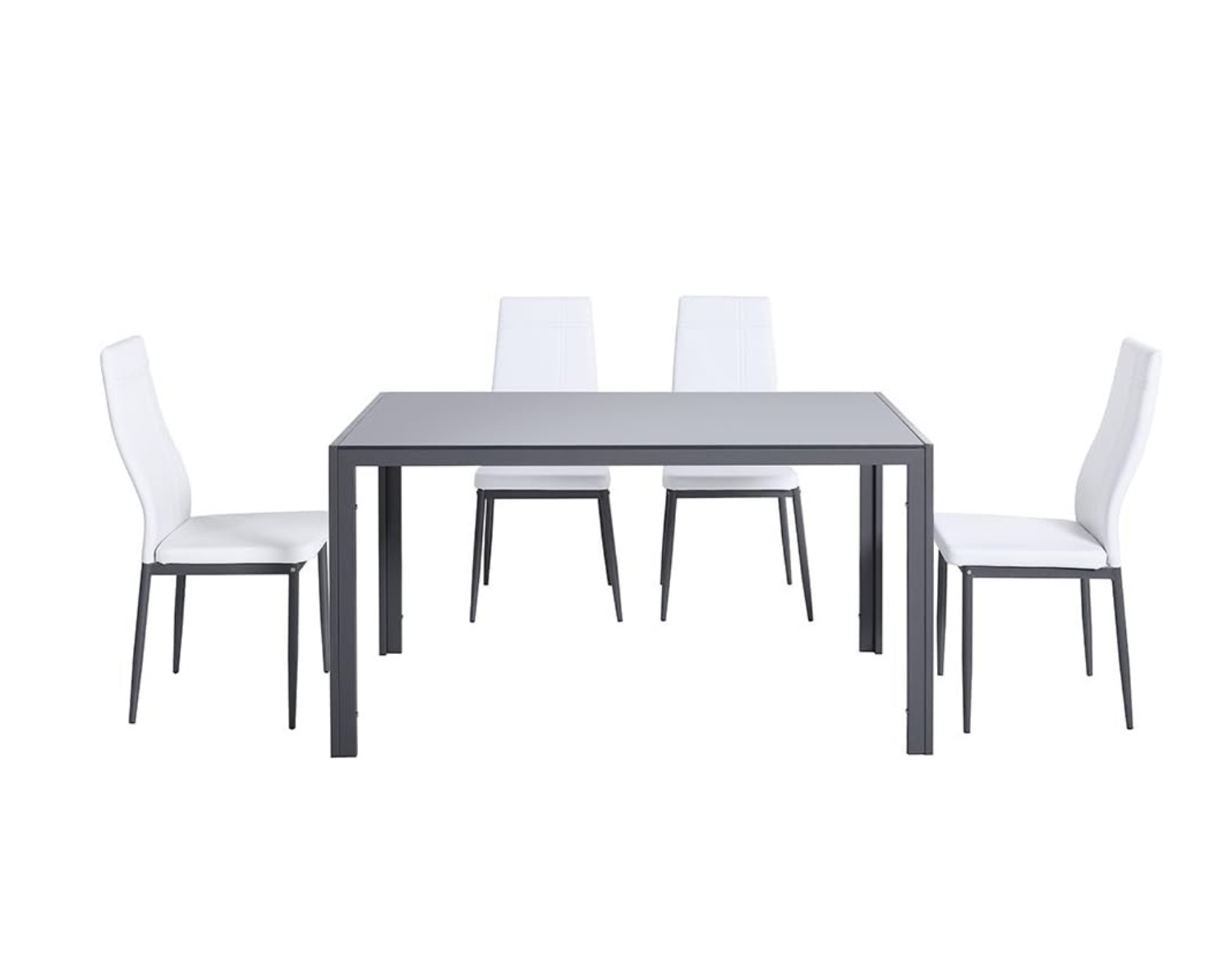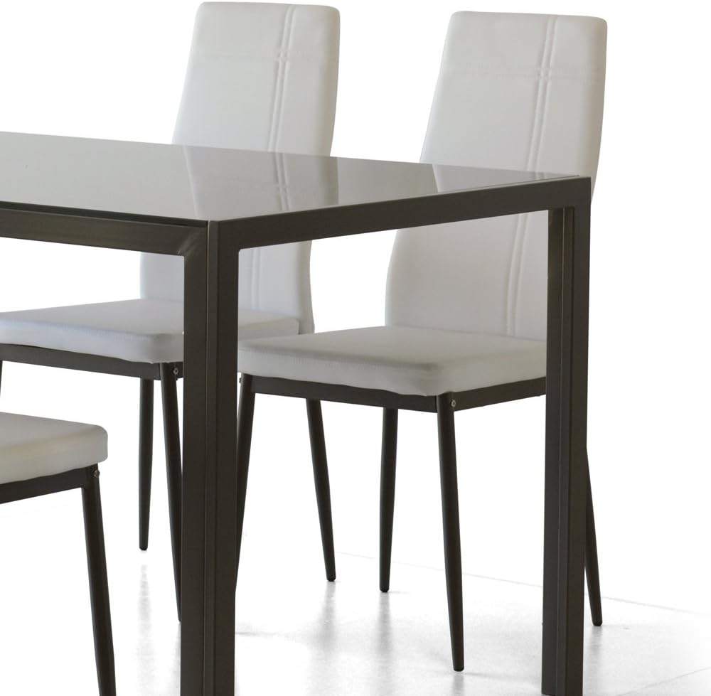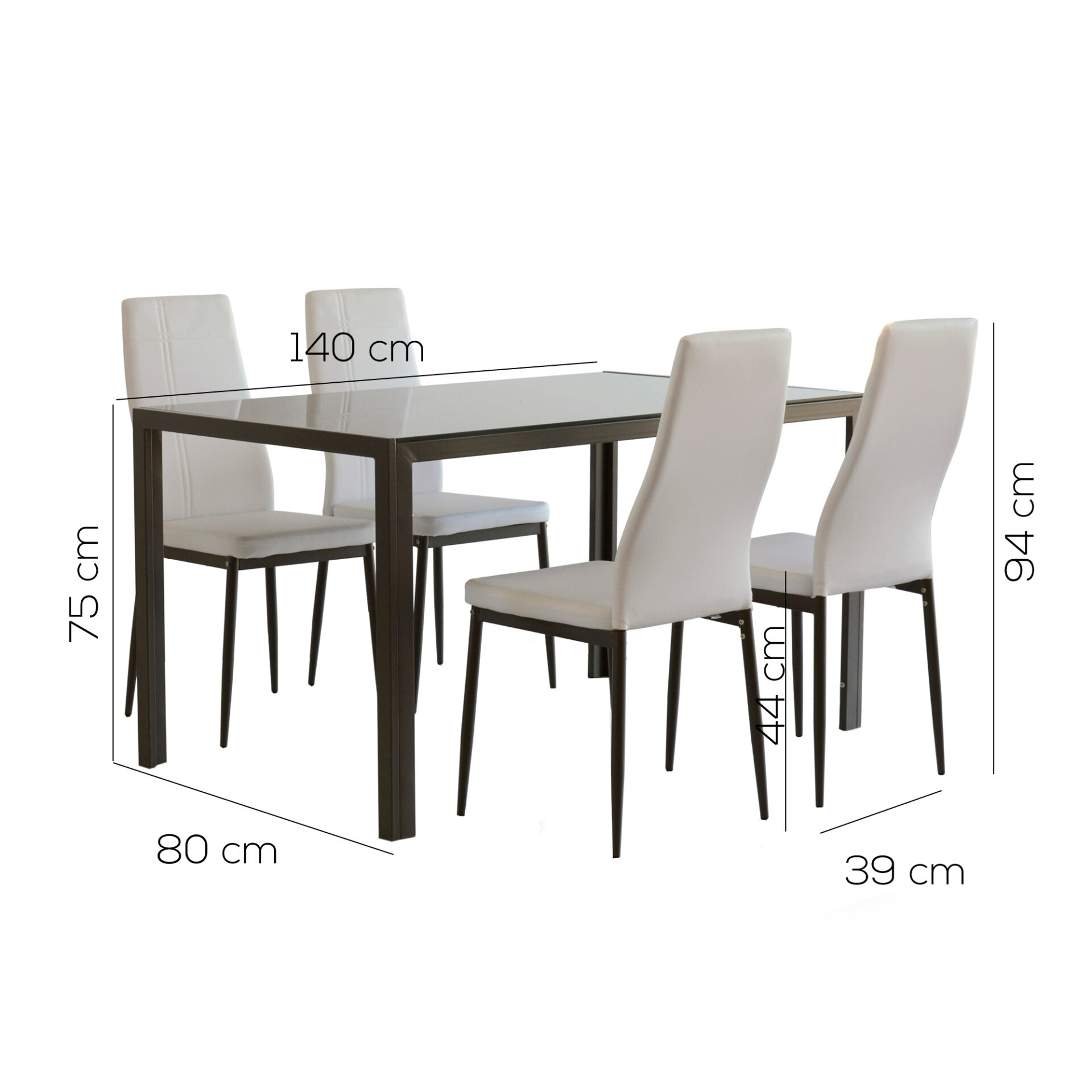 Set Cribel Benny/Jolly unisce eleganza e funzionalità con un design moderno. Il tavolo presenta struttura in metallo verniciato e piano in vetro temperato, mentre le quattro sedie hanno telaio in metallo con seduta e schienale imbottiti in poliuretano e rivestimento in similpelle. Perfetto per soggiorno, sala da pranzo o cucina, offre comfort e stile in ogni occasione.