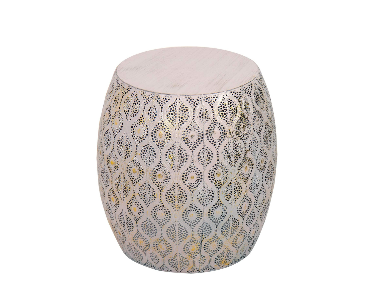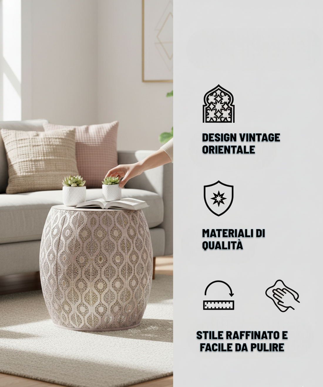 Tavolino da caffè Cribel Lesha unisce design orientale vintage ed eleganza moderna. Realizzato in metallo con finitura rosa antico e oro, presenta un piano liscio e bordi intagliati traforati, perfetto per aggiungere un tocco raffinato al soggiorno. Ideale come tavolino basso, tavolino da caffè o complemento accanto al divano, combina stile decorativo e funzionalità.