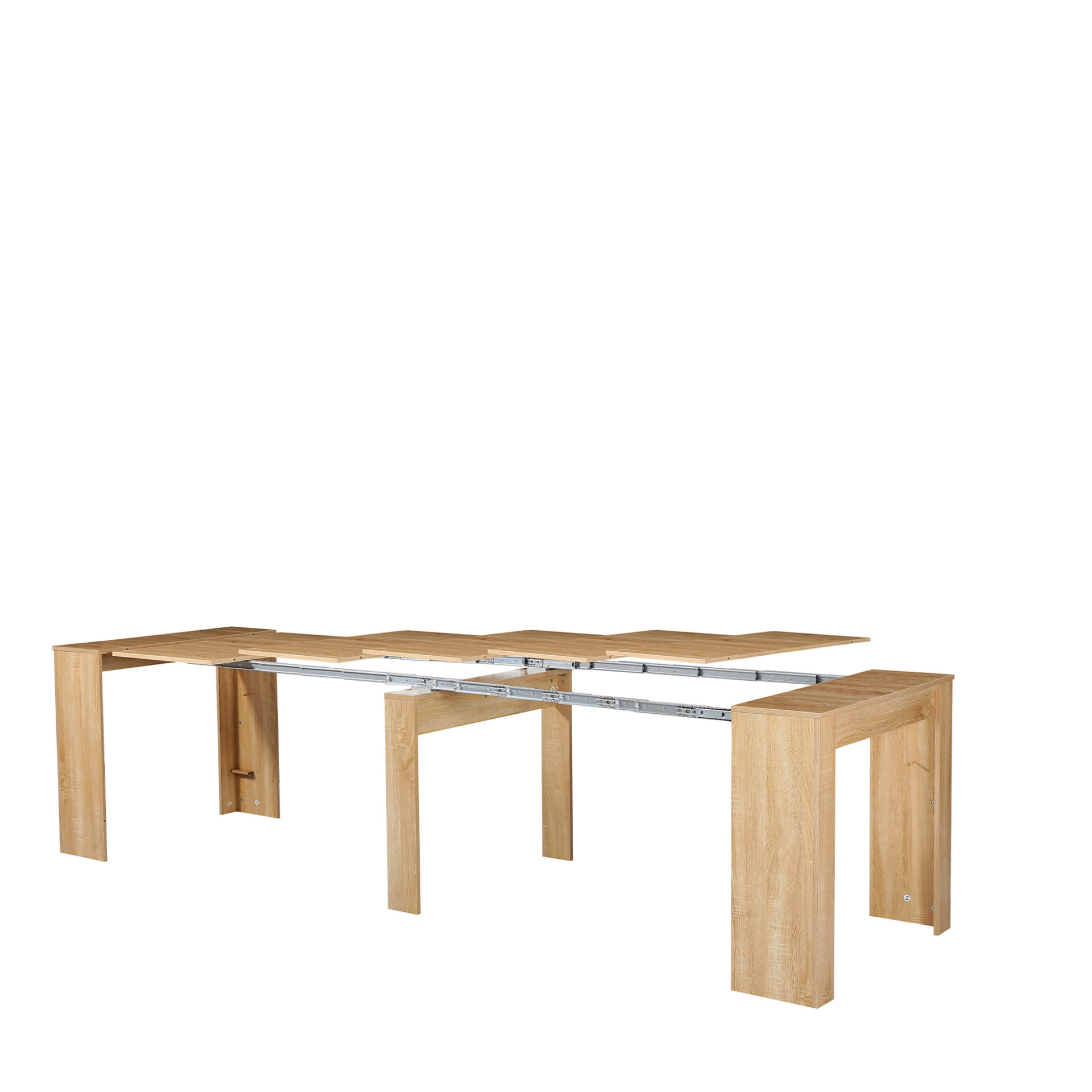 Tavolo consolle allungabile Cribel Artic con finitura effetto faggio nocciola, design moderno ed elegante, perfetto per soggiorni, cucine o sale da pranzo contemporanee. Il tavolo si estende facilmente da 50 cm fino a 300 cm grazie a un meccanismo fluido e sicuro, ospitando fino a 12 persone in totale comfort. Realizzato con pannelli durevoli e finitura di qualità, garantisce resistenza, stabilità e uno stile raffinato. Semplice da assemblare e mantenere, basta un panno umido per pulire la superficie e preservarne la bellezza nel tempo.