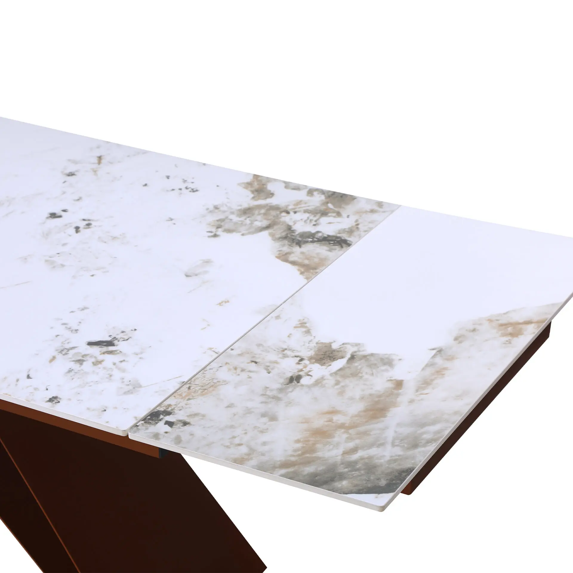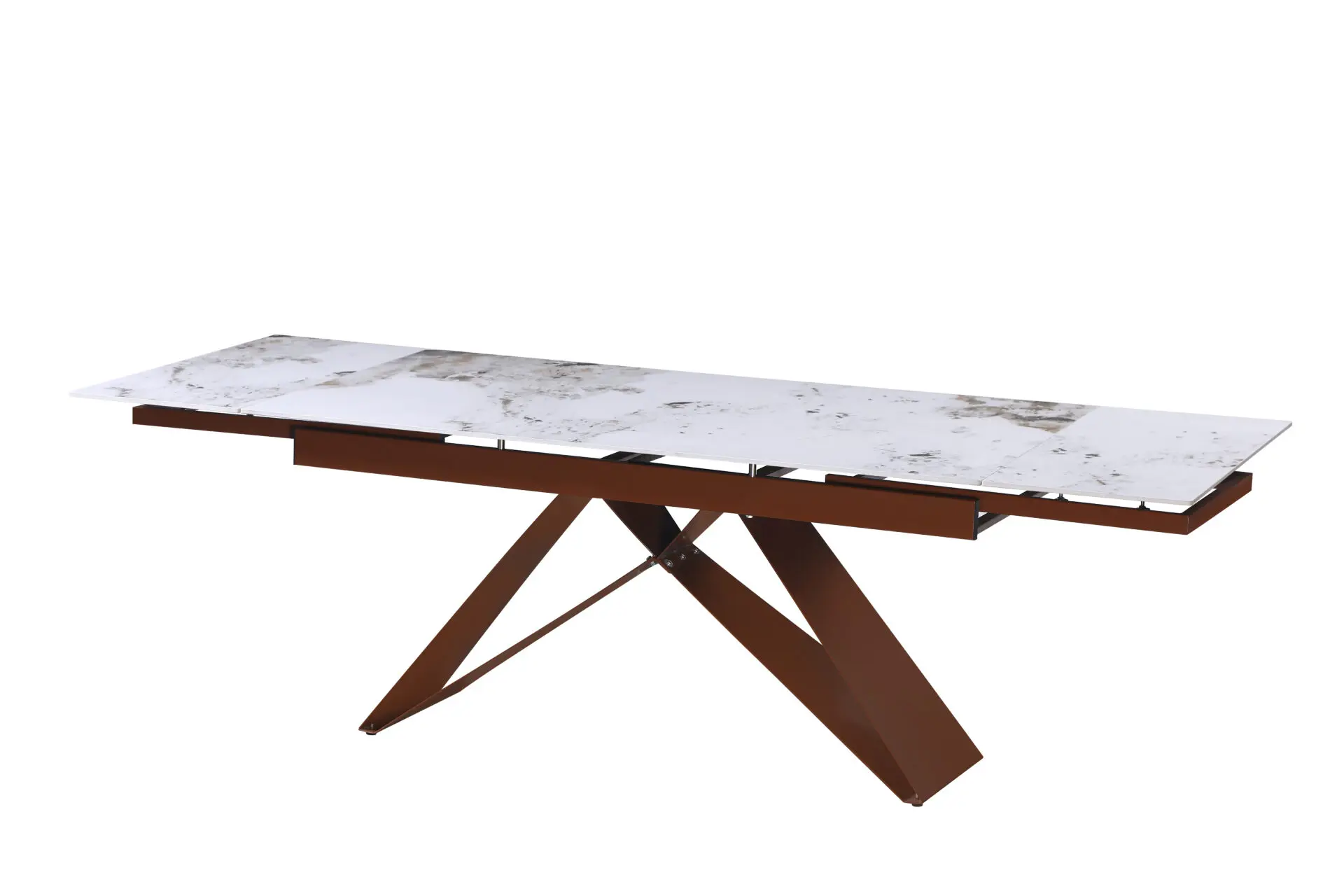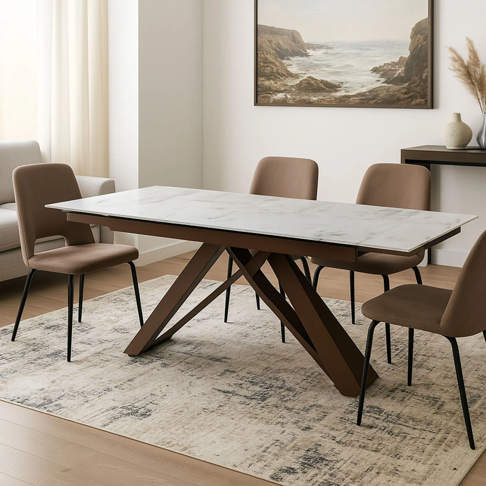 Tavolo estendibile con piano in ceramica effetto Patagonia e gambe in metallo bronzo. Perfetto per ambienti moderni, unisce eleganza, praticità e stabilità, adattandosi a ogni occasione.